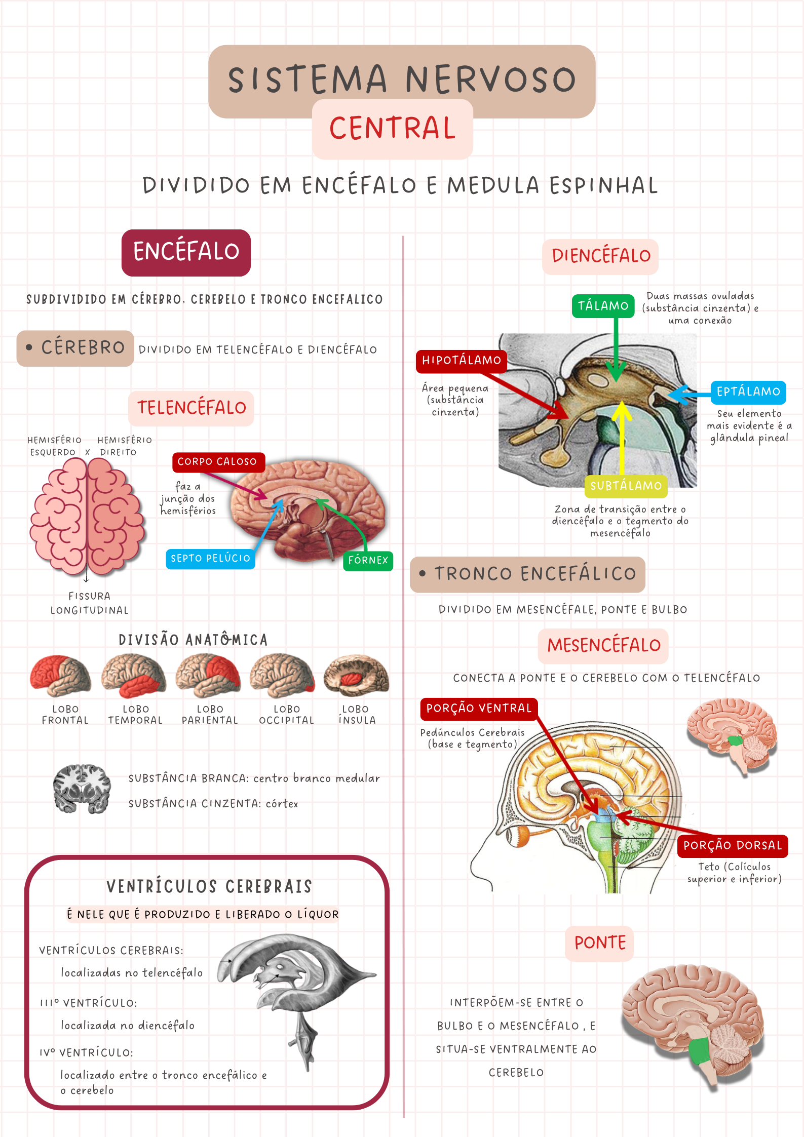 <p>SISTEMA NERVOSO CENTRAL DIVIDIDO EM ENCÉFALO E MEDULA ESPINHAL ENCÉFALO DIENCÉFALO SUBDIVIDIDO EM CÉREBRO. CEREBELO E TRONCO ENCEFALICO Duas massas ovuladas TÁLAMO (substancia cinzenta) e uma conexão CÉREBRO TELENCÉFALO DIENCÉFALO DIVIDIDO EM E HIPOTÁLAMO pequena EPTÁLAMO TELENCÉFALO (substancia cinzenta) Seu elemento mais evidente é a HEMISFÉRIO HEMISFÉRIO glandula pineal ESQUERDO X DIREITO CORPO CALOSO faz a SUBTÁLAMO dos Zona de transição entre o e o tegmento do SEPTO FORNEX TRONCO ENCEFÁLICO FISSURA LONGITUDINAL DIVIDIDO EM PONTE E BULBO DIVISÃO MESENCÉFALO CONECTA A PONTE E o CEREBELO COM TELENCÉFALO LOBO LOBO LOBO LOBO LOBO PORÇÃO VENTRAL FRONTAL TEMPORAL PARIENTAL OCCIPITAL INSULA Pedúnculos Cerebrais (base e SUBSTÂNCIA BRANCA: centro branco medular SUBSTÂNCIA CINZENTA: cortex PORÇÃO DORSAL Teto VENTRÍCULOS CEREBRAIS superior e inferior) É NELE QUE É PRODUZIDO E LIBERADO o LÍQUOR VENTRÍCULOS CEREBRAIS: PONTE localizadas no 111° VENTRÍCULO: ENTRE o localizada no BULBO E o MESENCÉFALO E IV° VENTRÍCULO: SITUA-SE VENTRALMENTE AO localizado entre o tronco encefálico e CEREBELO o cerebelo</p>