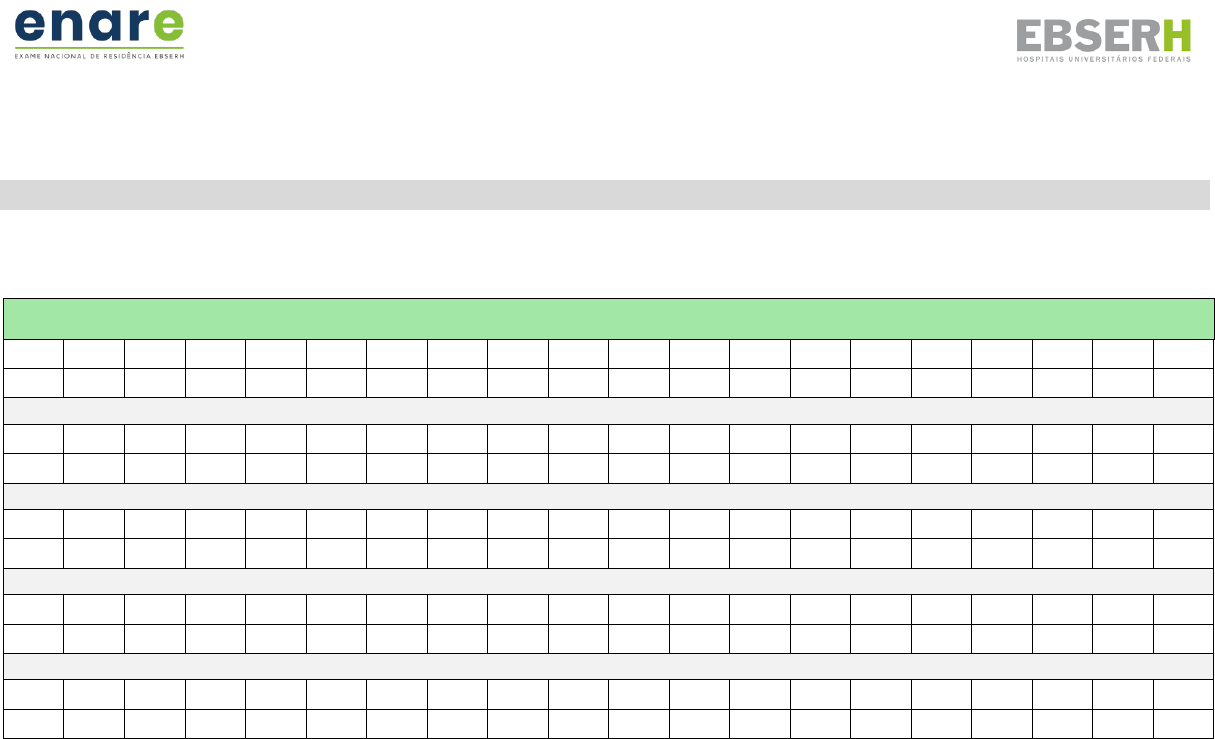 <p>EXAME NACIONAL DE RESIDÊNCIA EBSERH</p><p>EDITAL Nº 03/2020 – RESIDÊNCIA MÉDICA REDE EBSERH 2020/2021</p><p>GABARITO PÓS-RECURSOS – MANHÃ</p><p>PRM - ACESSO DIRETO - PROVA 1</p><p>1 2 3 4 5 6 7 8 9 10 11 12 13 14 15 16 17 18 19 20</p><p>D X A B D C E C B A X C E B A C D E B X</p><p>21 22 23 24 25 26 27 28 29 30 31 32 33 34 35 36 37 38 39 40</p><p>C A B E E D E C D C C A E X B D D E B X</p><p>41 42 43 44 45 46 47 48 49 50 51 52 53 54 55 56 57 58 59 60</p><p>D D B C E A A C B C E E A E D X A B D C</p><p>61 62 63 64 65 66 67 68 69 70 71 72 73 74 75 76 77 78 79 80</p><p>A X A X E D C A C D A B D E E C B B D E</p><p>81 82 83 84 85 86 87 88 89 90 91 92 93 94 95 96 97 98 99 100</p><p>C A D E B C B X C C D E D B E A C B D E</p><p>MINISTÉRIO DA EDUCAÇÃO</p><p>EXAME NACIONAL DE RESIDÊNCIA EBSERH</p><p>Página 13 de 23</p><p>PRM PRÉ REQUISITO E ANO ADICIONAL - CIRURGIA DO APARELHO DIGESTIVO - CIRURGIA PLÁSTICA -</p><p>CIRURGIA GERAL - CIRURGIA VASCULAR - COLOPROCTOLOGIA - UROLOGIA - PROVA 4</p><p>1 2 3 4 5 6 7 8 9 10 11 12 13 14 15 16 17 18 19 20</p><p>D D C B B B B C B D B C B B A D A D B C</p><p>21 22 23 24 25 26 27 28 29 30 31 32 33 34 35 36 37 38 39 40</p><p>C C C D B C D B B A C D C C E E B C A C</p><p>41 42 43 44 45 46 47 48 49 50 51 52 53 54 55 56 57 58 59 60</p><p>B E E D C E A C X X A E C D C D X D C B</p><p>61 62 63 64 65 66 67 68 69 70 71 72 73 74 75 76 77 78 79 80</p><p>A A C A E C E E C E E C B A B B B A B C</p><p>PRM PRÉ-REQUISITO - CANCEROLOGIA CLÍNICA - CARDIOLOGIA - ENDOCRINOLOGIA E METABOLOGIA -</p><p>GASTROENTEROLOGIA - GERIATRIA - NEFROLOGIA - PNEUMOLOGIA - REUMATOLOGIA - PROVA 1</p><p>1 2 3 4 5 6 7 8 9 10 11 12 13 14 15 16 17 18 19 20</p><p>A E A A X D E B A C A B D A C D B B C C</p><p>21 22 23 24 25 26 27 28 29 30 31 32 33 34 35 36 37 38 39 40</p><p>C C C D B E C C A B A E E D D C E C E C</p><p>41 42 43 44 45 46 47 48 49 50 51 52 53 54 55 56 57 58 59 60</p><p>E C B D B A A X B D A A D X B B E C A A</p><p>61 62 63 64 65 66 67 68 69 70 71 72 73 74 75 76 77 78 79 80</p><p>B A B E D B A D B A C D D A A C D C A C</p>