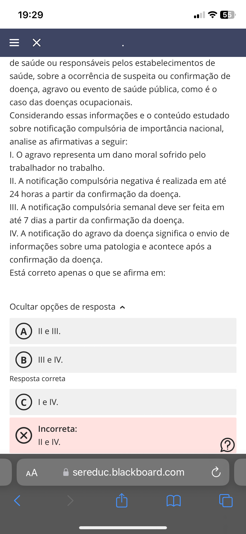 <p>19:29 55 X de saúde ou responsáveis pelos estabelecimentos de saúde, sobre a ocorrência de suspeita ou confirmação de doença, agravo ou evento de saúde pública, como é o caso das doenças ocupacionais. Considerando essas informações e o conteúdo estudado sobre notificação compulsória de importância nacional, analise as afirmativas a seguir: I. O agravo representa um dano moral sofrido pelo trabalhador no trabalho. II. A notificação compulsória negativa é realizada em até 24 horas a partir da confirmação da doença. III. A notificação compulsória semanal deve ser feita em até 7 dias a partir da confirmação da doença. IV. A notificação do agravo da doença significa o envio de informações sobre uma patologia e acontece após a confirmação da doença. Está correto apenas o que se afirma em: Ocultar opções de resposta A e III. B III e IV. Resposta correta e IV. Incorreta: e IV. ? AA sereduc.blackboard.com</p>