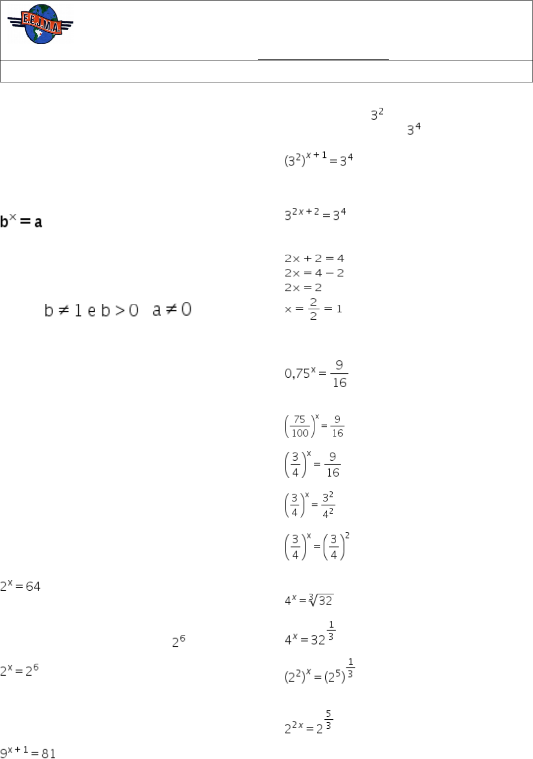 <p>ESCOLA ESTADUAL JOAQUIM MAURÍCIO DE AZEVEDO</p><p>ENSINO FUNDAMENTAL E MÉDIO COMUM GERAL</p><p>Rua Ubaldino de Assis, nº 364, Bairro Rio Novo – CEP: 39.440-332 – Janaúba/MG</p><p>Fone: (38) 3821-2050 – E-mail: escola.233374@educacao.mg.gov.br</p><p>Professor(a): AMANDA MEIRA ALVES Componente curricular: MATEMÁTICA</p><p>EQUAÇÃO EXPONENCIAL</p><p>Equação exponencial é a equação que apresenta a incógnita (valor desconhecido) no expoente. Para resolver esse tipo de equação, aplicamos as propriedades de potenciação.</p><p>Definição de equação exponencial:</p><p>Onde:</p><p>b é a base;</p><p>x é o expoente (incógnita);</p><p>a é a potência.</p><p>Em que e .</p><p>COMO RESOLVER EQUAÇÕES EXPONENCIAIS</p><p>As equações exponenciais podem ser escritas de várias formas e para resolvê-las, utilizaremos que potências iguais de bases iguais, obrigatoriamente também possuem os mesmos expoentes.</p><p>Assim, uma estratégia para resolver equações exponenciais é igualar as bases das potências. Uma vez que as bases estejam iguais, podemos eliminá-las e comparar os expoentes. Para igualar as bases das potências em uma equação exponencial, utilizamos ferramentas matemáticas como a fatoração e as propriedades da potenciação.</p><p>EXEMPLO 1</p><p>Para determinar o valor da incógnita x, igualamos as bases das potências, usando a fatoração do 64.</p><p>· 64 = 2 . 2 . 2 . 2 . 2 . 2 ou</p><p>Substituindo na equação:</p><p>Desconsideramos as bases, restando apenas a igualdade entre os expoentes.</p><p>x = 6, Assim, x = 6 é o resultado da equação.</p><p>EXEMPLO 2</p><p>Igualamos as bases utilizando fatoração.</p><p>· 9 = 3.3 =</p><p>· 81 = 3. 3. 3. 3 =</p><p>Substituindo na equação:</p><p>Utilizando a propriedade de potência de uma potência, multiplicamos os expoentes do lado esquerdo.</p><p>Com as bases igualadas podemos descartá-las e igualar os expoentes.</p><p>Assim, x = 1 é o resultado da equação.</p><p>EXEMPLO 3</p><p>Transformamos a base 0,75 em uma fração centesimal.</p><p>Simplificamos a fração centesimal.</p><p>Fatoramos o 9 e o 16.</p><p>Igualando as bases, temos que x = 2.</p><p>x = 2</p><p>EXEMPLO 4</p><p>Transformamos a raiz em uma potência.</p><p>Fatoramos as bases das potências.</p><p>Multiplicando os expoentes, igualamos as bases.</p><p>, Logo, temos que:</p><p>image4.png</p><p>image5.png</p><p>image6.png</p><p>image7.png</p><p>image8.png</p><p>image9.png</p><p>image10.png</p><p>image11.png</p><p>image12.png</p><p>image13.png</p><p>image14.png</p><p>image15.png</p><p>image16.png</p><p>image17.png</p><p>image18.png</p><p>image19.png</p><p>image20.png</p><p>image21.png</p><p>image22.png</p><p>image23.png</p><p>image1.png</p><p>oleObject1.bin</p><p>image2.png</p><p>image3.png</p>