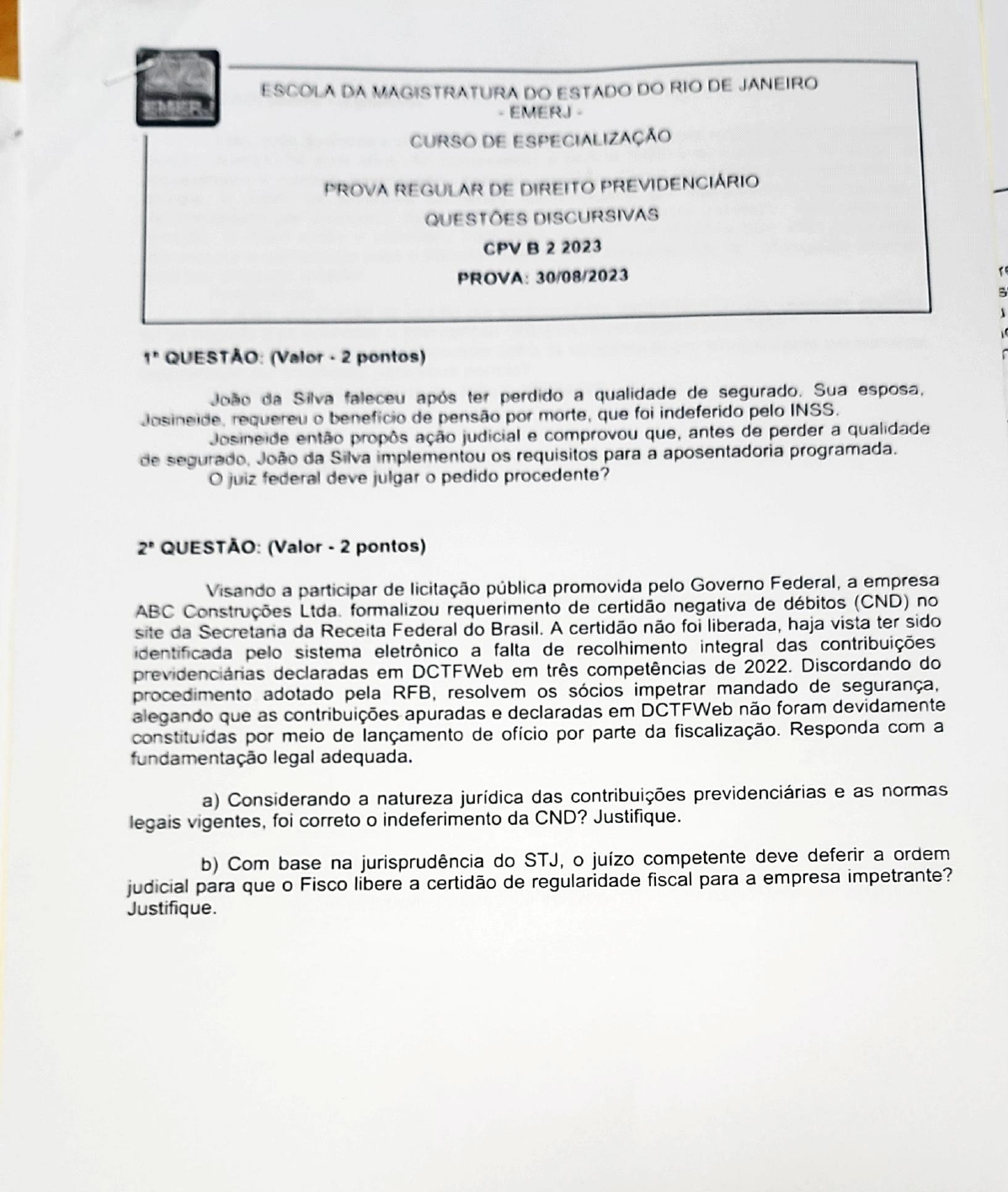 <p>00 est,soo 00 RIO OC JANEIRO</p><p>CURSO</p><p>'SROVA ('REVIOCNCIARIO</p><p>CPV g 2 2023</p><p>PROVA:</p><p>OUESTAO: 2 pontos)</p><p>Sirva faleceu apóg tet perdido a qualidade de segurado. Sua esposa,</p><p>o beneficio de pensao por morto. que roi indeferido pelo INSS.</p><p>entao acho judicial o comprovou que. antes de perder a qualidade</p><p>Oe Joâo da S'tva implementou os requisitos para a aposentadoria programada.</p><p>O fui? federal deve julgar o pedido procedente?</p><p>QUESTÃO: (Valor • 2 pontos)</p><p>Vtsando a participar de licitação pública promovida pelo Governo Federal, a empresa</p><p>ABC Construções Ltda. formalizou requerimento de certidão negativa de débitos (CND) no</p><p>site da Secretana da Receita Federal do Brasil. A certidão não foi liberada, haja vista ter sido</p><p>'dentrficada pelo sistema eletrônico a falta de recolhimento integral das contribuições</p><p>prevóencsánas declaradas em DCTFWeb em três competências de 2022. Discordando do</p><p>procedimento adotado pela RFB, resolvem os sócios impetrar mandado de segurança,</p><p>alegando que as contribuições apuradas e declaradas em DCTFWeb não foram devidamente</p><p>constituídas por meio de lançamento de ofício por parte da fiscalização. Responda com a</p><p>fundamentação legal adequada.</p><p>a) Considerando a natureza jurídica das contribuições previdenciárias e as normas</p><p>legais vigentes, foi correto o indeferimento da CND? Justifique.</p><p>b) Com base na jurisprudência do STJ, o juízo competente deve deferir a ordem</p><p>judicial para que o Fisco libere a certidão de regularidade fiscal para a empresa impetrante?</p><p>Justifique.</p><p>3a QUESTÃO: (Valor - 2 pontos)</p><p>João, com quarenta e oito anos de idade, recebe auxílio por incapacidade temporária</p><p>(auxílio doença) há dois anos. Ao comparecer a perícia médica administrativa do INSS, é</p><p>aconselhado a realizar intervenção cirúrgica cardíaca. Como se negou a se submeter à</p><p>cirurgia, o órgão da autarquia concedeu aposentadoria por incapacidade permanente</p><p>(aposentadoria por invalidez). Após dois anos em gozo do novo benefício, João operou o</p><p>coração. O INSS então o convocou para nova perícia, que concluiu que João recuperou</p><p>plenamente a capacidade para o trabalho apesar de o segurado não ter conseguido retornar</p><p>para seu emprego anterior.</p><p>Pergunta-se:</p><p>a) João, em fruição de auxílio por incapacidade temporária (auxílio doença), poderia</p><p>ter se negado a se submeter à intervenção cirúrgica recomendada pelo INSS?</p><p>b) O INSS poderia ter convocado João, já aposentado por incapacidade permanente</p><p>(aposentado por invalidez), para nova perícia?</p><p>c) Como se fará o retorno de João à atividade?</p><p>ATENÇÃO: Responda uma única questão em cada folha.</p><p>- EMERJ -</p><p>PROVA REGULAR DE DIREITO PREVIDENCIÁRIO - CPV-B</p><p>Prova: 30/08/2023</p><p>TEMA 05 (2,0 PONTOS) - PROFESSOR MARCELO LEONARDO</p><p>r QUESTÃO:</p><p>João da Silva faleceu após ter perdido a qualidade de segurado. Sua esposa, Josineide,</p><p>requereu o beneficio de pensão por morte, que foi indeferido pelo INSS.</p><p>Josineide então propôs ação judicial e comprovou que, antes de perder a qualidade de</p><p>segurado, João da Silva implementou os requisitos para a aposentadoria programada.</p><p>O juiz federal deve julgar o pedido procedente?</p><p>GABARITO:</p><p>Sim, nos termos do art. 102, S20, da Lei n. 8.213/1991;</p><p>Art. 102. A perda da qualidade de segurado importa em caducidade dos direitos inerentes</p><p>a essa qualidade.</p><p>1 0 A perda da qualidade de segurado não prejudica o direito à aposentadoria para cuja</p><p>concessão tenham sido preenchidos todos os requisitos, segundo a legislação em vigor à</p><p>época em que estes requisitos foram atendidos.</p><p>20 Não será concedida pensão por morte aos dependentes do segurado que falecer após</p><p>a perda desta qualidade, nos termos do art. 15 desta Lei, salvo se preenchidos os requisitos</p><p>para obtenção da aposentadoria na forma do parágrafo anterior.</p><p>Veja-se o julgamento abaixo: RESP 1.110.565 (Tema repetitivo 21 do STJ)</p><p>RECURSO ESPECIAL SUBMETIDO AOS DITAMES DO ART. 543-C DO CPC E DA</p><p>RESOLUÇÃO NO 8/STJ. PENSÃO POR MORTE. PERDA PELO DE CUJUS DA</p><p>CONDIÇÃO DE SEGURADO. REQUISITO INDISPENSÁVEL AO DEFERIMENTO</p><p>DO BENEFÍCIO. EXCEÇÃO. PREENCHIMENTO EM VIDA DOS REQUISITOS</p><p>NECESSÁRIOS À APOSENTAÇÃO. INOCORRÊNCIA. RECURSO PROVIDO. 1 - A</p><p>condição de segurado do de cujus é requisito necessário ao deferimento do beneficio de</p><p>pensão por morte ao(s) seu(s) dependente(s). Excepciona-se essa regra, porém, na</p><p>hipótese de o falecido ter preenchido, ainda em vida, os requisitos necessários à concessão</p><p>de uma das espécies de aposentadoria do Regime Geral de Previdência Social - RGPS.</p><p>Precedentes. II - In casu, não detendo a de cujus, quando do evento morte, a condição de</p><p>segurada, nem tendo preenchido em vida os requisitos necessários à sua aposentação,</p><p>incabível o deferimento do beneficio de pensão por morte aos seus dependentes. Recurso</p><p>especial provido</p><p>«2,0 PON10S) PROFES<OR SÉRGIO QUEIROGA</p><p>QI ESTÃO:</p><p>Visando a participar de licitação pública promovida pelo Governo Federal, a</p><p>empresa ABC Construções Ltda. formalizou requerimento de certidão negativa de</p><p>debitos (CND) no site da Secretaria da Receita Federal do Brasil.</p><p>A ccrlidào não foi liberada. haja vista ter sido identificada pelo sistema eletrônico a falta</p><p>de recolhimento integral das contribuições previdenciárias declaradas em DCTF Web em</p><p>três competências de 2022. Discordando do procedimento adotado pela RFB, resolvem</p><p>os sócios impetrar mandado de segurança, alegando que as contribuições apuradas e</p><p>declarad