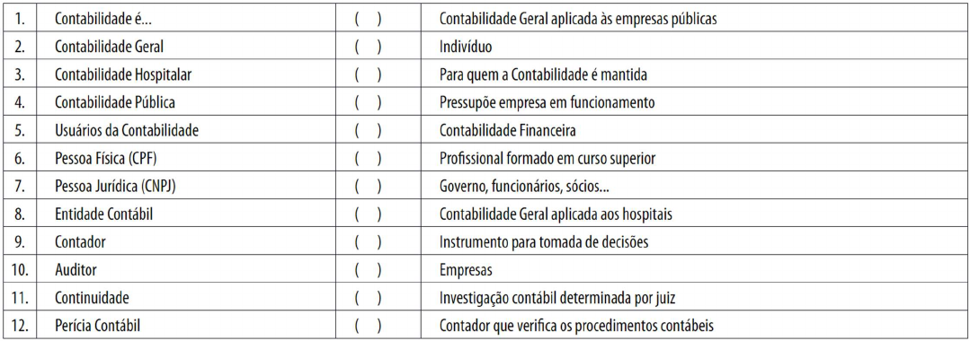 <p>1) Associe os números da coluna da esquerda com a coluna da direita:</p><p>2) A Contabilidade é o instrumento que fornece o máximo de informações úteis para a tomada de decisões dentro e fora da empresa.</p><p>Algum dia você já parou para pensar por que tomamos decisões? Decisão é uma palavra de impacto, motiva algumas pessoas e assusta</p><p>um punhado de outras. Tomar decisões não costuma ser uma tarefa fácil e esse processo se torna ainda mais difícil quando o dinheiro</p><p>e o rumo de uma empresa estão em jogo. Para você, o que significa tomar uma decisão? E qual o processo para a tomada de decisão</p><p>adequada?</p><p>3) O Sr. Messias e sua família moram numa casa grande de dois andares na cidade de Indaiatuba. Como a casa se localiza num ponto</p><p>de grande circulação de pessoas no período da tarde, eles utilizam o espaço no térreo como ponto de venda de hot dogs. Estes são</p><p>preparados por D. Silvana, esposa do Sr. Messias, na cozinha comum da casa, que também se localiza no térreo. Os demais cômodos</p><p>de moradia ficam no andar de cima.</p><p>a) Utilizando a regra da Entidade Contábil, como você faria a contabilidade dos gastos de energia, água e aluguel da casa e da empresa</p><p>de hot dogs do Sr. Messias?</p><p>b) O Sr. Messias poderia constituir uma pessoa jurídica para exploração de sua atividade comercial?</p><p>c) A contabilidade do hot dog deveria ser feita? Certa vez, o Sr. Messias leu num livro: “Todos os negócios, independentemente de seu</p><p>tamanho, necessitam de informações (dados) para a tomada de decisão. Para agregar valor aos negócios, a Contabilidade deveria</p><p>focalizar seu objetivo principal: instrumento gerencial, ou seja, fornecer, analisar e ordenar dados para a tomada de decisão. Na</p><p>verdade, há serviços contábeis com ênfase exagerada na parte burocrática: guias, folhas de pagamento, impostos etc. Assim, nem</p><p>sempre o usuário da Contabilidade é atendido conforme suas principais necessidades decisoriais; nesse caso, ela dá a falsa impressão</p><p>de serviços de ‘despachante’”. Você concorda com essa informação? Comente.</p><p>1) Associe os números da coluna da esquerda com a coluna da direita:</p><p>2) O Sr. Guilherme Polimento está muito satisfeito com sua riqueza acumulada até o momento:</p><p>● Um automóvel importado avaliado em $ 80.000</p><p>● Um apartamento de 3 dormitórios avaliado em $ 400.000</p><p>● Uma casa de campo avaliada em $ 350.000</p><p>● Dinheiro no bolso $ 500</p><p>● Depósitos bancários $ 5.100</p><p>Calcule a riqueza líquida do Sr. Guilherme, sabendo que o mesmo possui as seguintes obrigações:</p><p>● Dívida com o Sistema Financeiro da Habitação (SFH) $ 320.000</p><p>● Empréstimo bancário $ 6.000</p><p>● Contas a pagar $ 14.000</p><p>● Financiamento da casa de campo $ 250.000</p><p>Na resolução desse exercício, separe o que é bem do que é direito.</p><p>3) Os bens intangíveis são aqueles que não existem fisicamente, mas são reais, porém difíceis de serem avaliados. Por exemplo, como</p><p>avaliar uma startup que desenvolve um software e é muito bem-sucedida? Quanto vale esse software? Quanto vale sua plataforma?</p><p>O software, atualmente, é um dos bens intangíveis mais relevantes. Assinale os que são considerados bens intangíveis.</p><p>( ) Marcas e patentes ( ) Ponto comercial ( ) Clientela ( ) Licença de uso ( ) Máquinas e equipamentos</p><p>( ) Lealdade dos clientes ( ) Capital intelectual ( ) Veículos ( ) Móveis e utensílios ( ) Franquias</p><p>( ) Direitos autorais ( ) Software ( ) Direitos de imagem e de transmissão ( ) Fórmulas</p><p>1) Associe os números da coluna da esquerda com a coluna da direita:</p><p>2) Aluísio Tavares, excelente aluno nos bancos escolares, após ser aprovado no exame de suficiência e ter registro no CRC, foi</p><p>contratado para gerenciar a Contabilidade de uma companhia de capital aberto. Sua primeira dúvida era se o exercício social da</p><p>empresa seria de 6 meses, período em que deveria publicar as Demonstrações Financeiras, ou de 12 meses. Consultando a Lei das</p><p>S.A., constatou que o exercício social é de 12 meses, regra esta valendo também para o Imposto de Renda. Daí, a dúvida. Por que a</p><p>publicação semestral se o exercício social é efetivamente de 12 meses? Ajude nosso companheiro recém-formado.</p><p>3) Identifique a informação: “A dívida da Cia. Albertina com o Banco Financial refere-se a um financiamento de quatro anos, sendo</p><p>oferecido um imóvel como garantia. O custo do financiamento abrange juros anuais de 8% mais correção da TR (Taxa Referencial)”.</p><p>Essa informação completa faz parte dos relatórios contábeis.</p><p>a) Indique em que lugar ela aparecerá:</p><p>b) No Patrimônio da Cia. Albertina, o valor dessa dívida será destacado em:</p><p>( ) Bens</p><p>( ) Direitos</p><p>( ) Obrigações</p><p>( ) Patrimônio Líquido</p><p>c) Podemos denominar essa dívida:</p><p>( ) Fornecedores</p><p>( ) Financiamentos</p><p>( ) Impostos a Pagar</p><p>( ) Contas a Pagar</p>