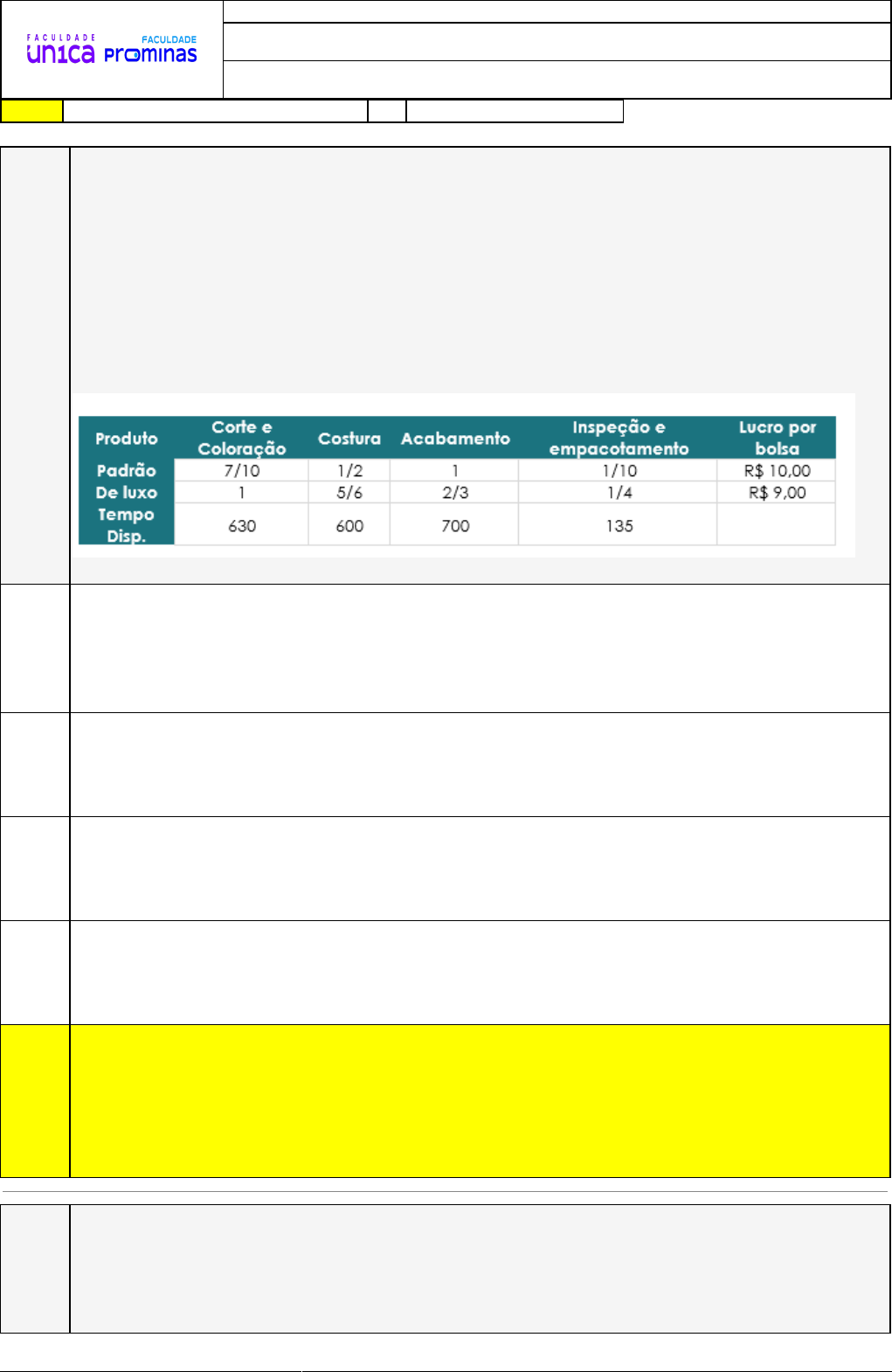 <p>06/08/2024 19:20:58 1/7</p><p>REVISÃO DE SIMULADO</p><p>Nome:</p><p>BRUNO SOARES DE BARROS</p><p>Disciplina:</p><p>Pesquisa Operacional</p><p>Respostas corretas são marcadas em amarelo X Respostas marcardas por você.</p><p>Questão</p><p>001 (Adaptada) A Fashion Things Ltda. é uma pequena empresa fabricante de diversos tipos</p><p>de acessórios femininos, entre os quais estão bolsas de modelos diferentes. A empresa</p><p>foi convencida, pelo seu distribuidor, de que existe mercado tanto para bolsas do</p><p>modelo padrão (preço médio) quanto para as bolsas do modelo luxo (preço alto). A</p><p>confiança do distribuidor é tão acentuada que ele garante que ele irá comprar todas as</p><p>bolsas que forem produzidas nos próximos três meses. Uma análise detalhada dos</p><p>requisitos de fabricação resultaram na especificação da tabela abaixo, a qual apresenta</p><p>o tempo despendido (em horas) para a realização das quatro operações que constituem</p><p>o processo produtivo, assim como o lucro estimado por tipo de bolsa. Qual modelo</p><p>maximiza o lucro da empresa?</p><p>A) Max Z = 10 x + 9y</p><p>7/10 x + y 630</p><p>x + y 600</p><p>x +2/3 y 700</p><p>x, y ≥ 0</p><p>B) Max z = 10x +9 y</p><p>1/10x +1/4 y ≥135</p><p>7/10 x +y ≥630</p><p>x,y ≥0</p><p>C) Max z = 10x +9y</p><p>7/10x+y 630</p><p>1/10x+1/4y 135</p><p>x,y ≥0</p><p>D) Max Z= 10x + 9y</p><p>7/10 x + y 630</p><p>½ x +5/6 y 600</p><p>x ,y ≥ 0</p><p>X E) Max z = 10x +9y</p><p>7/10x+y 630</p><p>1/2x +5/6y 600</p><p>X+ 2/3 y 700</p><p>1/10x+1/4y 135</p><p>x,y ≥0</p><p>Questão</p><p>002 (UFJF-Adaptada) Um vendedor de frutas pode transportar 800 caixas de frutas para sua</p><p>região de vendas. Ele já transporta 200 caixas de laranjas a 20 u.m. de lucro por caixa</p><p>por mês. Ele necessita transportar pelo menos 100 caixas de pêssegos a 10 u.m. de</p><p>lucro por caixa, e no máximo 200 caixas de tangerinas a 30 u.m. de lucro por caixa. De</p><p>que forma deverá ele carregar o caminhão para obter o lucro máximo?</p><p>06/08/2024 19:20:58 2/7</p><p>A) x- quantidade de caixas de pêssego a serem transportadas</p><p>y- quantidade de caixas de tangerina a serem transportadas</p><p>Max z = 10x +30y +8000</p><p>x + y 600</p><p>x ≥ 200</p><p>y 100</p><p>x,y ≥ 0</p><p>B) x- quantidade de caixas de pêssego a serem transportadas</p><p>y- quantidade de caixas de tangerina a serem transportadas</p><p>Max z = 10x +30y +4000</p><p>x ≥ 100</p><p>y 200</p><p>x,y ≥ 0</p><p>C) x- quantidade de caixas de pêssego a serem transportadas</p><p>y- quantidade de caixas de tangerina a serem transportadas</p><p>Max z = 10x +30y</p><p>x + y 600</p><p>x ≥ 100</p><p>y 200</p><p>x,y ≥ 0</p><p>X D) x- quantidade de caixas de pêssego a serem transportadas</p><p>y- quantidade de caixas de tangerina a serem transportadas</p><p>Max z = 10x +30y +4000</p><p>x + y 600</p><p>x ≥ 100</p><p>y 200</p><p>x,y ≥ 0</p><p>E) x- quantidade de caixas de pêssego a serem transportadas</p><p>y- quantidade de caixas de tangerina a serem transportadas</p><p>Max z = 30y +4000</p><p>x + y 600</p><p>x ≥ 100</p><p>x,y ≥ 0</p><p>Questão</p><p>003 (UFJF/Adaptada) Uma empresa fabrica 2 modelos de cintos de couro. O modelo M1, de</p><p>melhor qualidade, requer o dobro do tempo de fabricação em relação ao modelo M2. Se</p><p>todos os cintos fossem do modelo M2, a empresa poderia produzir 1.000 unidades por</p><p>dia. A disponibilidade de couro permite fabricar 800 cintos de ambos os modelos por</p><p>dia. Os cintos empregam fivelas diferentes, cuja disponibilidade diária é de 400 para M1</p><p>e 700 para M2. Os lucros unitários são de $4,00 para M1 e $3,00 para M2. Qual o</p><p>programa ótimo de produção que maximiza o lucro total diário da empresa? Construa, o</p><p>modelo do sistema descrito.</p><p>A) Max L = 4x + 3y</p><p>S.A: 2x + y</p><p>x + y 700</p><p>x 500 ; y 600</p><p>x, y 0</p><p>B) Max L = 14x + 13y</p><p>S.A: 2x + y</p><p>x + y 100</p><p>x 400 ; y 700</p><p>x, y 0</p><p>06/08/2024 19:20:58 3/7</p><p>X C) Max L = 4x + 3y</p><p>S.A: 2x + y</p><p>x + y 800</p><p>x 400 ; y 700</p><p>x, y 0</p><p>D) Min L = 40x + 30y</p><p>S.A: 2x + y</p><p>x + y 800</p><p>x 400 ; y 700</p><p>x, y 0</p><p>E) Max L = 4x + 3y</p><p>S.A: x + y</p><p>x + y 800</p><p>x 300 ; y 600</p><p>x, y 0</p><p>Questão</p><p>004 (USP-Adaptada) A empresa Have Fun S/A produz uma bebida energética muito</p><p>consumida pelos frequentadores de danceterias noturnas. Dois dos componentes</p><p>utilizados na preparação da bebida são soluções compradas de laboratórios</p><p>terceirizados – solução Red e solução Blue – e que proveem os principais ingredientes</p><p>ativos do energético: extrato de guaraná e cafeína. A companhia quer saber quantas</p><p>doses de 10 mililitros de cada solução deve incluir em cada lata da bebida, para</p><p>satisfazer às exigências mínimas padronizadas de 48 gramas de extrato de guaraná e</p><p>12 gramas de cafeína e, ao mesmo tempo, minimizar o custo de produção. Por acelerar</p><p>o batimento cardíaco, a norma padrão também prescreve que a quantidade de cafeína</p><p>seja de, no máximo, 20 gramas por lata. Uma dose da solução Red contribui com 8</p><p>gramas de extrato de guaraná e 1 grama de cafeína, enquanto uma dose da solução</p><p>Blue contribui com 6 gramas de extrato de guaraná e 2 gramas de cafeína. Uma dose</p><p>de solução Red custa R$ 0,06 e uma dose de solução Blue custa R$ 0,08. Qual modelo</p><p>minimiza os custos de produção?</p><p>X A) x1 → Quantidade de doses de 10 mililitros de Red/lata</p><p>x2 → Quantidade de doses de 10 mililitros de Blue/lata</p><p>Min Z = 0,06x1 + 0,08x2</p><p>8x1 + 6x2 ≥ 48</p><p>x1 + 2x2 ≥ 12</p><p>x1 + 2x2 ≤ 20</p><p>x1 ≥ 0</p><p>x2 ≥ 0</p><p>B) x1 → Quantidade de doses de 10 mililitros de Red/lata</p><p>x2 → Quantidade de doses de 10 mililitros de Blue/lata</p><p>Min Z = 0,06x1 + 0,08x2</p><p>8x1 + 6x2 ≥ 4