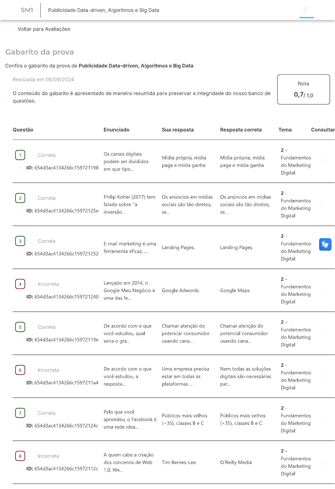 <p>SMT Publicidade Data-driven, Algoritmos e Big Data Voltar para Avaliações Gabarito da prova Confira o gabarito da prova de Publicidade Data-driven, Algoritmos e Big Data Realizada em 06/09/2024 Nota conteúdo do gabarito é apresentado de maneira resumida para preservar a integridade do nosso banco de 0,7/1,0 questões. Questão Enunciado Sua resposta Resposta correta Tema Consultar 1 Correta Os canais digitais Mídia própria, mídia Mídia própria, mídia Fundamentos podem ser divididos ID: 654d3ac4134266c159721198 paga e mídia ganha paga e mídia ganha do Marketing em que tipo... Digital 2 2 Correta Philip Kotler (2017) tem Os anúncios em mídias Os anúncios em mídias Fundamentos falado sobre "a sociais são tão diretos, sociais são tão diretos, ID: 654d3ac4134266c15972125e do Marketing inversão... se... se... Digital 2 - 3 Correta E-mail marketing é uma Fundamentos Landing Pages. Landing Pages. ID: 654d3ac4134266c159721252 ferramenta eficaz, do Marketing Digital 2 - 4 Incorreta Lançado em 2014, o Fundamentos Google Meu Negócio é Google Adwords Google Maps ID: 654d3ac4134266c159721240 do Marketing uma das fe... Digital 2 - 5 Correta De acordo com o que Chamar atenção do Chamar atenção do Fundamentos você estudou, qual potencial consumidor potencial consumidor ID: 654d3ac4134266c15972119e do Marketing seria o gra... usando cana... usando cana... Digital 2 6 Incorreta De acordo com o que Uma empresa precisa Nem todas as soluções Fundamentos você estudou, a estar em todas as digitais são necessárias ID: 654d3ac4134266c1597211a4 do Marketing resposta... plataformas par... Digital 2 - - 7 Correta Pelo que você Públicos mais velhos Públicos mais velhos Fundamentos aprendeu, o Facebook é ID: (+35), classes B e C (+35), classes B e C do Marketing uma rede idea... Digital 2 8 Incorreta A quem cabe a criação Fundamentos dos conceitos de Web Tim Bernes-Lee O'Reilly Media ID: do Marketing 1.0, We... Digital</p><p>2 9 Correta De acordo com o que Marketing de Atração, Marketing de Atração, Fundamentos você estudou, qual é a estratégia combinada estratégia combinada do Marketing ID: 654d3ac4134266c159721264 de cana... de cana.. Digital 10 Incorreta Dos tipos de mídia, Mídia própria e mídia Mídia paga. Se as Fundamentos qual oferece a maior paga. Porque combinar campanhas não ID: 654d3ac4134266c15972113e do Marketing os doi.. performam, é Digital Encontrou algum problema? Você pode copiar o ID da questão, acessar o Campus Virtual (SIA) e abrir um requerimento.</p>