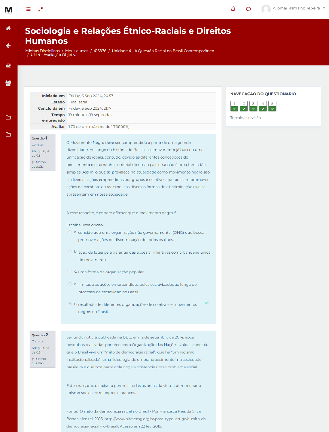 <p>M Aliomar Ramalho Teixeira Sociologia e Relações Étnico-Raciais e Direitos Humanos Minhas Disciplinas / Meus cursos / 415876 / Unidade 4 A Questão Racial no Brasil Contemporâneo / UN 4 Avaliação Objetiva Iniciado em Friday, 6 Sep 2024, 20:57 NAVEGAÇÃO DO QUESTIONÁRIO Estado Finalizada 1 2 3 4 5 Concluída em 6 Sep 2024, 21:17 Tempo 19 minutos 19 segundos Terminar revisão empregado Avaliar 1,70 de um máximo de 1,70(100%) Questão 1 Movimento Negro deve ser comprendido a partir de uma grande Correto Atingiu diversidade. Ao longo da história do Brasil esse movimento já buscou uma de unificação de ideias, contudo, devido as diferentes concepções de Marcar questão pensamento e o tamanho terriorial do nosso país essa não é uma tarefa tão simples. Assim, o que se prevalece na atualidade como movimento negro são as diversas ações empreedidas por grupos e coletivos que buscam promover ações de combate ao racismo e as diversas formas de discriminação que se apresentam em nossa A esse respeito, é correto afirmar que o movimento negro é Escolha uma opção: a. considerado uma organização não governamental (ONG) que busca promover ações de discriminação de todos os tipos. b. ação de lutas pela garantia das ações afirmartivas como bandeira única do movimento C. uma forma de organização popular. d. limitado as ações empreendidas pelos escravizados ao longo do processo de escravidão no Brasil. e. resultado de diferentes organizações de coletivos e movimentos negros do Brasil. Questão 2 Segundo notícia publicada na BBC, em 12 de setembro de 2014, após Correto pesquisas realizadas por técnicos a Organização das Nações Unidas concluiu Atingiu 0,34 de que Brasil vive um "mito de democracia que há "um racismo Marcar uma "ideologia de na sociedade questão brasileira e que boa parte dela nega a existência desse problema social. E diz mais, que racismo permeia todas as áreas da vida, a demonstrar abismo social entre negros e brancos. Fonte: mito da democracia racial no Brasil Por Francisca Reis da Silva Barros 2016. http://www.sitraemg.org.br/post_type_artigo/o-mito-da- Acesso em 22 fev. 2019.</p><p>Considerando o mito da democracia racial no Brasil, avalie as afirmações a seguir. No Brasil o preconceito que prevalece é o preconceito social. II. Estudos de Florestan Fernandes revelaram que brasileiros negros e brancos têm as mesmas oportunidades no país. III. Os estudos nacionais revelam que negros e brancos não acessam os direitos básicos em igualdade de condições. IV. A maioria da população negra é pobre. V. tipo de cabelo é um dos alvos do racismo no É correto apenas o que se afirma em Escolha uma opção: b. III. IV e V. C. III e d. V. e. Questão 3 A questão racial no Brasil perpassa pela identidade negra. Não raramente nos Correto deparamos com situações em que a figura do negro aparece representada Atingiu de com estereotipos que atrapalham a afirmação da identidade negra. Leia, a Marcar seguir, os apontamento de Nilma Lino Gomes sobre esse processo: questão "Construir uma identidade negra positiva em uma sociedade que, historicamente, ensina aos negros, desde muito cedo, que para ser aceito é preciso negar-se a si mesmo é um desafio enfrentado pelos negros e pelas negras Fonte: Nilma Lino. Alguns termos e conceitos presentes no debate sobre relações raciais no Brasil: uma breve discussão. In: Educação Anti-racista: caminhos abertos pela Lei federal 10.639/03. Brasília, MEC, Secretaria de educação continuada e alfabetização e diversidade, p. 43. Diante dos apontamentos de Nilma Lino Gomes, é correto afirmar que o(a) Escolha uma opção: a. escravidão e o racismo não são impeditiva para a construção da identidade negra. b. fortalecimento da identidade do negro também se dá quando ele não se preocupa com racismo. C. construção da identidade negra é um processo que pertence apenas ao negro. d. construção da identidade negra perpassa por todo um preconceito social e racial. e. identidade negra é algo que já nasce com todos os negros.</p><p>Questão 4 racismo no Brasil é um problema histórico que está presente em diferentes Correto contextos da nossa sociedade. Atingiu 0,34 de 0,34 Marcar questão Considerando a afirmativa apresentada, avalie as asserções a seguir e a relação proposta entre elas. A questão racial no Brasil exige políticas públicas que sejam capazes de promover oportunidades iguais para todos. PORQUE II. As ações afirmarivas tendem a privilegiar determinados grupos em detrimento de outros, gerando o racismo A respeito dessas asserções assinale a opção correta. Escolha uma a. As asserções e são proposições verdadeiras, e a é uma justificativa correta da b. A asserção é uma proposição falsa, e a é uma proposição verdadeira. As asserções I e são proposições verdadeiras, mas a não é uma justificativa correta da d. As asserções e são proposições falsas. e. A asserção é uma proposição verdadeira, e a é uma proposição falsa. Questão 5 As políticas de ações afirmativas são muito recentes no Brasil, diferentemente, Correto Atingiu 0,34 por exemplo, dos Estados Unidos que já promovem essas ações a mais de 50 de anos. Marcar questão Considerando a afirmativa apresentada, avalie as asserções a seguir e a relação proposta entre elas. As políticas de ações afirmativas não se limitam apenas as cotas raciais e sociais, elas devem ser capazes de promover ações que busquem a igualdade de oportunidades. PORQUE II. As cotas devem ser vistas apenas como medidas paleativas e não como a solução definitiva para os problemas da desigualdade. A respeito dessas asserções assinale a opção correta. Escolha uma opção: a. As asserções e são proposições verdadeiras, e uma justificativa correta da b. A asserção é uma proposição falsa, e a é uma proposição verdadeira.</p><p>C.A asserção é uma proposição verdadeira, uma 