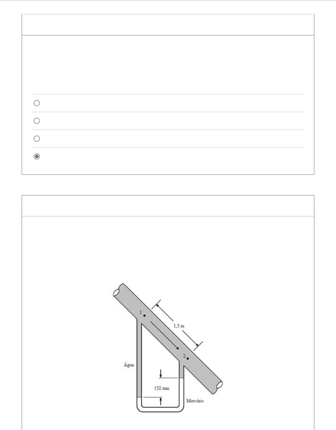 ATIVIDADE OBJETIVA 4_1_2023 Iniciado: 19 mar em 15:14 Instruções do teste 1 ptsPergunta 1 103,78 e 248 kPa 2,48 e 103,78 kPa 2,479 e 2,48 kPa 103,78 e 2,48 kPa Um tanque aberto para a atmosfera armazena glicerina. Determinar a pressão de um elemento fluido a uma profundidade de 20 cm e a pressão manométrica neste mesmo ponto, em (kPa). Massa específica da glicerina = 1260 Kg/m .3 1 ptsPergunta 2 Água escoa para baixo em um tubo a 45°, como mostra a figura abaixo. A queda de pressão (P - P ) se deve, em parte, à gravidade e, em parte, ao atrito. O manômetro de mercúrio lê uma diferença de altura de 152 mm. Determinar a diferença de pressão (P - P ), em (lbf/ft ). 1 2 1 2 2 392 lbf/ft ; 185 lbf/ft . 221 lbf/ft ; 171 lbf/ft ; 2 2 2 2 1 ptsPergunta 3 A relação entre massa específica e peso específico é: ; A pressão é a razão de uma área por uma força. A pressão exercida sobre a superfície da massa fluida é transmitida ao seu interior integralmente e em todas as direções; Um fluido resiste a pequenos esforços de cisalhamento; Assinalar a (s) frase (s) corretas: 1 ptsPergunta 4 Sendo (-25.500 Pa) a pressão manométrica no ponto A, determinar o peso específico do líquido (2), em (N/m ). 3 8,024 N/m 802,36 N/m 8023,6 N/m 80236 N/m 3 3 3 3 1 ptsPergunta 5 positiva; nula; sempre igual a pressão atmosférica. negativa; Na superfície livre de um fluido, a pressão efetiva é: 1 ptsPergunta 6 ÇENGEL, Yunus A.; CIMBALA, John M. Mecânica dos Fluidos - Fundamentos e aplicações. SP: McGraw-Hill, 2007. A pressão da água escoando através de um duto é medida pelo dispositivo mostrado na figura abaixo. Para os valores indicados, determinar a pressão no Salvo em 19:55 23,6 kPa 33,6 kPa 124,9 kPa 134,9 kPa duto em (kPa). Enviar teste