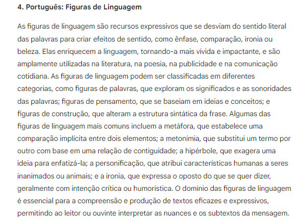 <p>4. Português: Figuras de Linguagem As figuras de linguagem são recursos expressivos que se desviam do sentido literal das palavras para crian efeitos de sentido, como ênfase, comparação, ironia ou beleza. Elas enriquecem a linguagem, tornando-a mais vívida e impactante, e são amplamente utilizadas na literatura, na poesia, na publicidade e na comunicação cotidiana. As figuras de linguagem podem ser classificadas em diferentes categorias, como figuras de palavras, que exploram os significados e as sonoridades das palavras; figuras de pensamento, que se baseiam em ideias e conceitos; e figuras de construção, que alteram a estrutura sintática da frase. Algumas das figuras de linguagem mais comuns incluem a que estabelece uma comparação entre dois elementos; a que substitui um termo por outro com base em uma relação de contiguidade; a hipérbole, que exagera uma ideia para enfatizá-la; a personificação, que atribui humanas a seres inanimados ou animais; e a ironia, que expressa oposto do que se quer dizer, geralmente com intenção critica ou das figuras de linguagem é essencial para a compreensão e produção de textos eficazes e expressivos, permitindo ao leitor ou ouvinte interpretar as nuances e os subtextos da mensagem.</p>