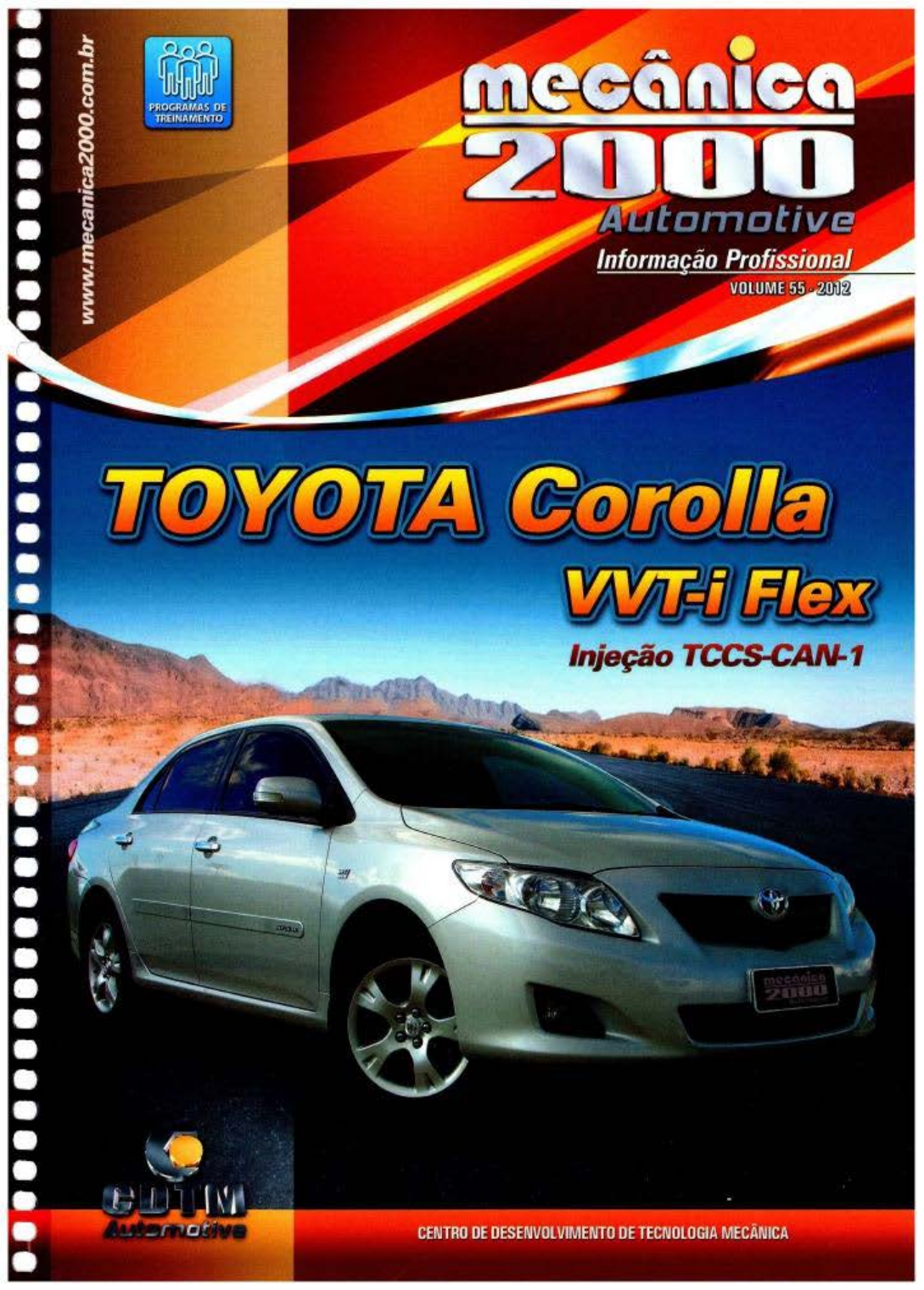 <p>Corpo edltDriol</p><p>ReoUZOfÕO</p><p>Parceria</p><p>Direção geral: Marcley Lazarini</p><p>Desenvolvimento técnico: Alysson Ramos I Francilenc Mendes</p><p>Jadder Oliveira I Valdir Gonçalves</p><p>Programação visual e FOtos: Gil Braz</p><p>Capa: Pedro Bonneau</p><p>Revisão ortográfica: Genoveva Xavier</p><p>Desenhos técnicos: Emerson Neves</p><p>Colaboração: Solano Soares I Wesley Alecrim</p><p>~ mgT.LW</p><p>Autg:rrwi:iv•</p><p>CENTRO DE DESENVOLVIMENTO</p><p>DE TECNOLOGIA MECÂNICA</p><p>Av. Sebastião de Brito, 215 · O. Clara</p><p>3126().000 · Belo Horizonte · MG</p><p>Televendas • (31) 3123-0700</p><p>www.mecanica2000.com.b r</p><p>( GEDORE) W KLANN~ I~ TEflf/111/ITIIKÍ</p><p>Apoio</p><p>•</p><p>1\CI\ ..., __</p><p>®GAUSS</p><p>FRASLE</p><p>~</p><p>•-Gt -- -</p><p>I .. - I ... ...</p><p>MTl·THOMSON</p><p>SCHADEK T taranto</p><p>2 ~------------------------------------------------</p><p>c</p><p>Índice</p><p>4 -FICHA TéCNICA DO VEiCULO</p><p>5 ·MANUTENÇÃO PERIÓDICA PREVENTIVA</p><p>6 • CHECK•UST</p><p>9 • CABEÇOTE E_ JUNTA DO}·IOTOR</p><p>16 - TRANSMJSSAO AUTOMATICA</p><p>26 - CORREIAS MICRO•V</p><p>29 • BOMBA D'ÁGUA</p><p>3 1 ·BOMBA DE ÓLEO</p><p>37 ·FREIOS</p><p>43 • SUSPENSÃO</p><p>51 • SISTEMA DE ARREfECIMENTO</p><p>55 • TORQUES DE APERTO</p><p>59 · HIGIENIZAÇÃO DO AR-CONDICIONADO</p><p>61 ·ALTERNADOR DENS014V/UOA</p><p>66 ·MOTOR DE PARTIDA BOSH 12VJ0,9KW</p><p>70 · CENTRAL DE RE~· SE FUS,VEIS DO VÃO DO MOTOR</p><p>73 · CENTRAL DE RE SE fUS VEIS DO PAI NEL</p><p>79 - CENTRAL DE RE S DO CONSOLE CENTRAL</p><p>80 • CONECTORES AUXILIA~$</p><p>98 • CONECTORES DE JUNCAO</p><p>108 · PONTOS DE ATERRA~IÉNTO</p><p>112 • PAINEL DE INSTRU11ENTOS</p><p>11$ · ESPECIFI CAÇÕES TECNICAS DAS lÂMPADAS</p><p>118 • DIAGRA>IA DO INTERRUPTOR DE t4ÚLTIPLA FUNÇÃO (I"F)</p><p>119 • DIAGRA~IA DO COI·lUTADDR !;)E I GNIÇÃO, ALTERNADOR E MP</p><p>120 ·DIAGRAMA DAS LUZES DE RE</p><p>121 • DIAGRAMA DAS LUZES DE FREIO</p><p>123 • DIAGRAMA DO FAROL ALTO E BAIXO</p><p>123 • DJAGRAMA DA BUZINA _</p><p>124 • DIAGRAMA DAS lUZES DE POSIÇAO E LUZ DE. PLACA</p><p>125 • LUZES I NDICADORAS DE DIREÇAO E AOVERTENCIA</p><p>126 · TOMADA 12V</p><p>127 · DIAGRAMA DO ll·10BIUZADDR</p><p>128 • DIAGRAMI> DO I NTERRUPTOR DORES. 00 FlUIFO DE FREIO</p><p>128 • DIAGRAMI> DO I NTERRUPTOR DE PRESSÃO DE ÓLEO</p><p>129 • DIAGRAMI> DO DESEMBAÇADOR DO VIDRO TRASEIRO</p><p>130 · DIAGRAMA DAS LUZES DE CORTESIA</p><p>132 · DIAGRAMA DO,S UMP. E DO LAVADOR DO PARA-BRISA</p><p>133 · DIAGRAMA ELETR1CO DO SISTE" A !;>E ARREFECII~ENTO</p><p>134 · DIAGRAMA DOS RETROVISO,RES ELETRICOS</p><p>135 ·DIAGRAMA DOS VJDR9S ELETI\ICOS</p><p>136 ·DIAGRAMA DA DIREÇAO ELETRICA</p><p>138 • DII>GRA>IA DO SIST. ANTI•I;URTO E DAS TRI>VAS EléTRICAS</p><p>140 - OIAGRANA DO SJSTEM OE AUOIO</p><p>141 - O!AGRAf\1A 00 BLOQUEIO OE f.1UDANCA OE ttlAA.CHAS</p><p>143 • DII>GRA>IA DA TRANS~1JSSÃO AUTOMÀTICA</p><p>)45 -DIAGRAMA DO AIR BAG</p><p>14-8- OlAGRAf\IA 00 AR· CONOJCJONADO E DA VENT. I NTERNA</p><p>153 • SISTEMI> DE ALIMENTI>ÇÃD DE COMBUSTiveL</p><p>157 - CO>IPONENTES E SUAS LOCALIZAÇÕES</p><p>159 • CONECTOR DE DIAGNÓSTICO</p><p>161 • PI!'JAGEM DO MÓDULO DE CO,ANOO</p><p>163 - t-100Ul0 DE COMANDO - MC</p><p>167 • SENSORES DE O~IGÊNIO • HEGO 1 E 2</p><p>l H : ~~~~g~ g~ ~~&g~~'ÀR~E DE MANIVELAS - CKP</p><p>177 • SENSOR DE VELOCIDADE - VSS</p><p>179 • SENSOR DE DETONI>ÇÃO • KS</p><p>181 • SENSOR DE POSIÇÃO DO PEDAL DO ACELEAADOR • SPA</p><p>184 • SENSOR DE TEt~P. DO LiQ. DE i>RREFECIMENTO - ECT</p><p>187 ·SENSO R OE POSIÇÃO DO COMANDO OE VÁLVULAS- CMP</p><p>190 • SISTE>IA DE PI>RTIDI> A FRIO • SPF</p><p>194 • VÁLV. DE CONTROLE DE ÓLEO DO COM. DE VÁLVULAS · VCO</p><p>196 • ElETROVÁLVULA DE PURGA DO CÁNISTER • CI>NP</p><p>199 • BOBINAS DE IGNIÇÃO (MÓDULO OIS)</p><p>204 • ELETROINJETORES - INJ</p><p>207 • BORBOLETA MOTORIZADA· ETC</p><p>210- BO>IBI> DE COMBUSTIVEL - SAC</p><p>213 -TABELA DE VALORES IDEAIS</p><p>214 • DII>GRA"A ELÉTRICO</p><p>217 - TESTE SEUS CONHECIMENTOS</p><p>Tipo</p><p>Número e disposição dos cilindros</p><p>Modelo</p><p>Numero de válvulas por cilindro</p><p>Acionamento da distribuição</p><p>Poténcia do motor</p><p>Torque máximo</p><p>Rotação de marcha lenta</p><p>Transmissão</p><p>Diâmetro do cilindro</p><p>Curso do êmbOlo</p><p>VOlume de deslocamento (cilindrada)</p><p>Tipo</p><p>Dianteiros</p><p>Traseiros</p><p>Fluido</p><p>Freio de estacionamento</p><p>Dianteira</p><p>Traseira</p><p>Comprimento total</p><p>Largura total</p><p>Altura total</p><p>Distância entre eixos</p><p>Capacidade de carga</p><p>Volume do porta·maJas</p><p>FICHA TÉCNICA- Corolla 1.8 XLI</p><p>Motor 1.8 Dual VVT-1 16V DOHC Fiex</p><p>Freios</p><p>Suspensão</p><p>Dimensões</p><p>Capacidades</p><p>Transversal, dianteiro</p><p>4 em linha</p><p>1ZZ·FBE</p><p>4</p><p>Por corrente</p><p>132.0 CV a 6000 rpm (gasolina)</p><p>136.0 CV a 6000 rpm (âicool)</p><p>17.3 Kgfm a 4200 rpm (gasolina)</p><p>17.5 Kgfm a 4200 rpm (álcool)</p><p>700 ±50 rpm</p><p>Automática</p><p>79.0 mm</p><p>91,5 mm</p><p>1794 cmJ</p><p>Hidráulico, e circuitos independentes</p><p>Freio a disco ventilado</p><p>Freio a disco sólido</p><p>DOT 4</p><p>Mecãnioo, atuação nas rodas traseiras</p><p>McPherson com barra estabilizadora</p><p>Eixo de torção com barra estabilizadora</p><p>4.540 mm</p><p>1.760 mm</p><p>1.480 mm</p><p>2.600mm</p><p>375 kg (Transmissão automática)</p><p>385 kg (T ransmissâo Manual)</p><p>470 L</p><p>Sistema de Arrefecimento</p><p>Tipo da bomba d'água Bomba centrifuga no bloco do motor</p><p>Proporção do fluido de amlfecimento Aprox. 50% aditivo e 50% água</p><p>Injeção eletrônica de combustível</p><p>Tipo da bomba de combustível</p><p>Pressão da bomba de combustível</p><p>Carter (com filtro de óleo)</p><p>Transmissão automática</p><p>Sistema de arrefecimento</p><p>T