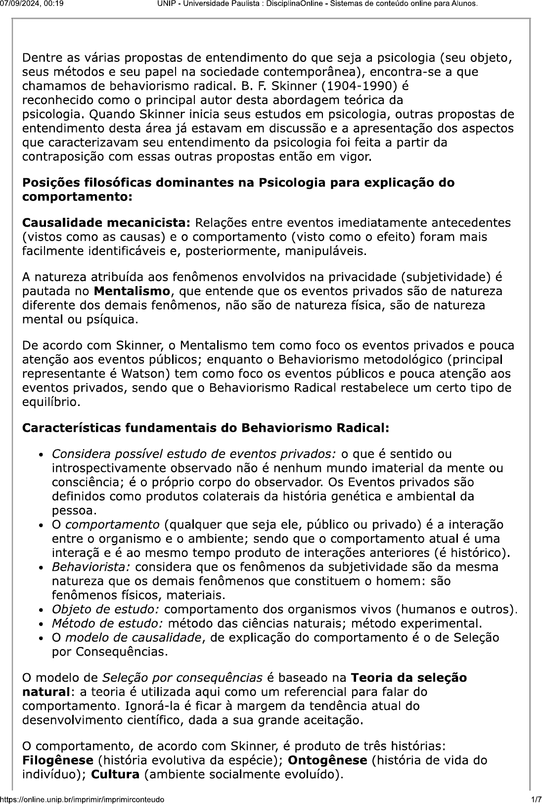 <p>00:19 UNIP Universidade Paulista : DisciplinaOnline Sistemas de conteúdo online para Alunos. Dentre as várias propostas de entendimento do que seja a psicologia (seu objeto, seus métodos e seu papel na sociedade contemporânea), encontra-se a que chamamos de behaviorismo radical. B. F. Skinner (1904-1990) é reconhecido como o principal autor desta abordagem teórica da psicologia. Quando Skinner inicia seus estudos em psicologia, outras propostas de entendimento desta área já estavam em discussão e a apresentação dos aspectos que caracterizavam seu entendimento da psicologia foi feita a partir da contraposição com essas outras propostas então em vigor. Posições filosóficas dominantes na Psicologia para explicação do comportamento: Causalidade mecanicista: Relações entre eventos imediatamente antecedentes (vistos como as causas) e o comportamento (visto como o efeito) foram mais facilmente identificáveis e, posteriormente, manipuláveis. A natureza atribuída aos fenômenos envolvidos na privacidade (subjetividade) é pautada no Mentalismo, que entende que os eventos privados são de natureza diferente dos demais fenômenos, não são de natureza física, são de natureza mental ou psíquica. De acordo com Skinner, o Mentalismo tem como foco os eventos privados e pouca atenção aos eventos públicos; enquanto o Behaviorismo metodológico (principal representante é Watson) tem como foco os eventos públicos e pouca atenção aos eventos privados, sendo que o Behaviorismo Radical restabelece um certo tipo de equilíbrio. Características fundamentais do Behaviorismo Radical: Considera possível estudo de eventos privados: o que é sentido ou introspectivamente observado não é nenhum mundo imaterial da mente ou consciência; é o próprio corpo do observador. Os Eventos privados são definidos como produtos colaterais da história genética e ambiental da pessoa. comportamento (qualquer que seja ele, público ou privado) é a interação entre o organismo e o ambiente; sendo que o comportamento atual é uma e é ao mesmo tempo produto de interações anteriores (é histórico). Behaviorista: considera que os fenômenos da subjetividade são da mesma natureza que os demais fenômenos que constituem o homem: são fenômenos físicos, materiais. Objeto de estudo: comportamento dos organismos vivos (humanos e outros). Método de estudo: método das ciências naturais; método experimental. O modelo de causalidade, de explicação do comportamento é o de Seleção por Consequências. modelo de Seleção por consequências é baseado na Teoria da seleção natural: a teoria é utilizada aqui como um referencial para falar do comportamento. Ignorá-la é ficar à margem da tendência atual do desenvolvimento científico, dada a sua grande aceitação. comportamento, de acordo com Skinner, é produto de três histórias: Filogênese (história evolutiva da espécie); Ontogênese (história de vida do indivíduo); Cultura (ambiente socialmente evoluído). https://online.unip.br/imprimir/imprimirconteudo 1/7</p><p>07/09/2024, 00:19 UNIP Universidade Paulista : DisciplinaOnline Sistemas de conteúdo online para Alunos. Filogênese (história evolutiva) e explicação histórica: são explicações alternativas ao mentalismo, apesar de atípicas entre as ciências por serem não mecanicistas. Exercício comentado Leia a afirmação e a justificativa e assinale a alternativa correta. Entende-se que os organismos, como espécies, têm suas características definidas ao longo da história evolutiva. Porque Quem se adapta ao ambiente são os organismos, assim, os indivíduos que se esforçam mais conseguem sobreviver. a) A afirmação é falsa e a justificativa é verdadeira. b) A afirmação e a justificativa são verdadeiras. c) A afirmação e a justificativa são verdadeiras, mas a justificativa não é correta para essa afirmação. d) A afirmação é verdadeira e a justificativa é falsa. e) A afirmação e a justificativas são falsas. Resposta: d A justificativa é falsa, pois a seleção é ambiental e os indivíduos esforçados não necessariamente conseguem sobreviver, pois isso irá depender mais de suas características físicas do que comportamentais. A Psicologia como Ciência do Comportamento Para Behaviorismo Radical, é condição básica do ser humano que ele interaja com a natureza, com outros homens, que significa dizer que ele aja sobre a natureza, sobre os outros homens e sofra os efeitos dessa sua ação: isto é determinação, isto é controle. Em primeiro lugar, porque ele age sobre, e, ao fazê-lo, produz mudanças. Em segundo lugar, porque a esperança do Behaviorismo Radical é que, através da descrição desses processos de interação, através da produção de conhecimento científico, nós possamos criteriosamente escolher e produzir as condições que nos https://online.unip.br/imprimir/imprimirconteudo 2/7</p><p>07/09/2024, 00:19 UNIP Universidade Paulista DisciplinaOnline Sistemas de conteúdo online para Alunos. controlarão: o homem pode se tomar sujeito de seu próprio destino (About Behaviorism, 1974, p.277). E fará isso agindo sobre o mundo, produzindo o mundo que o produzirá enquanto organismo, enquanto pessoa e enquanto self. Fundamentalmente, é por causa dessa esperança que Behaviorismo Radical tem feito críticas sistemáticas à prática de se buscar as causas do comportamento no interior do indivíduo. Procurar os determinantes dentro do homem, buscar explicações mentalistas, contentar-se com a indicação das chamadas causas internas nos afasta de atuar sobre o mundo (Sério, TMAP, 2005). Bibliografia Básica: SERIO, T. M. A. P. Por que sou behaviorista radical? Sobre Comportamento e Cognição. Aspectos teóricos, metodológicos e de formação em Análise do Comportamento e Terapia Cognitivista. Org. Roberto Alves Banaco. Santo André, SP: ESETec Editores Associados, 2001. Vol. 1, p. 68-75. SERIO, T. M. A. P. O behavioris