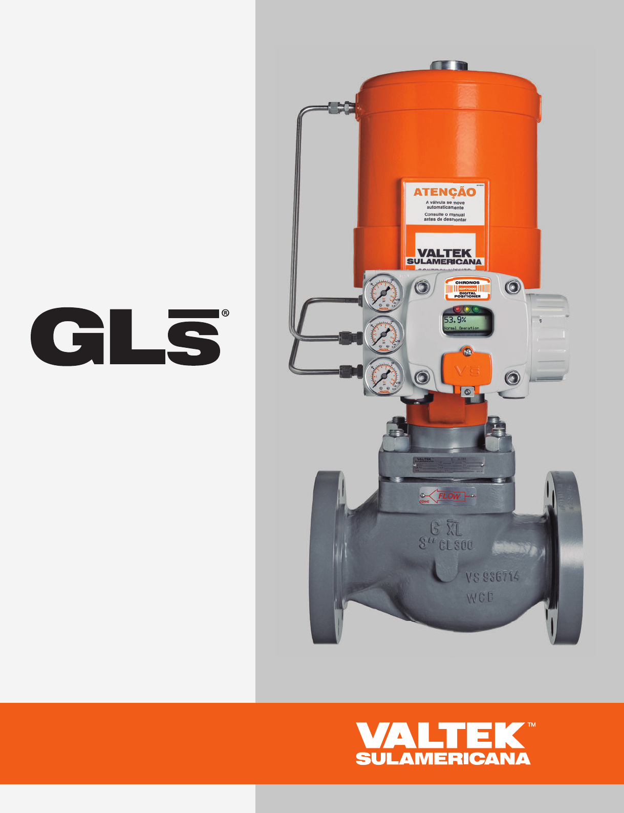 <p>VÁLVULA DE</p><p>CONTROLE GLOBO</p><p>VALTEK SULAMERICANA2 VÁLVULA DE CONTROLE GLOBO GLS</p><p>I N T R O D U Ç Ã O</p><p>A válvula de controle tipo globo Série GL S</p><p>apresenta um desempenho superior, ao mesmo</p><p>tempo em que permite uma manutenção fácil,</p><p>rápida e econômica. Ao contrário das válvu-</p><p>las de controle operadas por atuadores do tipo</p><p>mola-diafragma, a Série GL S , que opera com</p><p>atuador do tipo cilindro e pistão de dupla ação</p><p>com mola para retorno em caso de falha, é</p><p>beneficiada por uma elevada rigidez pneumáti-</p><p>ca, que assegura uma excelente precisão de posi-</p><p>cionamento em controle modulado, assim como</p><p>respostas rápidas e confiáveis à variação do sinal</p><p>de comando. Uma vez que o atuador opera com</p><p>pressões de ar de suprimento de até 10,3 Bar (150</p><p>psi), a Série GL S apresenta também elevadas for-</p><p>ças de atuação para assegurar a estanqueidade</p><p>desejada, mesmo sob valores consideravelmente</p><p>altos de pressão diferencial.</p><p>Os atuadores do tipo mola-diafragma depen-</p><p>dem inteiramente da força da mola para fechar</p><p>a válvula, ao passo que na Série GL S , a força da</p><p>mola, a pressão do ar de suprimento e a pressão</p><p>do próprio fluido de processo são combinadas</p><p>entre si para produzirem uma ele vada for-</p><p>ça de fechamento e garantir assim ní-</p><p>veis excepcionais de estanqueidade.</p><p>Devido ao seu projeto com sede</p><p>au tocentrante, a válvula Série</p><p>GL S alcança facilmente os níveis</p><p>de estanqueidade especificados.</p><p>Os problemas mais comuns</p><p>associados às válvulas de controle</p><p>podem ser atribuídos ao sistema</p><p>de guia no retentor da sede. O es-</p><p>treito contato entre as superfícies</p><p>metálicas do retentor da sede e do</p><p>obturador resulta freqüentemente em</p><p>desgaste por atrito e emperramento. Por</p><p>esta razão, a Série GL S possui um sistema</p><p>de dupla guia superior, que é localizado fora</p><p>da linha de fluxo e que elimina o contato direto</p><p>entre o obturador e o retentor da sede.</p><p>Assim como a válvula, o atuador também pos-</p><p>sui uma construção compacta, leve e de manuseio</p><p>mais fácil quando comparado aos atuadores con-</p><p>vencionais do tipo mola-diafragma. Devido à sua</p><p>concepção avançada, o conjunto válvula-atuador</p><p>apresenta níveis de robustez e de de sempenho de</p><p>tal forma elevados, que tornam a Série GL S uma</p><p>referência mundial em sua categoria.</p><p>SÉRIE GLS - SUBCONJUNTO DO CORPO (FIGURA 1)</p><p>Rangeabilidade típica de 30:1</p><p>Estanqueidade ANSI Classe IV — Sede Metálica*</p><p>Estanqueidade ANSI Classe VI — Sede Macia*</p><p>* Padrão para válvulas com internos não balanceados.</p><p>Montagem dos internos</p><p>“Top Entry”</p><p>Sistema de</p><p>Dupla Guia</p><p>Superior</p><p>Sede Autocentrante:</p><p>Elevada Capacidade de Vedação</p><p>VALTEK SULAMERICANA VÁLVULA DE CONTROLE GLOBO GLS 3</p><p>Corpo do tipo Globo Convencional</p><p>Os corpos do tipo globo da Série GL S (Fig. 1) apresen-</p><p>tam um escoamento suave, com o fluxo ordenado. A galeria</p><p>interna do corpo apresenta áreas de passagem constantes,</p><p>sem a formação de bolsões, o que permite uma elevada ca-</p><p>pacidade de vazão com um mínimo de turbulência.</p><p>Estes corpos são construídos com espessuras de parede</p><p>mais uniformes, o que resulta em menos peso e menor</p><p>custo, especialmentte quando o corpo é fabricado em aço</p><p>inoxidável ou ligas especiais de custo mais elevado.</p><p>Corpo Angular</p><p>A válvula Série GL S com corpo angular é completamen-</p><p>te intercambiável com a válvula do tipo globo: com exce-</p><p>ção do corpo, todos os demais componentes permanecem</p><p>os mesmos.</p><p>Dependendo do tipo de aplicação a que se destina, a</p><p>válvula GL S com corpo angular pode ser opcionalmente</p><p>fornecida com uma sede especial do tipo venturi, que se</p><p>estende até o flange de saída do corpo e proporciona uma</p><p>proteção adicional contra a ação erosiva do fluido.</p><p>Corpo de Três Vias</p><p>Os corpos de três vias são utilizados para aplicações</p><p>com sentidos de fluxo convergente (ação misturadora) ou</p><p>divergente (ação de desvio). Devido ao elevado índice de</p><p>intercambiabilidade proporcionado pelo projeto da Série</p><p>GL S , uma válvula globo padrão pode ser facilmente con-</p><p>vertida em uma válvula de três vias com a simples adição</p><p>de um adaptador de três vias, uma sede superior, duas jun-</p><p>tas e um obturador especial para válvula de três vias.</p><p>Corpo com Camisa de Vapor</p><p>A Série GL S com camisa de vapor utiliza um corpo do</p><p>tipo globo dotado de flanges cegos, que são padronizados</p><p>no caso de encamisamento parcial ou superdimensiona-</p><p>dos no caso de encamisamento total. Usualmente, a cami-</p><p>sa é projetada para trabalho com vapor saturado à pressão</p><p>máxima de 10,3 Bar (150 psi) e é equipada com conexões</p><p>roscadas do tipo NPT (outros tipos de conexões estão dis-</p><p>poníveis sob consulta). Quando da aquisição de uma vál-</p><p>vula equipada com camisa de vapor, o usuário deverá es-</p><p>pecificar o tipo de encamisamento desejado, assim como a</p><p>qualidade do vapor, o número e o tipo de conexões.</p><p>E S T I L O S D E C O R P O S</p><p>VÁLVULA COM</p><p>CORPO ANGULAR</p><p>(FIGURA 2)</p><p>VÁLVULA DE</p><p>TRÊS VIAS</p><p>(FIGURA 3)</p><p>VÁLVULA COM</p><p>CAMISA DE VAPOR</p><p>(FIGURA 4)</p><p>VÁLV</p><p>TRÊS VI</p><p>(FIG</p><p>VÁLV</p><p>CAMISA</p><p>(FIG</p><p>VALTEK SULAMERICANA4 VÁLVULA DE CONTROLE GLOBO GLS</p><p>C A R A C T E R Í S T I C A S , V A N T A G E N S</p><p>Robustez</p><p>A construção da válvula GL S a torna menos suscetível</p><p>à ação corrosiva dos fluidos quando compara
