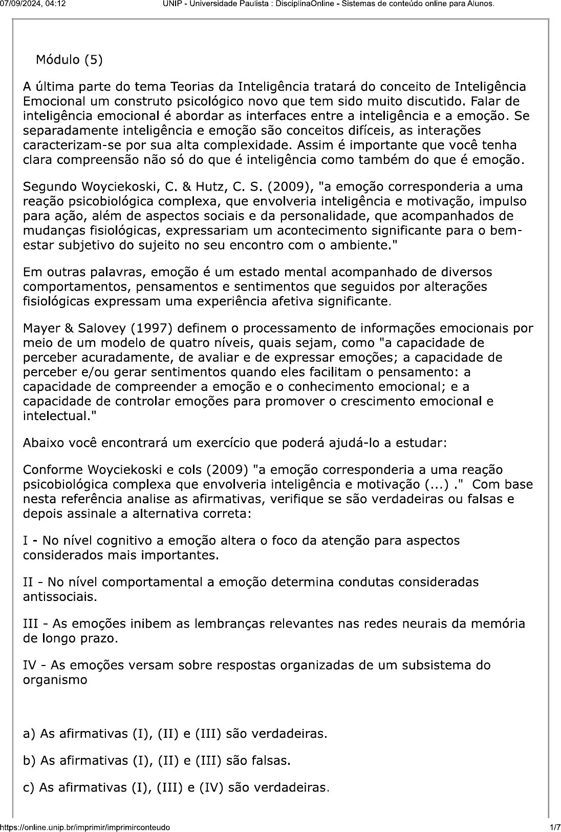 <p>07/09/2024. 04:12 UNIP Universidade Paulista DisciplinaOnline Sistemas de conteúdo online para Alunos. Módulo (5) A última parte do tema Teorias da Inteligência tratará do conceito de Inteligência Emocional um construto psicológico novo que tem sido muito discutido. Falar de inteligência emocional é abordar as interfaces entre a inteligência e a emoção. Se separadamente inteligência e emoção são conceitos difíceis, as interações caracterizam-se por sua alta complexidade. Assim é importante que você tenha clara compreensão não só do que é inteligência como também do que é emoção. Segundo Woyciekoski, C. & Hutz, C. S. (2009), "a emoção corresponderia a uma reação psicobiológica complexa, que envolveria inteligência e motivação, impulso para ação, além de aspectos sociais e da personalidade, que acompanhados de mudanças fisiológicas, expressariam um acontecimento significante para o bem- estar subjetivo do sujeito no seu encontro com o ambiente." Em outras palavras, emoção é um estado mental acompanhado de diversos comportamentos, pensamentos e sentimentos que seguidos por alterações fisiológicas expressam uma experiência afetiva significante. Mayer & Salovey (1997) definem o processamento de informações emocionais por meio de um modelo de quatro níveis, quais sejam, como "a capacidade de perceber acuradamente, de avaliar e de expressar emoções; a capacidade de perceber e/ou gerar sentimentos quando eles facilitam o pensamento: a capacidade de compreender a emoção e o conhecimento emocional; e a capacidade de controlar emoções para promover o crescimento emocional e intelectual." Abaixo você encontrará um exercício que poderá ajudá-lo a estudar: Conforme Woyciekoski e cols (2009) "a emoção corresponderia a uma reação psicobiológica complexa que envolveria inteligência e motivação (...) ." Com base nesta referência analise as afirmativas, verifique se são verdadeiras ou falsas e depois assinale a alternativa correta: I No nível cognitivo a emoção altera o foco da atenção para aspectos considerados mais importantes. II No nível comportamental a emoção determina condutas consideradas antissociais. III As emoções inibem as lembranças relevantes nas redes neurais da memória de longo prazo. IV As emoções versam sobre respostas organizadas de um subsistema do organismo a) As afirmativas (I), (II) e (III) são verdadeiras. b) As afirmativas (I), (II) e (III) são falsas. c) As afirmativas (I), (III) e (IV) são verdadeiras. https://online.unip.br/imprimir/imprimirconteudo 1/7</p><p>07/09/2024, 04:12 UNIP Universidade Paulista DisciplinaOnline Sistemas de conteúdo online para Alunos. d) As afirmativas (II), (III) e (IV) são falsas. e) As afirmativas (II), (III) e (IV) são verdadeiras. A alternativa correta é a (d) porque somente a afirmativa (I) está correta. A afirmativa (II) está incorreta, pois sustenta que a emoção determina condutas antissociais. Ao contrário as emoções produzem comportamentos expressivos veiculando informações a outras pessoas que também impulsionam comportamentos instrumentais. A afirmativa (III), também incorreta, pois as emoções não inibem, mas ativam as lembranças nas redes neurais da memória de longo prazo. E a última afirmativa (IV) não está certa, dado que as emoções são respostas organizadas de vários subsistemas e não de um único. A capacidade de perceber acuradamente, de avaliar e de expressar emoções, ou seja, a Perceção Emocional (PE) é considerada a mais básica das quatro habilidades. Segundo (Schwarz, 1990) a percepção emocional parece relacionar-se a capacidade dos indivíduos de reconhecerem emoções em si, nos outros e nas situações sociais, assim como, para expressarem. Quanto à capacidade de perceber e/ou gerar sentimentos que facilitam o pensamento, também denominada, Emoção Facilitadora do Pensamento, trata da possiblidade da emoção influenciar o pensamento utilizando estratégias cognitivas diferentes o que pode facilitar a expressão das emoções positivas e da criatividade. A relação positiva entre emoção, pensamento e cognição pode ser compreendida como facilitadora para solução de problemas emocionais. terceiro nível, a capacidade de compreender a emoção e o conhecimento emocional, ou Compreensão Emocional (CE) relaciona-se a compreensão da emoção também por meio da memória e da codificação emocional, um processo que envolve três habilidades: a) identificação e codificação das emoções; b) compreensão de seus significados, formação e desenvolvimento de suas relações, e por último, c) as causas e consequências destas emoções. A capacidade de controlar emoções, ou Gerenciamento Emocional (GE) possibilita aos sujeitos controlar suas emoções desagradáveis e promover emoções agradáveis em si e nas relações com os outros, o que favorece a qualidade das interações sociais, o crescimento emocional e intelectual. Em 2000, Mayer, Salovey e Caruso relataram que em função da dificuldade de verificar a validade de construtos, o modelo foi reduzido a três níveis: percepção, compreensão e controle de informações afetivas. Algumas teorias a respeito da Inteligência Emocional surgiram e com elas muitas controvérsias na comunicadade acadêmica sobre como e como realizar sua medição. problema abaixo é um exemplo do que você poderá encontrar e de como deverá estudar. Tente resolvê-lo. "Ao procurar acompanhamento psicoterápico, João queixou-se de não conseguir manter relacionamentos amorosos por muito tempo. A fim de exemplificar, ele contou que seu casamento durou apenas seis meses. Relatou que apesar de ter sido muito atento às necessidades da esposa, ela reclamava de tudo, de que ele não percebia o que sentia e desejava. O fim do casamento foi permeado por muitas brigas, principalmente porque ele não admitia qualquer tipo de questionamento sobre possível displicê