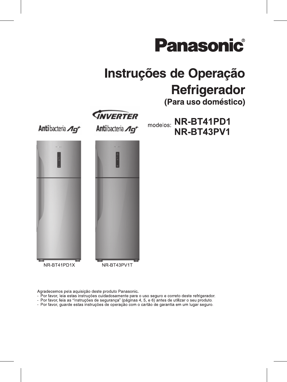 <p>Trata-se de um filtro de carbono contendo ions de prata e fica instalado no duto de ar do refrigerador.</p><p>A solução é semi-permanente e não precisa ser trocada/substituída.</p><p>ANTIBACTERIA AG</p><p>Permite que seu refrigerador funcione em potência máxima durante um período de até 150 minutos, fazendo com que</p><p>o resfriamento ou congelamento dos alimentos seja mais rápido. Esta função é indicada após o abastecimento com</p><p>alimentos (Compras) ou para casos onde a porta do refrigerador será aberta com uma maior frequência (Festa).</p><p>(Para o modo de operação, verificar pág. 13).</p><p>Esta geladeira utiliza MATERIAIS TOTALMENTE ISENTOS DE CFC tanto para o fluido refrigerante (Iso-Butano (R600a))</p><p>como para o fluido isolante (Ciclo-Pentano). Portanto, este produto não destrói a camada de ozônio, exercendo quase</p><p>nenhum efeito sobre o aquecimento global.</p><p>*Os LED´s do painel e o</p><p>LED interno piscam</p><p>constantemente.</p><p>Seu produto está ligado na tensão incorreta. Retire imediatamente o</p><p>produto da tomada e ligue em uma de tensão correta.</p><p>Existe sobretensão na rede elétrica. Retire imediatamente o produto da</p><p>tomada e aguarde a estabilização da tensão antes de ligá-lo novamente.</p><p>*somente BT43</p><p>NR-BT43PV1TA / NR-BT43PV1TB</p><p>NR-BT43PV1XA / NR-BT43PV1XB</p><p>ARAK0A207351</p>