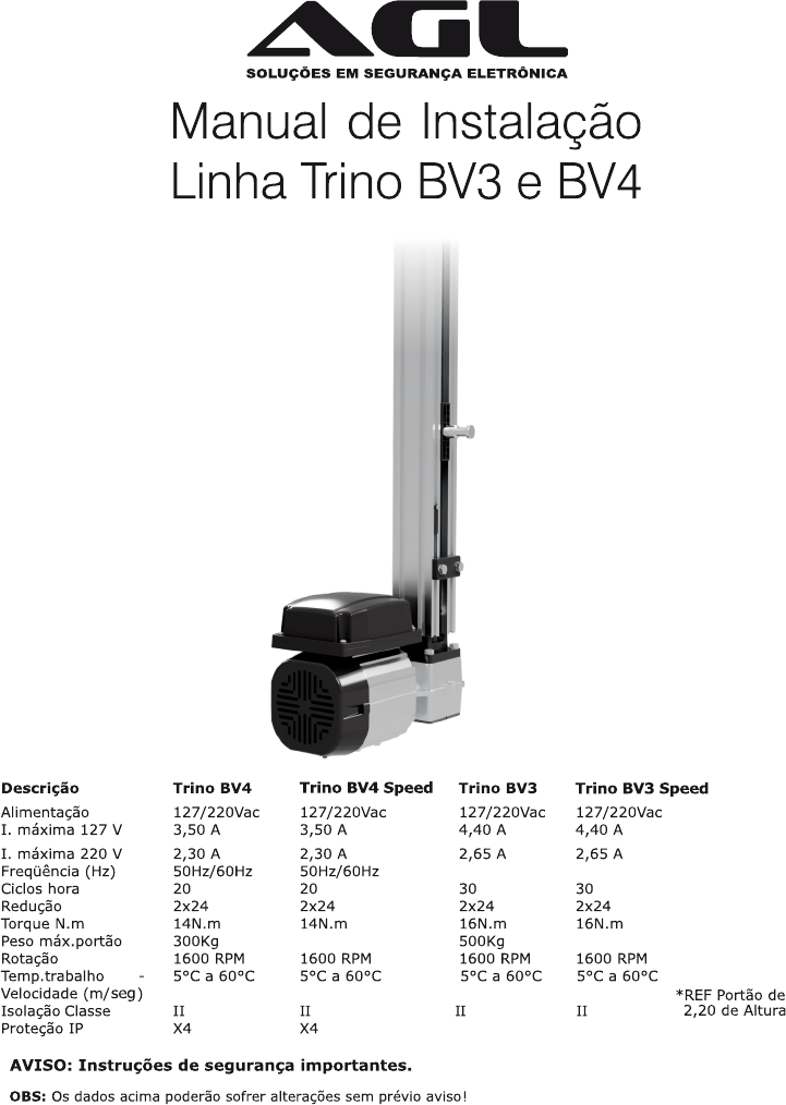 <p>13 segundos 9 segundos</p><p>O tempo de abertura poderá variar de acordo com a dimensão de cada portão</p><p>e configurações da central de comando.</p><p>9 segundos13 segundos</p><p>250Kg 450Kg</p><p>X4 X4</p><p>Central Flex 4.0 ou Superior</p><p>Velocidade (m/seg): 13 segundos</p><p>Trino BV3 Speed</p><p>Ciclo/Hora: 30</p><p>Peso do Portão: até 450(kg)</p><p>Potência do Motor (cv): 1/3HP</p><p>Velocidade (m/seg): 9 segundos</p><p>Trino BV4</p><p>Ciclo/Hora: 20</p><p>Peso do Portão: até 300(kg)</p><p>Potência do Motor (cv): 1/4HP</p><p>Velocidade (m/seg): 13 segundos</p><p>Trino BV4 Speed</p><p>Ciclo/Hora: 20</p><p>Peso do Portão: até 250(kg)</p><p>Potência do Motor (cv): 1/4HP</p><p>Velocidade (m/seg): 9 segundos</p><p>Peso do Portão: até 500(kg)</p><p>Importante:</p><p>Tenha Certeza que o Led FA está aceso com o portão totalmente aberto, e o FF quando o portão</p><p>estiver totalmente fechado.</p><p>OUTROS RECURSOS DE RAMPA:</p><p>desativar a rampa, de um toque no botão (+) do recurso RAMPA (veja se o led pisca para confirmar que o botão foi pressionado</p><p>corretamente). Neste caso estará selecionado o primeiro tipo de rampa. Outro toque no botão (+) e você selecionará o</p><p>segundo tipo de rampa e assim por diante, até o valor máximo de 8. Quanto maior o número, mais suave será a parada.</p><p>ALTERANDO O PONTO DE PARADA:</p><p>Após a programação de abertura e fechamento, a central entenderá que deve-se fazer a parada suave aproximadamente 2</p><p>segundos antes de atingir o sensor de fim de curso. É possível, entretanto, alterar este ponto de parada de forma diferente na</p><p>abertura e no fechamento. Para isso, escolha o tipo de parada suave e depois refaça a programação do tempo de abertura e</p><p>fechamento. DURANTE a movimentação do motor na programação (o led PROG estará piscando), pressione o solte a chave</p><p>PROG exatamente no ponto em que se deseja começar a parada suave. Após a programação, o portão começará a fazer a</p><p>parada suave no ponto em que a chave PROG foi pressionada.</p><p>FREIO:</p><p>PAUSA:</p><p>O tempo de pausa e o tempo em que o portão permanece completamente aberto antes de fechar de forma automática. A cada</p><p>toque na chave (+) do recurso PAUSA, acrescenta-se 5 segundos no tempo de pausa, podendo-se chegar a um tempo máximo</p><p>de 21 minutos (255 toques ou pressiona-se o botão (+) por mais de dois segundos). Para desativar o recurso e zerar esse</p><p>tempo, pressione a chave (-) do recurso pausa por mais de 2 segundos. Se houver uma passagem pela foto célula, o tempo de</p><p>pausa será recarregado e passará a contar a partir da liberação da mesma. O recurso vem desativado de fábrica.</p><p>Existem 10 níveis de freio que podem ser escolhidos pelas chaves (+) e (-) do recurso FREIO. O freio trava o motor por um</p><p>curto espaço de tempo, quando o portão é parado pelo fim de curso ou comando externo. É usado principalmente para tirar a</p><p>inércia em portões deslizantes que não conseguem parar sobre o fim de curso porque se movimentam um pouco após a central</p><p>desligar o motor. Quando colocado no mínimo, esse recurso é desativado. O recurso vem desativado de fábrica.</p><p>EMBREAGEM:</p><p>A embreagem e a quantidade de energia elétrica fornecida ao motor. Ao diminuir a embreagem o motor fica mais fraco e menos</p><p>perigoso, caso uma pessoa ou animal entre na frente do portão. A embreagem pode ser regulada com o portão em movimento,</p><p>pressionando-se as chaves (+) e (-) do recurso EMBREAGEM. Deve ser tão baixa quanto possível, e ainda permitir que o portão</p><p>se mova normalmente. Ao pressionar o botão (+) deste recurso por mais de dois segundos temos a máxima força no motor.</p><p>Este recurso sai de fábrica com o valor máximo.</p><p>Além do recurso de parada suave ativado quando o portão chega próximo ao final de curso, a central possui ainda dois recursos</p><p>úteis para a preservação do conjunto mecânico do automatizados.</p><p>RAMPA INICIO (Rev3 ou superior):</p><p>prove uma rampa de aceleração no início de movimento do motor. Quando habilitado, a central entrega, no momento de ligar</p><p>o motor, energia de forma gradual para que não haja trancos na partida. Quando desabilitado, o motor parte com força</p><p>máxima. Desabilite o recurso caso o automatizador não tenha força suficiente para partir o motor de forma gradual. Para</p><p>habilitar este recurso, retire a alimentação da central e segure botão programar assim que fizer a retirada. Mantenha o botão</p><p>programar pressionado e faça a realimentarão da central, depois disso o led de programação piscará duas vezes indicando que</p><p>o recurso foi habilitado. Para desabilitar repita o procedimento (por padrão o automatizador sai de fábrica com o recurso</p><p>desabilitado).</p><p>RAMPA MEIO:</p><p>ao habilitar este recurso, um comando de botoeira ou controle remoto com o portão em movimento faz com que o portão</p><p>execute a parada suave configurada da mesma maneira que ocorre quando o portão estiver próximo ao final de curso. O</p><p>mesmo não ocorre com um comando vindo da fotocélula, que obrigatoriamente faz uma parada instantânea no automatizador.</p><p>SINALEIRA: O relé ficara ativado o tempo todo e somente desativará quando o portão acabar de fechar. Ficará desligado com</p><p>o portão parado e fechado.</p><p>LUZ GARAGEM: O relé ficará ativado o tempo todo e desativará somente 2 minutos depois do portão fechar completamente.</p><p>Depois ficará desligado com o portão parado e completamente fechado.</p><p>TRAVA: O relé ativará na abertura do portão durante dois segundos depois que um comando for dado e ele estiver</p><p>completamente fechado. Quando ele estiver configurado neste modo, a central atrasa a abertura do portão em 1 s, para dar</p><p>tempo de destravar a trava elétrica. No fechamento, 2 segundos antes de chegar