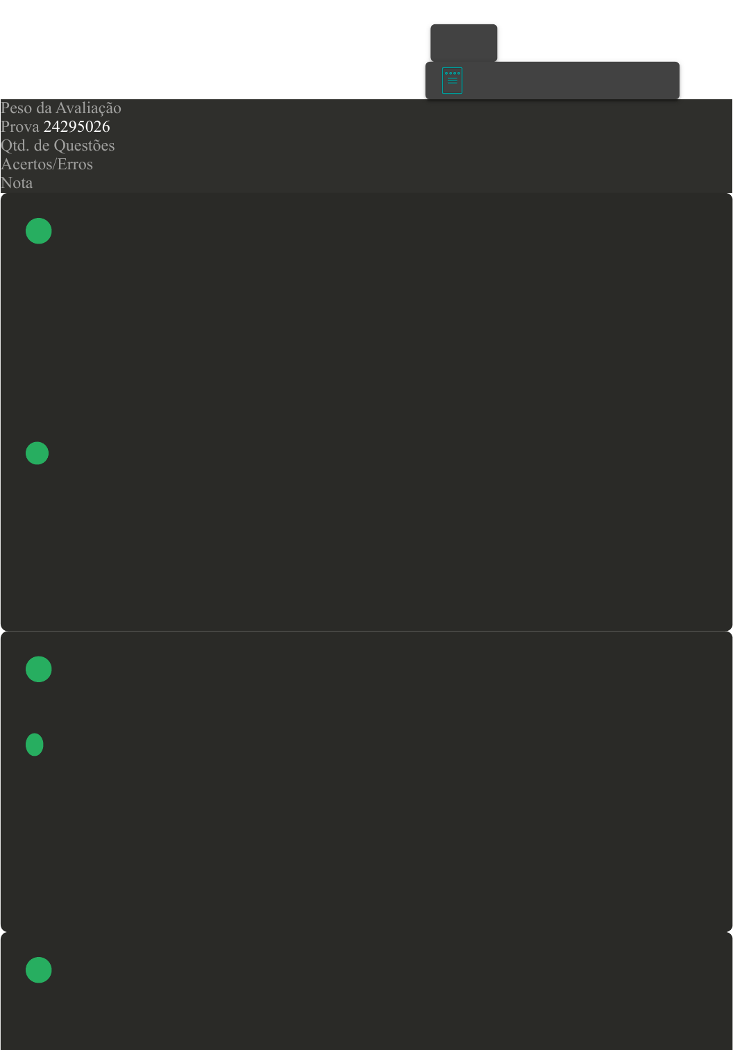 <p>Prova Impressa</p><p>GABARITO | Avaliação Final (Objetiva) - Individual</p><p>(Cod.:655603)</p><p>Peso da Avaliação 3,00</p><p>Prova 24295026</p><p>Qtd. de Questões 11</p><p>Acertos/Erros 10/1</p><p>Nota 10,00</p><p>A responsabilidade socioambiental envolve não apenas o compromisso de empresas com</p><p>pessoas e valores humanos, mas também preocupações genuínas com o meio ambiente. A</p><p>responsabilidade socioambiental das organizações levou à criação de documentos para direcionar as</p><p>empresas. Com relação a estes documentos internacionais para a prática da responsabilidade</p><p>socioambiental, classifique V para as sentenças verdadeiras e F para as falsas:</p><p>( ) Declaração Universal dos Direitos Humanos da ONU.</p><p>( ) Declaração Nacional do Meio Ambiente.</p><p>( ) Declaração do Rio-92 e Agenda 21.</p><p>Agora, assinale a alternativa que apresenta a sequência CORRETA:</p><p>A V - F - V.</p><p>B V - V - F.</p><p>C V - F - F.</p><p>D F - F - V.</p><p>Algumas ferramentas foram criadas para auxiliar a sociedade e a comunidade empresarial na</p><p>criação de um meio ambiente sustentável. A economia de baixo carbono está ligada a este</p><p>desenvolvimento sustentável. No que consiste esta prática?</p><p>A Serve para que seja gerado o menor impacto possível sobre o clima da Terra, com alternativas</p><p>relacionadas à sustentabilidade.</p><p>B Serve de tratado internacional com compromissos compulsórios para o aumento da emissão dos</p><p>gases.</p><p>C Serve para auxiliar na redução da emissão de oxigênio na atmosfera terrestre.</p><p>D Serve de ferramenta para o desenvolvimento de inventários de emissões de GEE.</p><p>Os resíduos sólidos urbanos são denominados como um conjunto de latas, garrafas, restos de</p><p>comidas, jornais, entre outros, que caracterizam a vida cotidiana. Com o passar dos anos, a sociedade</p><p>os viu como parte da vida diária, que não merece nenhuma atenção especial, basta colocá-lo na beira</p><p>da calçada para ser recolhido (THOMAS; CALLAN, 2012). Com relação aos resíduos urbanos na</p><p>VOLTAR</p><p>A+</p><p>Alterar modo de visualização</p><p>1</p><p>2</p><p>3</p><p>TK</p><p>Sticky Note</p><p>Idade Média, classifique V para as sentenças verdadeiras e F para as falsas:</p><p>( ) Um dos problemas clássicos relacionados com os resíduos sólidos na Idade Média foi o</p><p>surgimento da peste bubônica.</p><p>( ) O rápido aumento no número de cidades, associado ao crescimento demográfico restrito à parte</p><p>interna de muralhas, propiciou a contaminação hídrica.</p><p>( ) Já na Idade Média, a preocupação com os resíduos sólidos está presente na cidades, existem</p><p>postos de coletas e motivação para a reutilização de materiais.</p><p>( ) No início da Idade Média, a cidade de Roma se destacava na área de saneamento básico,</p><p>distribuindo água potável e realizando o escoamento dos resíduos.</p><p>Agora, assinale a alternativa que apresenta a sequência CORRETA:</p><p>FONTE: THOMAS, J. M; CALLAN, S. J. Economia ambiental: fundamentos, políticas e aplicações.</p><p>São Paulo: Cengage Learning, 2012.</p><p>A V - V - F - V.</p><p>B F - F - V - V.</p><p>C V - V - F - F.</p><p>D F - V - F - V.</p><p>Em seguida à Convenção de Genebra, que ocorreu na Suíça e teve como intuito tratar dos</p><p>direitos das pessoas em tempos de guerra, surgiu a Constituição Mexicana, que trata de outras</p><p>questões do ser humano e precedeu a criação da Organização Internacional do Trabalho. Com relação</p><p>às medidas ocorridas na Constituição Mexicana, analise as sentenças a seguir:</p><p>I- Regulamentou o trabalho das mulheres e dos menores de idade.</p><p>II- Proporcionou salários iguais para tarefas iguais.</p><p>III- Limitou o uso de armas convencionais.</p><p>Agora, assinale a alternativa CORRETA:</p><p>A As sentenças II e III estão corretas.</p><p>B As sentenças I e II estão corretas.</p><p>C As sentenças I e III estão corretas.</p><p>D Somente a sentença II está correta.</p><p>A cultura é um patrimônio importante de um povo, porque resulta dos conhecimentos</p><p>compartilhados entre as pessoas de um lugar, que é transferido, criado e recriado de geração em</p><p>geração. Com relação à cultura indígena brasileira, analise as sentenças a seguir:</p><p>I- O povo indígena influenciou na medicina através da quinina, empregada como medicamento na</p><p>cura da malária, entre outros exemplos.</p><p>II- O consumo de alguns alimentos, como a mandioca, milho, batata-doce, amendoim foi introduzido</p><p>através dos índios.</p><p>4</p><p>5</p><p>III- Várias palavras utilizadas no nosso cotidiano são de origem indígena, como: paraná, maracanã,</p><p>ipanema, carioca.</p><p>IV- O samba, o maracatu, a capoeira, que deram origem a diversos subgêneros musicais, tiveram seu</p><p>início na cultura indígena.</p><p>Agora, assinale a alternativa CORRETA:</p><p>A As sentenças I e IV estão corretas.</p><p>B As sentenças II e IV estão corretas.</p><p>C As sentenças II, III e IV estão corretas.</p><p>D As sentenças I, II e III estão corretas.</p><p>O tema da sustentabilidade começou a ganhar corpo em 1968, quando um pequeno grupo de</p><p>líderes da academia, indústria, diplomacia e sociedade civil se reuniram num pequeno vilarejo em</p><p>Roma. Esse grupo passou a ser chamado de Clube de Roma. Partindo desse marco, o tema</p><p>sustentabilidade foi pauta de conferências mundiais específicas em que se delinearam conceitos,</p><p>ações, diretrizes e metas na busca de promover o chamado desenvolvimento sustentável. Com base na</p><p>trajetória dos marcos da sustentabilidade, classifique V para as sentenças verdadeiras e F para as</p><p>falsas:</p><p>( ) Em 1972, a ONU realizou a Primeira Conferência Mundial sobre o Homem e o Meio Ambiente,</p><p>em Estocolmo, em 1972, sendo criada a partir dela o Programa das Nações Unid