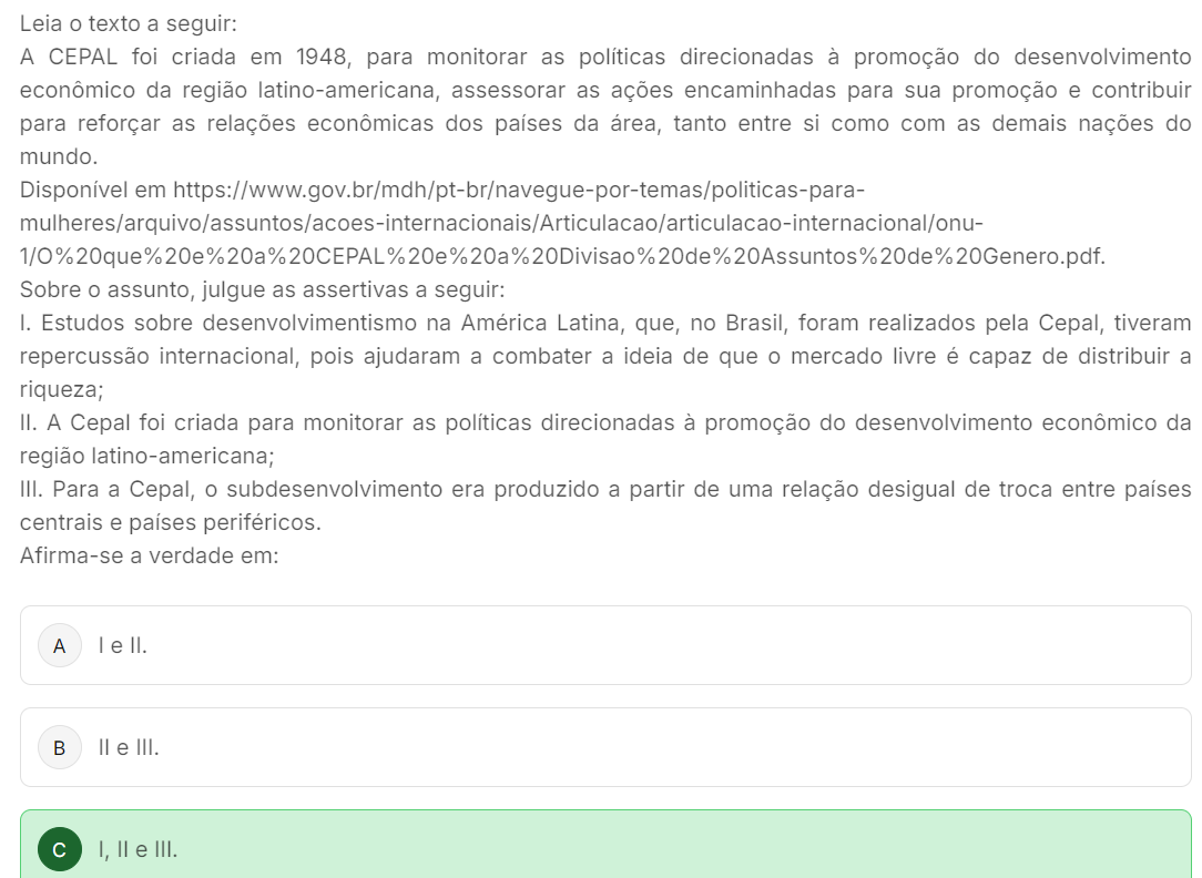 <p>Leia texto a seguir: A CEPAL foi criada em 1948, para monitorar as políticas direcionadas à promoção do desenvolvimento econômico da região latino-americana, assessorar as ações encaminhadas para sua promoção e contribuir para as relações econômicas dos países da área, tanto entre si como com as demais nações do mundo. Disponível em https://www.gov.br/mdh/pt-br/navegue-por-temas/politicas-para Sobre assunto, julgue as assertivas a seguir: I. Estudos sobre desenvolvimentismo na América Latina, que, no Brasil, foram realizados pela Cepal, tiveram repercussão internacional, pois ajudaram a combater a ideia de que o mercado livre é capaz de distribuir a riqueza; II. A Cepal foi criada para monitorar as políticas direcionadas à promoção do desenvolvimento econômico da região latino-americana; III. Para a Cepal, subdesenvolvimento era produzido a partir de uma relação desigual de troca entre países centrais e países periféricos. Afirma-se a verdade em: A I e II. B e III. C I, e III.</p>