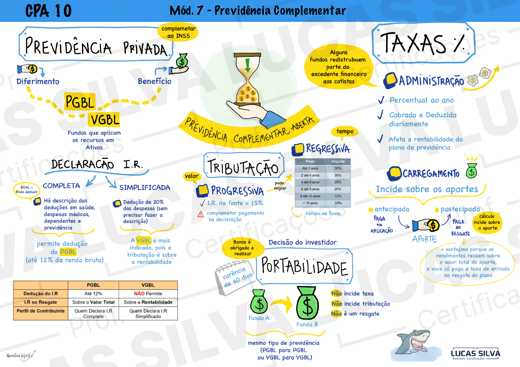 <p>CPA 10 Mód. 7 - Previdência Complementar complemetar ao INSS PRIVADA US TAXAS Alguns fundos redistrubuem parte do excedente financeiro Diferimento Benefício aos cotistas ADMINISTRAÇÃO PGBL Percentual ao ano Cobrado e Deduzido VGBL COMPLEMENTAR ABERTA diariamente Fundos que aplicam tempo os recursos em Afeta a rentabilidade do Ativos REGRESSIVA plano de previdência Prazo tific DECLARACAO I.R. Até anos 35% valor 2 até anos CARREGAMENTO $ 30% pode 4 até anos 25% PGBL COMPLETA SIMPLIFICADA PROGRESSIVA migrar 6 até anos 20% Pode deduzir Incide sobre os aportes 8 até 10 anos 15% Há descrição das Dedução de 20% I.R. na fonte = 15% 10 anos 10% deduções em saúde, das despesas (sem antecipada postecipada despesas médicas, precisar fazer a complemetar pagamento retido na fonte dependentes e na declaração PAGA cálculo descrição) PAGA incide sobre na previdência NO o aporte RESGATE A VGBL é mais permite dedução Banco é Decisão do investidor APoRTE indicada, pois a obrigado a do PGBL + vantajoso porque os tributação é sobre realizar rendimentos recaem sobre (até 12% da renda bruta) a rentabilidade PORTABILIDADE o valor total do aporte, e voce só paga a taxa de entrada de 60 no resgate do plano PGBL VGBL Dedução do I.R Até 12% NÃO Permite Não incide taxa I.R no Resgate Sobre o Valor Total Sobre a Rentabilidade $ Perfil de Contribuinte Quem Declara I.R Quem Declara I.R $ Não incide tributação Completo Simplificado Não é um resgate fundo A Fundo B mesmo tipo de previdência (PGBL para PGBL Prof. NarraTiva LUCAS SILVA ou VGBL para VGBL) Certificações</p>