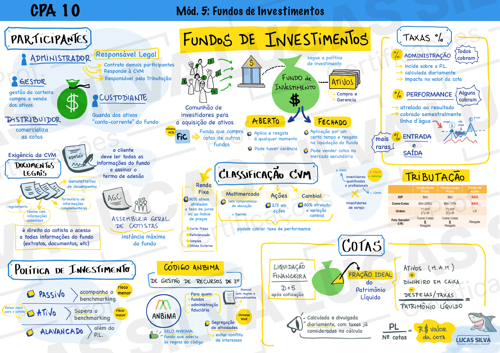 <p>CPA 10 Mód. 5: Fundos de Investimentos PARTICIPANTES FUNDOS DE INVESTIMENTOS TAXAS % Todos ADMINISTRADOR Responsável Legal a política % ADMINISTRAÇÃO cobram Contrata demais participantes $ de investimento incide sobre o P.L. Responde à CVM calculada diariamente Responsável pela Tributação FUNDO de GESTOR impacta no valor da cota INVESTIMENTO gestão da carteira CUSTODIANTE Compra e % PERFORMANCE Alguns compra e venda Gerencia cobram dos ativos Comunhão de atrelado ao resultado Guarda dos ativos investidores para cobrado semestralmente DISTRIBUIDOR paga "conta-corrente" do fundo a aquisição de ativos ABERTO FECHADO linha paga não paga comercializa mínimo 95% Fundo que compra Aplica e resgata Aplicação por um as cotas Fic cotas de outros a qualquer momento certo tempo e resgate mais ENTRADA fundos na liquidação do fundo raras e o cliente Pode haver carência Pode vender cotas no Exigência da CVM SAÍDA deve ler todas as mercado secundário DOCUMENTOS informações do fundo e assinar o 1mm LEGAiS risco termo de adesão investidores retorno demonstrativo qualificados de desempenho Renda e profissionais Fundo Curto Fundo Longo Fundo de Fixa Prazo 10mm Prazo Multimercado AGC Ações Cambial IOF Sim Sim NÃO formulário de 80% ativos informações sem compromisso atrelados investidores 2/3 em 80% atrelado Come-Cotas Sim (20%) Sim (15% NÃO regulamento de alocação complementares a taxa de juros de varejo com ações a variação 1°) IOF 1°) IOF Ordem I.R ou ao índice + flexível I.R informações cambial essenciais ASSEMBLEIA GERAL de preços Come Cotas Come Cotas Fato Gerador DE COTISTAS (I.R) E E Resgate Resgate Resgate é direito do cotista o acesso Curto Prazo podem cobrar taxa de performance a todas informações do fundo instância máxima Referenciado (extratos, documentos, etc) do fundo Simples Dívida Externa COTAS POLÍTICA DE INVESTIMENTO ANBIMA LIQUIDAÇÃO (M.A.M.) FRAÇÃO IDEAL DE GESTAO DE RECURSOS DE do EM CAiXA risco Manual D+5 PASSIVO acompanha o Patrimônio menor Para quem: com regras e após cotização benchmarking fundos procedimentos Líquido DESPESAS/TAXAS administração Deixar para cotista ATiVo Supera o risco fiduciária maior Chinese benchmarking Wall Calculada e divulgada Segregação diariamente, com taxas já além do de atividades PL ALAVANCADO SELO ANBIMA: consideradas no cálculo = valoR P.L. fundo que aderiu evitar conflito cotas da COTA às regras do código de interesses LUCAS SILVA Certificações</p>