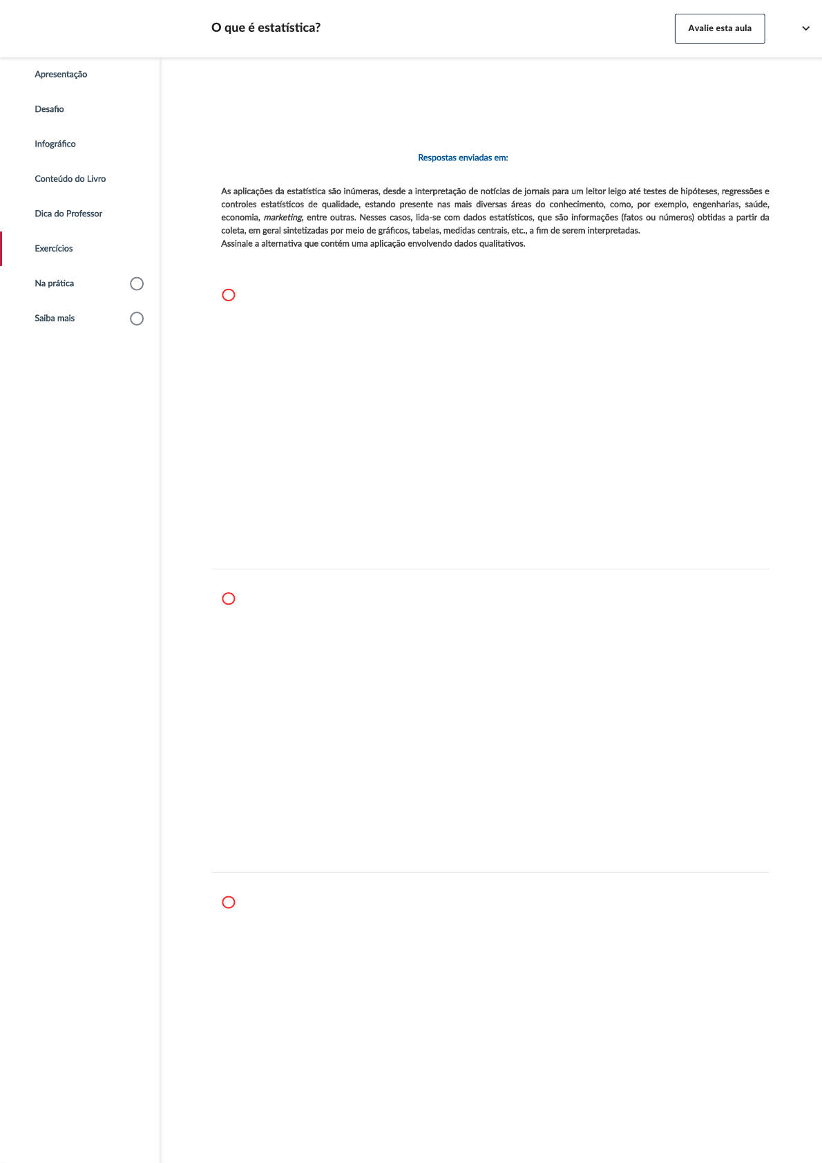 <p>Exercícios</p><p>Respostas enviadas em: 07/09/2024 10:48</p><p>3. As aplicações da esta�s�ca são inúmeras, desde a interpretação de no�cias de jornais para um leitor leigo até testes de hipóteses, regressões e</p><p>controles esta�s�cos de qualidade, estando presente nas mais diversas áreas do conhecimento, como, por exemplo, engenharias, saúde,</p><p>economia, marke�ng, entre outras. Nesses casos, lida-se com dados esta�s�cos, que são informações (fatos ou números) ob�das a par�r da</p><p>coleta, em geral sinte�zadas por meio de gráficos, tabelas, medidas centrais, etc., a fim de serem interpretadas.</p><p>Assinale a alterna�va que contém uma aplicação envolvendo dados qualita�vos.</p><p>Resposta incorreta.</p><p>A. Análise do percentual de peças defeituosas, com base na coleta diária da quantidade de peças defeituosas produzidas em</p><p>uma indústria.</p><p>Dados quantitativos: informações numéricas que quantificam algo. Sendo assim, seus valores são sempre</p><p>expressos por números. Os dados quantitativos podem ser discretos (provenientes de contagem, ou seja,</p><p>apenas números inteiros) ou contínuos (provenientes de medida, expressos por um número real, inteiro ou não).</p><p>Dados qualitativos: informações não númericas que identificam uma característica dos elementos investigados.</p><p>Os dados qualitativos podem ser respostas de nomes, locais, incidência, ou não de uma doença (em geral,</p><p>respostas como sim ou não), cor de pele, entre outras.</p><p>A quantidade de peças defeituosas de uma indústria é um dado quantitativo.</p><p>O percentual de desempregados de uma cidade é calculado com dados quantitativos.</p><p>A análise da variação do número de atendimentos em uma unidade de emergência é feita com dados</p><p>quantitativos.</p><p>A análise da variação do percentual de crianças com vacinação em dia em uma unidade básica de saúde nos</p><p>últimos 12 meses contém dados quantitativos.</p><p>A construção do perfil dos clientes de uma loja com base no sexo e na escolaridade contém dados qualitativos</p><p>vindo das variáveis sexo e escolaridade.</p><p>Resposta incorreta.</p><p>B. Análise do percentual de desempregados em uma cidade com base na coleta do número de desempregados nos últimos 12</p><p>meses.</p><p>Dados quantitativos: informações numéricas que quantificam algo. Sendo assim, seus valores são sempre</p><p>expressos por números. Os dados quantitativos podem ser discretos (provenientes de contagem, ou seja,</p><p>apenas números inteiros) ou contínuos (provenientes de medida, expressos por um número real, inteiro ou não).</p><p>Dados qualitativos: informações não númericas que identificam uma característica dos elementos investigados.</p><p>Os dados qualitativos podem ser respostas de nomes, locais, incidência, ou não de uma doença (em geral,</p><p>respostas como sim ou não), cor de pele, entre outras.</p><p>A quantidade de peças defeituosas de uma indústria é um dado quantitativo.</p><p>O percentual de desempregados de uma cidade é calculado com dados quantitativos.</p><p>A análise da variação do número de atendimentos em uma unidade de emergência é feita com dados</p><p>quantitativos.</p><p>A análise da variação do percentual de crianças com vacinação em dia em uma unidade básica de saúde nos</p><p>últimos 12 meses contém dados quantitativos.</p><p>A construção do perfil dos clientes de uma loja com base no sexo e na escolaridade contém dados qualitativos</p><p>vindo das variáveis sexo e escolaridade.</p><p>Resposta incorreta.</p><p>C. Análise da variação do número de atendimentos em uma unidade de emergência nos últimos 30 dias.</p><p>Dados quantitativos: informações numéricas que quantificam algo. Sendo assim, seus valores são sempre</p><p>expressos por números. Os dados quantitativos podem ser discretos (provenientes de contagem, ou seja,</p><p>apenas números inteiros) ou contínuos (provenientes de medida, expressos por um número real, inteiro ou não).</p><p>Dados qualitativos: informações não númericas que identificam uma característica dos elementos investigados.</p><p>Os dados qualitativos podem ser respostas de nomes, locais, incidência, ou não de uma doença (em geral,</p><p>respostas como sim ou não), cor de pele, entre outras.</p><p>A quantidade de peças defeituosas de uma indústria é um dado quantitativo.</p><p>O percentual de desempregados de uma cidade é calculado com dados quantitativos.</p><p>A análise da variação do número de atendimentos em uma unidade de emergência é feita com dados</p><p>quantitativos.</p><p>A análise da variação do percentual de crianças com vacinação em dia em uma unidade básica de saúde nos</p><p>últimos 12 meses contém dados quantitativos.</p><p>A construção do perfil dos clientes de uma loja com base no sexo e na escolaridade contém dados qualitativos</p><p>vindo das variáveis sexo e escolaridade.</p><p></p><p>Anterior</p><p>Dica do Professor</p><p>Próximo</p><p>Na prá�ca Apresentação</p><p>Desafio</p><p>Infográfico</p><p>Conteúdo do Livro</p><p>Dica do Professor</p><p>Exercícios</p><p>Na prá�ca</p><p>Saiba mais</p><p> </p><p> </p><p> </p><p> </p><p> </p><p> </p><p> </p><p> </p><p>O que é esta�s�ca? Avalie esta aula CS </p><p>Resposta correta.</p><p>D. Construção do perfil do cliente de uma loja com base em dados de sexo e escolaridade.</p><p>Dados quantitativos: informações numéricas que quantificam algo. Sendo assim, seus valores são sempre</p><p>expressos por números. Os dados quantitativos podem ser discretos (provenientes de contagem, ou seja,</p><p>apenas números inteiros) ou contínuos (provenientes de medida, expressos por um número real, inteiro ou não).</p><p>Dados qualitativos: informações não númericas que identificam uma característica dos elementos investigados.</p><p>Os dados qualitativos po