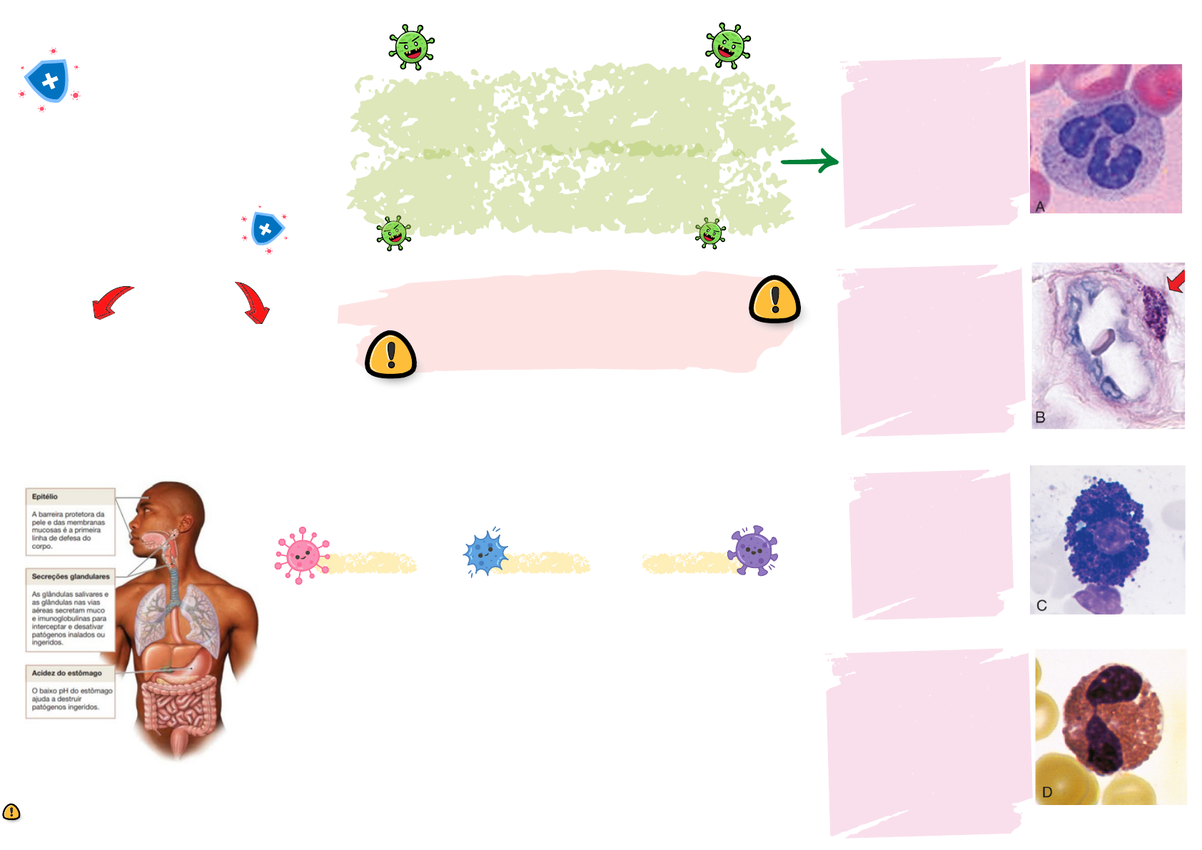 <p>A IMUNIDADE INATA (NATURAL) É ASSIM DENOMINADA PORQUE</p><p>ESTÁ PRESENTE DESDE O NASCIMENTO E NÃO PRECISA SER</p><p>APRENDIDA ATRAVÉS DA EXPOSIÇÃO DE UM INVASOR. ASSIM, ELA</p><p>OFERECE UMA RESPOSTA IMEDIATA A INVASÕES ESTRANHAS.</p><p>BARREIRAS DE DEFESA</p><p>A resposta imune inata combate</p><p>microrganismos por meio de duas</p><p>reações principais — pelo recrutamento</p><p>de fagócitos e outros leucócitos que</p><p>destroem os microrganismos, no</p><p>processo chamado inflamação; e pelo</p><p>bloqueio da replicação viral ou pelo</p><p>killing de células infectadas por vírus,</p><p>sem a necessidade de uma reação</p><p>inflamatória.</p><p>RESPOSTA IMUNE</p><p>INATA Basófilos:</p><p>Assim como outros granulócitos,</p><p>os basófilos derivam de</p><p>precursores hematopoiéticos,</p><p>amadurecem na medula óssea e</p><p>circulam no sangue. Embora</p><p>normalmente estejam ausentes nos</p><p>tecidos, os basófilos podem ser</p><p>recrutados para alguns sítios</p><p>inflamatórios.</p><p>São granulócitos que expressam</p><p>grânulos citoplasmáticos contendo</p><p>enzimas nocivas às paredes celulares de</p><p>parasitas, mas que também podem</p><p>danificar os tecidos do hospedeiro.</p><p>Estão presentes nos tecidos periféricos,</p><p>em especial nos revestimentos de</p><p>mucosa dos tratos respiratório,</p><p>gastrintestinal e geniturinário, e seu</p><p>número pode aumentar por meio do</p><p>recrutamento a partir do sangue que</p><p>ocorre no contexto da inflamação.</p><p>A principal função dos neutrófilos é</p><p>fagocitar microrganismos,</p><p>especialmente microrganismos</p><p>opsonizados, e produtos de células</p><p>necróticas, bem como destruir esse</p><p>material nos fagolisossomos. Em</p><p>adição, os neutrófilos produzem</p><p>conteúdos de grânulos e substâncias</p><p>antimicrobianas que matam</p><p>microrganismos extracelulares, mas</p><p>também danificam tecidos sadios.</p><p>MECANISMO DE DEFESA</p><p>INICIAL:</p><p>FÍSICA</p><p>Podemos citar a pele,</p><p>saliva, muco e pelos. Esses</p><p>componentes irão filtrar</p><p>partículas indesejadas e</p><p>impedir a entrada de</p><p>microorganismo e</p><p>substâncias nocivas.</p><p>Neutrófilos:</p><p>O sistema imune inato também</p><p>reconhece moléculas endógenas</p><p>que são produzidas ou liberadas</p><p>por células danificadas ou que</p><p>estão morrendo. Essas</p><p>substâncias são chamadas</p><p>padrões moleculares associados</p><p>ao dano (DAMPs). Podem ser</p><p>produzidos como resultado de</p><p>dano celular causado por</p><p>infecções, mas também podem</p><p>indicar lesão estéril causada por</p><p>toxinas químicas, queimaduras,</p><p>traumatismo ou perda do</p><p>suprimento sanguíneo.</p><p>Os PAMPs (Padrões</p><p>Moleculares Associados a</p><p>Patógenos) são substâncias</p><p>microbianas que estimulam a</p><p>imunidade inata. Eles</p><p>incluem ácidos nucleicos,</p><p>proteínas, lipídeos de parede</p><p>celular e carboidratos. Esses</p><p>produtos microbianos são</p><p>essenciais para a</p><p>sobrevivência dos patógenos,</p><p>e o reconhecimento deles</p><p>pelas células de defesa do</p><p>nosso organismo é crucial.</p><p>QUÍMICA</p><p>Podemos citar o ácido</p><p>estomacal e as enzimas,</p><p>que irão atual eliminando</p><p>os patógenos e</p><p>destruindo a parede</p><p>celular bacteriana.</p><p>CÉLULAS FAGOCITÁRIAS</p><p>AS RESPOSTAS FUNCIONAIS DOS FAGÓCITOS NA DEFESA DO</p><p>HOSPEDEIRO CONSISTEM EM ETAPAS SEQUENCIAIS:</p><p>RECRUTAMENTO DAS CÉLULAS PARA OS SÍTIOS DE INFECÇÃO,</p><p>RECONHECIMENTO E ATIVAÇÃO POR MICRORGANISMOS,</p><p>INGESTA DOS MICRORGANISMOS ATRAVÉS DO PROCESSO DE</p><p>FAGOCITOSE, E DESTRUIÇÃO DOS MICRORGANISMOS</p><p>INGERIDOS. ADICIONALMENTE, POR MEIO DO CONTATO</p><p>DIRETO E SECREÇÃO DE CITOCINAS, OS FAGÓCITOS SE</p><p>COMUNICAM COM OUTRAS CÉLULAS DE MANEIRA A PROMOVER</p><p>OU REGULAR AS RESPOSTAS IMUNES.</p><p>Mastócitos:</p><p>São células derivadas da medula</p><p>óssea presentes nos epitélios da</p><p>pele e das mucosas, liberam</p><p>mediadores inflamatórios potentes</p><p>que conferem defesa contra</p><p>infecções por parasitas ou</p><p>produzem os sintomas das doenças</p><p>alérgicas. Uma citocina chamada</p><p>fator da célula-tronco (ou c-Kit-</p><p>ligante) é essencial ao</p><p>desenvolvimento do mastócito.</p><p>Eosinófilos:</p><p>PAMPsDAMPs RRP</p><p>Esses receptores são expressos na</p><p>superfície, em vesículas fagocíticas</p><p>e no citosol de vários tipos</p><p>celulares. Quando esses receptores</p><p>de reconhecimento de padrão</p><p>célula-associados se ligam aos</p><p>PAMPs e DAMPs, ativam vias de</p><p>transdução de sinal que promovem</p><p>as funções antimicrobianas e pró-</p><p>inflamatórias das células que os</p><p>expressam. São responsáveis pela</p><p>facilitação da depuração de</p><p>microrganismos do sangue e dos</p><p>fluidos extracelulares, por meio da</p><p>intensificação da captação para</p><p>dentro dos fagócitos ou pela</p><p>ativação de mecanismos de killing</p><p>extracelular.</p><p>ALUNAS: Anna Carla Lopes de Ferraz dos Santos, Anna Heloísa</p><p>Mucha, Maria Eduarda Rinaldi, Edinéia Vais Simon e Larissa Pereira</p><p>SISTEMA COMPLEMENTO:</p><p>O SISTEMA COMPLEMENTO CONSISTE EM VÁRIAS PROTEÍNAS</p><p>PLASMÁTICAS QUE TRABALHAM CONJUNTAMENTE NA</p><p>OPSONIZAÇÃO DE MICRORGANISMOS, PROMOÇÃO DE</p><p>RECRUTAMENTO DE FAGÓCITOS PARA O SÍTIO DE INFECÇÃO E,</p><p>EM ALGUNS CASOS, NA DESTRUIÇÃO DIRETA DOS</p><p>MICRORGANISMOS. A ATIVAÇÃO DO COMPLEMENTO ENVOLVE</p><p>CASCATAS PROTEOLÍTICAS EM QUE A ENZIMA PRECURSORA</p><p>INATIVA, CHAMADA ZIMOGÊNIO, É MODIFICADA PARA SE</p><p>TORNAR UMA PROTEASE ATIVA QUE CLIVA E, ASSIM, INDUZ A</p><p>ATIVIDADE PROTEOLÍTICA DA PRÓXIMA PROTEÍNA DO</p><p>COMPLEMENTO NA CASCATA.</p><p>CÉLULAS DO SISTEMA IMUNE</p><p>mantém defesas físicas e químicas nas</p><p>barreir