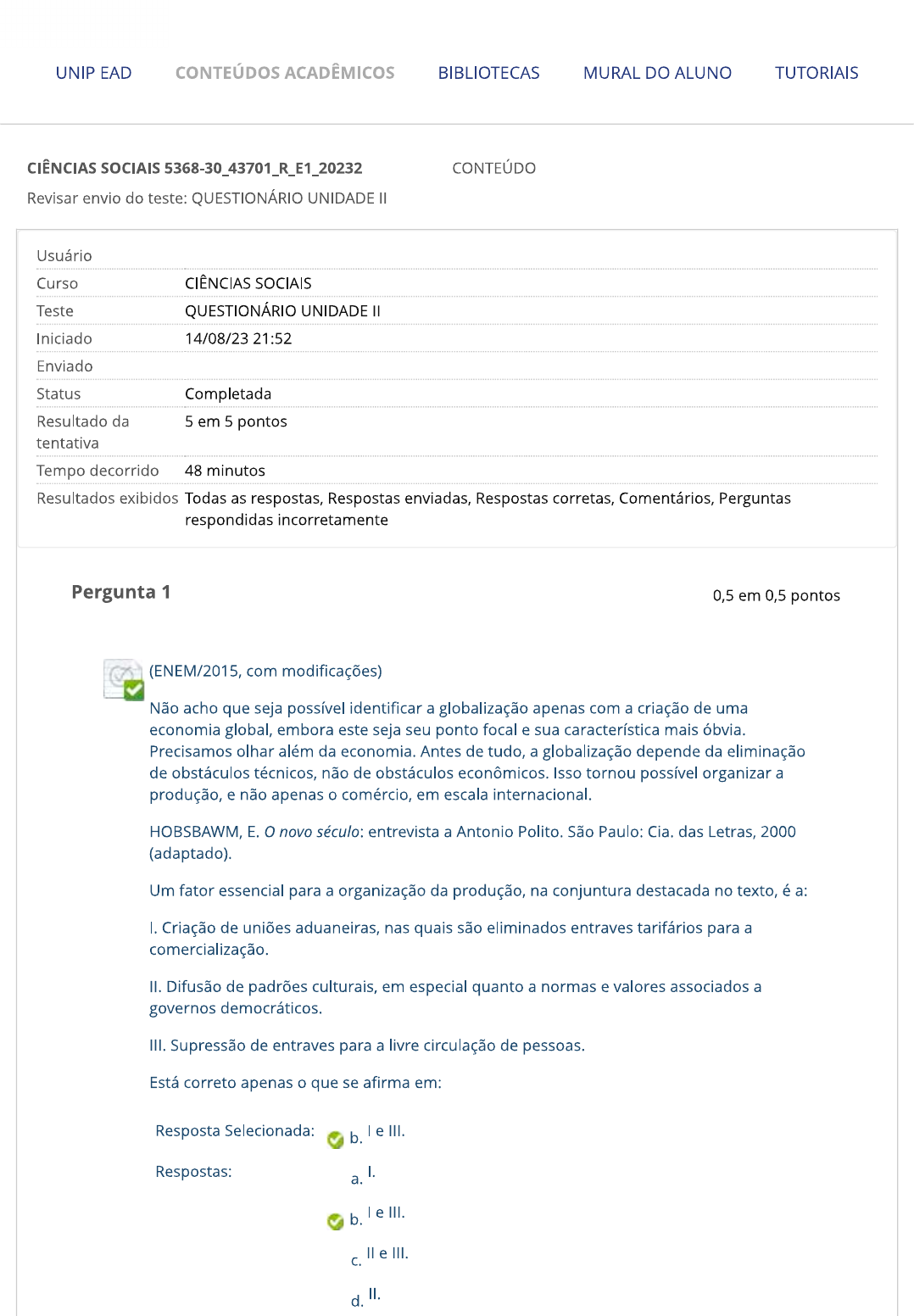<p>UNIP EAD CONTEÚDOS ACADÊMICOS BIBLIOTECAS MURAL DO ALUNO TUTORIAIS CIÊNCIAS SOCIAIS 5368-30_43701_R_E1_20232 CONTEÚDO Revisar envio do teste: QUESTIONÁRIO UNIDADE II Usuário Curso CIÊNCIAS SOCIAIS Teste QUESTIONÁRIO UNIDADE Iniciado 14/08/23 21:52 Enviado Status Completada Resultado da 5 em 5 pontos tentativa Tempo decorrido 48 minutos Resultados exibidos Todas as respostas, Respostas enviadas, Respostas corretas, Comentários, Perguntas respondidas incorretamente Pergunta 1 0,5 em 0,5 pontos (ENEM/2015, com modificações) Não acho que seja possível identificar a globalização apenas com a criação de uma economia global, embora este seja seu ponto focal e sua característica mais óbvia. Precisamos olhar além da economia. Antes de tudo, a globalização depende da eliminação de obstáculos técnicos, não de obstáculos econômicos. Isso tornou possível organizar a produção, e não apenas o comércio, em escala internacional. HOBSBAWM, E. novo século: entrevista a Antonio Polito. São Paulo: Cia. das Letras, 2000 (adaptado). Um fator essencial para a organização da produção, na conjuntura destacada no texto, é a: I. Criação de uniões aduaneiras, nas quais são eliminados entraves tarifários para a comercialização. II. Difusão de padrões culturais, em especial quanto a normas e valores associados a governos democráticos. III. Supressão de entraves para a livre circulação de pessoas. Está correto apenas o que se afirma em: Resposta Selecionada: b. e III. Respostas: I. a. b. e III. e III. C.</p><p>I, II, III. e. Comentário da B. resposta: Comentário: A questão fala de obstáculos técnicos, tais como entraves para a livre circulação de bens, mercadorias e pessoas. Não há qualquer associação entre obstáculo à globalização e difusão de valores democráticos. Pergunta 2 0,5 em 0,5 pontos (ENEM/2015, com modificações) No final do século XX e em razão dos avanços da ciência, produziu-se um sistema presidido pelas técnicas da informação, que passaram a exercer um papel de elo entre as demais, unindo-as e assegurando ao novo sistema uma presença planetária. Um mercado que utiliza esse sistema de técnicas avançadas resulta nessa globalização perversa. SANTOS, M. Por uma outra globalização. Rio de Janeiro: Record, 2008 (adaptado). Uma consequência para o setor produtivo e outra para o mundo do trabalho advindas das transformações citadas no texto estão presentes, respectivamente, em: I. Limitação dos fluxos logísticos e fortalecimento de associações sindicais. II. Aumento dos investimentos industriais e valorização dos postos qualificados. III. Automatização dos processos fabris e aumento dos níveis de desemprego. Está correto apenas o que se afirma em: Resposta Selecionada: d. e III. Respostas: a. I. b. II. C. III. d. e III. e. e II. Comentário Resposta: D. da resposta: Comentário: Não houve fortalecimento das associações sindicais ao tempo da globalização; ao contrário, houve um enfraquecimento delas em função do aumento da informalidade no trabalho e do combate às regras e normas trabalhistas por parte das empresas. Tal contexto tornou mais dramática a questão do desemprego, em todo o mundo. Pergunta 3 0,5 em 0,5 pontos</p><p>(ENEM/2015, com modificações) Um carro esportivo é financiado pelo Japão, projetado na Itália e montado em Indiana, México e França, usando os mais avançados componentes eletrônicos, que foram inventados em Nova Jérsei e fabricados na Coreia. A campanha publicitária é desenvolvida na Inglaterra, filmada no Canadá, a edição e as cópias, feitas em Nova York para serem veiculadas no mundo todo. Teias globais disfarçam-se com o uniforme nacional que lhes for mais conveniente. REICH, R. trabalho das nações: preparando-nos para o capitalismo no século XXI. São Paulo: Educator, 1994 (adaptado). A viabilidade do processo de produção ilustrado pelo texto pressupõe o uso de: I. Linhas de montagem e formação de estoques. II. Empresas com estruturas flexíveis e adaptáveis e mão de obra barata. III. Organização em rede e tecnologia de informação. IV. Gestão centralizada e protecionismo econômico. Está correto apenas o que se afirma em: Resposta Selecionada: I, e III. e. Respostas: a. IV. b. II. d. II e IV. I, e III. e. Comentário Resposta: E. da resposta: Comentário: O discurso globalizador combate o protecionismo econômico sob o argumento de que as empresas devem competir em igualdade de condições, sem favorecimentos ou restrições de qualquer tipo. Os demais fatores citados nos outros itens são típicos de economias e linhas de produção globalizadas. Pergunta 4 0,5 em 0,5 pontos (UFAL, com modificações) Um dos temas mais debatidos na atualidade é a globalização. Sobre esse tema, considere as afirmativas a seguir I. A globalização das comunicações tem sua face mais destacada na rede mundial de computadores, que permite um intenso fluxo de troca de ideias e informações. II. A globalização do final do século XX tem as mesmas características do intenso comércio internacional da época do mercantilismo.</p><p>III. A globalização das comunicações aumentou a universalização do acesso a meios de comunicação, eliminando as desigualdades sociais existentes entre países desenvolvidos e os em desenvolvimento. IV. Os efeitos da globalização no mercado de trabalho são evidentes com a criação de modalidades de emprego para países com mão de obra mais barata voltada à execução de serviços que não exigem alta qualificação. V. A globalização intensifica o ritmo das mudanças nos meios de produção, tendendo a um aumento de tecnologias limpas e sustentáveis. Está correto apenas o que se afirma em: Resposta Selecionada: e IV. e. Respostas: a. e II. b. III e IV. e V. C. d. I, e III. e. e IV. Comentário Resposta: E. da resposta: Comentário: A globalização do final do século XX não apresenta as mesmas característic
