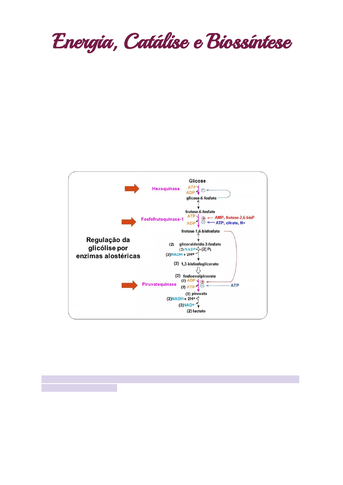 <p>Ana Carolina Rossignoli; Júlia Souza; Mayara Aguiar</p><p>Energia, Catálise e Biossíntese</p><p>Energia: é a capacidade de algo em realizar trabalho. Nosso corpo precisa de energia para</p><p>realizar inúmeros trabalhos importantes para a manutenção do metabolismo</p><p>● A energia é adquirida pelo ser humano, principalmente, por meio das vias de</p><p>alimentação. Com essa energia recebida pelas moléculas de alimento o organismo é</p><p>capaz de produzir novas moléculas, sintetizar substâncias. Assim como, as células</p><p>são capazes de realizar reações químicas.</p><p>● As células podem armazenar energia na forma de ligação química.</p><p>Reação química:</p><p>● Cada reação química precisa de uma enzima específica para ocorrer.</p><p>● As enzimas são catalisadores utilizados para aumentar a velocidade da reação</p><p>diminuindo a energia de ativação.</p><p>- Ex:</p><p>A glicose é fosforilada pela hexoquinase, gerando glicose 6 fosfato, para a glicose não sair</p><p>da célula (novamente para a corrente sanguínea)</p><p>A glicose 6 fosfato pela isomerase (porque a glicose e a frutose são substâncias isômeras)</p><p>se converte em frutose 6 fosfato</p><p>As quinases (adicionam grupo fosfato), assim como as isomerases (modificam isômeros),</p><p>fazem o mesmo tipo de reação, mas cada uma tem um substrato específico.</p><p>Resumindo: A reação da glicólise foi empregada para demonstrar a especificidade da</p><p>enzima ao seu substrato.</p><p>→ Vias metabólicas formam rede complexa de reações interconectadas ←</p><p>Isso demonstra que o processo é todo dependente das partes, logo, ao inibir uma enzima,</p><p>todo o processo será inibido.</p><p>ex: estatinas → classe de medicamentos que inibem uma enzima, e ao inibir essa enzima</p><p>eles inibem toda a síntese endógena de colesterol.</p><p>1</p><p>Ana Carolina Rossignoli; Júlia Souza; Mayara Aguiar</p><p>Metabolismo: É o conjunto de reações químicas do organismo: Anabolismo + Catabolismo.</p><p>● Anabolismo: Junção/ Síntese (com absorção de energia), de estruturas menores</p><p>dando origem a uma estrutura maior. → “Construção de moléculas mais complexas</p><p>a partir de molécula mais simples”</p><p>- Não é espontâneo.</p><p>- Desfavorável</p><p>- Ex: Anabolizantes, Fotossíntese, Quimiossíntese..</p><p>● Catabolismo: Quebra (liberação de energia), de estruturas mais complexas</p><p>originando estruturas mais simples.</p><p>- Espontâneo - gera desordem</p><p>- Favorável</p><p>- Ex: Quebra da glicose, Fermentação, Respiração Celular...</p><p>2</p><p>Ana Carolina Rossignoli; Júlia Souza; Mayara Aguiar</p><p>→ Respiração Celular é dividida em:</p><p>1- Glicólise</p><p>2- Ciclo de Krebs</p><p>3- Cadeia Respiratória</p><p>→ O CO2 é resultante da quebra da glicose.</p><p>- As vias catabólicas: Iniciam a partir de moléculas de alimento → A gente come</p><p>carboidrato, lipídio e proteína, que precisam ser quebrados para que o nosso corpo</p><p>consiga absorver a energia provida de cada uma dessas substâncias.</p><p>→ As vias anabólicas são o inverso.</p><p>Uso de energia pelas células:</p><p>● Termodinâmica: “Estudo das leis que regem as relações entre calor, trabalho e</p><p>outras formas de energia, mais especificamente a transformação de um tipo de</p><p>energia em outra, a disponibilidade de energia para a realização de trabalho e a</p><p>direção das trocas de calor.”</p><p>→ Uma energia é sempre convertida em outra energia ←</p><p>Essa energia gera disponibilidade para realização de trabalho dentro das células. Nem</p><p>sempre toda energia vai ser transformada em outro tipo, pode acontecer de haver perda de</p><p>uma parte de energia em forma de calor</p><p>● Segunda lei da Termodinâmica: tendência universal de as coisas tornarem-se</p><p>desordenadas. Os locais têm tendência sempre a aumentar o grau da desordem e o</p><p>movimento da direção da desordem é espontâneo e para revertê-lo é necessário um</p><p>esforço periódico.</p><p>Uma célula isolada não obedece a segunda lei, enquanto uma célula no sistema</p><p>obedece a segunda lei e causa desordem no sistema.</p><p>- Entropia: Mede o grau de desordem do sistema.</p><p>- Parte da energia que as células usam, é convertida em calor</p><p>- Calor = energia em sua forma mais desordenada</p><p>De onde vem o calor? A energia pode ser convertida, mas nunca criada ou destruída.</p><p>- Dentro das nossas células essa energia geralmente é convertida em energia química</p><p>e em energia térmica.</p><p>3</p><p>Ana Carolina Rossignoli; Júlia Souza; Mayara Aguiar</p><p>→ As células animais, através do alimento, converte parte da energia presente nas ligações</p><p>químicas em movimento térmico de moléculas e a energia química em energia cinética.</p><p>● Fotossíntese: Conversão de energia eletromagnética, da luz, em energia de ligação</p><p>química.</p><p>● Respiração Celular: Tanto nas plantas, como nos animais a energia é retirada das</p><p>moléculas de alimentos por um processo de OXIDAÇÃO gradual.</p><p>Uma célula, portanto, é capaz de obter energia a partir dos açúcares ou de outras</p><p>moléculas orgânicas porque possibilita que os átomos de carbono e de hidrogênio</p><p>dessas moléculas se combinam como o oxigênio, isto é, tornam-se oxidadas</p><p>produzindo gás carbônico e água.</p><p>Reações de oxi-redução:</p><p>● Oxidação: Perda de elétrons (retirando H) e adição de oxigênio</p><p>- Os elementos menos eletronegativos da tabela tem mais facilidade em oxidar</p><p>- Reações de desidrogenação</p><p>● Redução: Ganho de elétrons (colocando H)</p><p>- Os elementos mais eletronegativos da tabela tem mais facilidade em reduzir</p><p>- Reações de Hidrogenação</p><p>→ Na reação da respiração:</p><p>1- Glicose oxida em CO2</p><p>2- Oxigênio reduz em H