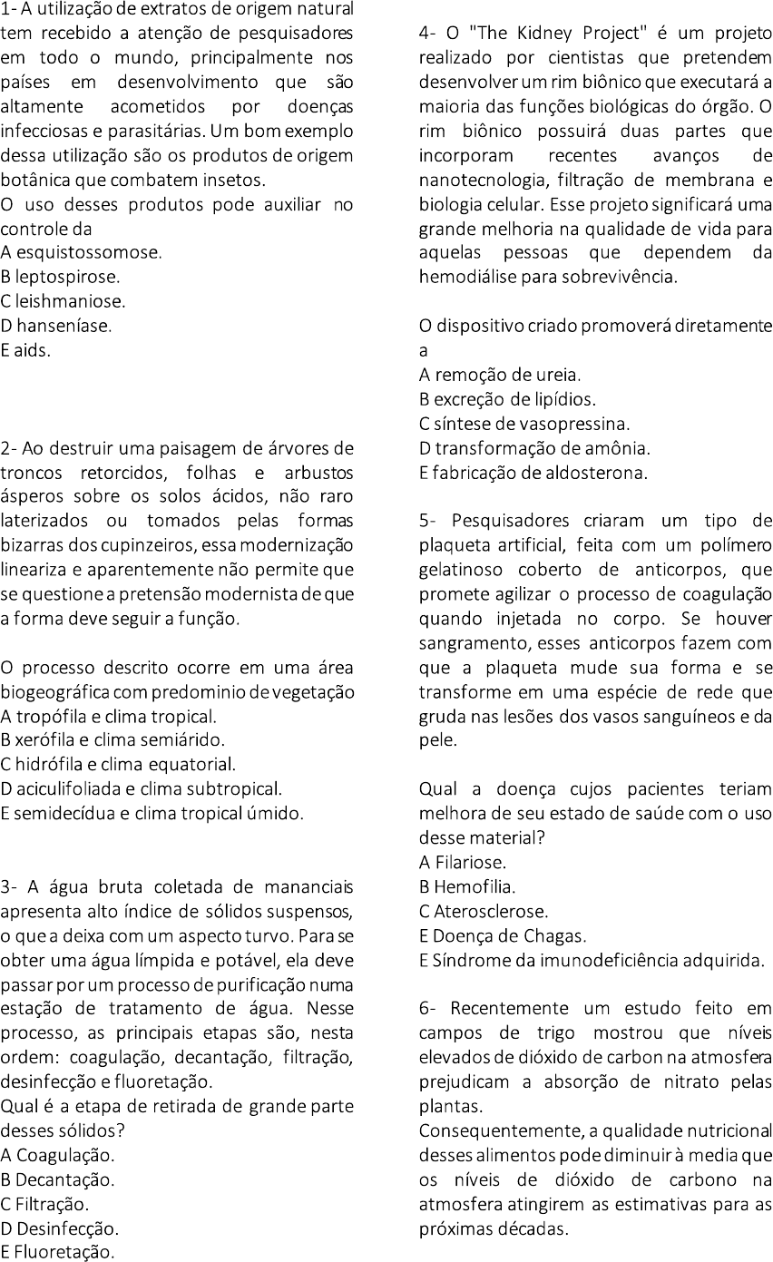<p>1- A utilização de extratos de origem natural tem recebido a atenção de pesquisadores 4- O "The Kidney Project" é um projeto em todo o mundo, principalmente nos realizado por cientistas que pretendem países em desenvolvimento que são desenvolver um rim biônico que executará a altamente acometidos por doenças maioria das funções biológicas do O infecciosas e parasitárias. Um bom exemplo rim biônico possuirá duas partes que dessa utilização são os produtos de origem incorporam recentes avanços de botânica que combatem insetos. nanotecnologia, filtração de membrana e O uso desses produtos pode auxiliar no biologia celular. Esse projeto significará uma controle da grande melhoria na qualidade de vida para A esquistossomose. aquelas pessoas que dependem da B leptospirose. hemodiálise para sobrevivência. C leishmaniose. D hanseníase. O dispositivo criado promoverá diretamente E aids. a A remoção de ureia B excreção de lipídios. C síntese de vasopressina. Ao destruir uma paisagem de árvores de D transformação de amônia. troncos retorcidos, folhas e arbustos E fabricação de aldosterona. ásperos sobre os solos ácidos, não raro laterizados ou tomados pelas formas 5- Pesquisadores criaram um tipo de bizarras dos cupinzeiros, essa modernização plaqueta artificial, feita com um polímero lineariza e aparentemente não permite que gelatinoso coberto de anticorpos, que se questione a pretensão modernista de que promete agilizar o processo de coagulação a forma deve seguir a função. quando injetada no corpo. Se houver sangramento, esses anticorpos fazem com O processo descrito ocorre em uma área que a plaqueta mude sua forma e se biogeográfica com predominio de vegetação transforme em uma espécie de rede que A tropófila e clima tropical. gruda nas lesões dos vasos sanguíneos e da B xerófila e clima semiárido. pele. C hidrófila e clima equatorial. D aciculifoliada e clima subtropical. Qual a doença cujos pacientes teriam E semidecídua e clima tropical úmido. melhora de seu estado de saúde com o uso desse material? A Filariose. 3- A água bruta coletada de mananciais B Hemofilia. apresenta alto índice de sólidos suspensos, C Aterosclerose. o que a deixa com um aspecto turvo. Para se E Doença de Chagas. obter uma água límpida e potável, ela deve E Síndrome da imunodeficiência adquirida. passar por um processo de purificação numa estação de tratamento de água. Nesse 6- Recentemente um estudo feito em processo, as principais etapas são, nesta campos de trigo mostrou que níveis ordem: coagulação, decantação, filtração, elevados de dióxido de carbon na atmosfera desinfecção e fluoretação. prejudicam a absorção de nitrato pelas Qual é a etapa de retirada de grande parte plantas. desses sólidos? Consequentemente, a qualidade nutricional A Coagulação. desses alimentos pode diminuir à media que B Decantação. os níveis de dióxido de carbono na C Filtração. atmosfera atingirem as estimativas para as D Desinfecção. próximas décadas. E Fluoretação.</p><p>Nesse contexto, a qualidade nutricional do E Retículo endoplasmático. grão de trigo será modificada primariamente pela redução de 9- Será que uma miragem ajudou a afundar A amido. o Titanic? B frutose. O fenômeno ótico conhecido como Fata C lipideos. Morgana pode fazer com que uma falsa D parede de água apareça sobre o horizonte E proteinas. molhado. Quando as condições são favoráveis, a luz refletida pela água fria pode 7- A simples atitude de não jogar direto no ser desviada por uma camada incomum de lixo ou no ralo da pia o óleo de cozinha usado ar quente acima, chegando até o pode contribuir para a redução da poluição observador, vinda de muitos ângulos ambiental. Mas o que fazer com o óleo diferentes. De acordo com estudos de vegetal que não será mais usado? Não existe pesquisadores da Universidade de San um modelo ideal de descarte, mas uma Diego, uma Fata Morgana pode ter alternativa simples tem sido reaproveitá-lo obscurecido os icebergs da visão da para fazer sabão. Para isso, são necessários, tripulação que estava a bordo do Titanic. além do próprio óleo, água e soda cáustica. Dessa forma, a certa distância, o horizonte verdadeiro fica encoberto por uma névoa Com base no texto, a reação química que escurecida, que se parece muito com águas permite reaproveitamento do óleo vegetal calmas no escuro. é denominada O fenômeno ótico que, segundo os A redução. pesquisadores, provoca a Fata Morgana é a B epoxidação. C substituição. A ressonância. D esterificação. B refração. E saponificação. difração. D O reflexão. 8- As proteínas de uma célula eucariótica E difusão. possuem sinais, que são sequências de aminoácidos responsáveis 10- As abelhas utilizam a sinalização química pelo seu endereçamento para as diferentes para distinguir a abelha-rainha de uma organelas, de acordo com suas funções. Um operária, sendo capazes de reconhecer pesquisador desenvolveu uma diferenças entre moléculas. nanoparticula capaz de carregar proteínas A rainha produz o sinalizador químico para dentro de tipos celulares específicos. conhecido como ácido 9-hidroxidec-2- Agora ele quer saber se uma nanopartícula enoico, enquanto as abelhas- carregada com uma proteína bloqueadora -operárias produzem do ciclo de Krebs in vitro é capaz de exercer ácido sua atividade em uma célula cancerosa, 10-hidroxidec-2-enoico podendo cortar o aporte energético e Nós podemos distinguir as abelhas- destruir essas células. operárias e rainhas por sua aparência, mas, Ao escolher essa proteína bloqueadora para entre si, elas usam essa sinalização química carregar as nanopartículas, o pesquisador para perceber a diferença. Pode-se dizer que deve levar em conta um peptídeo sinal de veem por meio da química endereçamento para qual organela? As moléculas dos sinalizadores químicos A Núcleo. produz