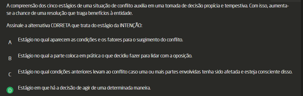 <p>A compreensão dos cinco estágios de uma isso, aumenta- se a chance de uma resolução que traga benefícios à entidade. Assinale a alternativa CORRETA que trata do estágio da INTENÇÃO: A Estágio no qual aparecem as condições e os fatores para surgimento do conflito. B Estágio no qual a parte coloca em prática que decidiu fazer para lidar com a oposição. Estágio no qual condições anteriores levam ao conflito caso uma ou mais partes envolvidas tenha sido afetada e esteja consciente disso. D Estágio em que há a decisão de agir de uma determinada maneira.</p>