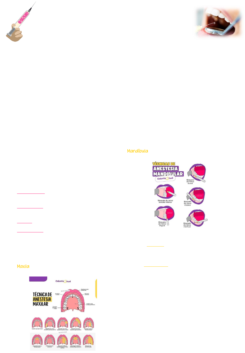<p>Anatomia</p><p>Topográfica aplicada das anestesias</p><p>Classificação</p><p> Tópicas:</p><p> Terminais infiltravas: dentes incisivos, caninos e pré-</p><p>molares e terminações nervosas específicas do nervo</p><p>trigêmeo</p><p> Regionais/bloqueios: dentes molares inferiores</p><p> Complementares: intrapulpar, intrapapilar</p><p>Terminais infiltrativas</p><p> Local especifico</p><p> Submucosa</p><p> Anestesia subperiosteal; quando atinge o osso</p><p>*Não é indicada em locais com abscesso, celulite ou processo</p><p>infeccioso*</p><p>Critérios</p><p>Ponto de punção: mucosa oral referente ao ápice do dente</p><p>(tecido mole)</p><p>Ponto de reparo: processo dento alveolar referente ao ápice</p><p>do dente (tecido ósseo)</p><p>Trajetória</p><p>Area anestesiada</p><p>Técnicas</p><p>Nervo alveolar superior anterior; incisivos e caninos</p><p>Nervo alveolar superior médio; pré-molares e raiz mesio-</p><p>vestibular do primeiro molar</p><p>Nervo alveolar superior posterior; molares e raízes disto-</p><p>vestibular e palatina do primeiro molar</p><p>Nervo nasopalatino; sensibilização de tecidos moles</p><p>Nervo palatino maior; fins de descolamento</p><p>Nervo infraorbitário</p><p>Nervo maxilar; bloqueio troncular</p><p>Nervo nasopalatino: forame incisivo</p><p>Nervo mandibular:</p><p>técnica de gow-gates; côndilo mandibular (em casos de</p><p>necessidade do bloqueio do tronco mandibular do nervo</p><p>trigêmeo)</p><p>técnica de vazirani-akinose: rafe pterigomandibular (em casos</p><p>de trismo onde o paciente não consegue abrir a boca)</p><p>Nervo alveolar inferior: forame mandibular (se baseia pelos</p><p>pré-molares do lado oposto do forame e pelo último molar</p><p>erupcioonado do lado do forame e rafe pterico mandibular</p><p>e ramo ascendente da mandíbula)</p><p>Nervo mentual: dentes pré-molares</p><p>Nervo incisivo; dentes incisivos inferiores (ao sair do forame</p><p>mentual)</p><p>Nervo Lingual: sensibilização de tecidos moles</p><p>Nervo bucal: dentes molares inferiores</p>