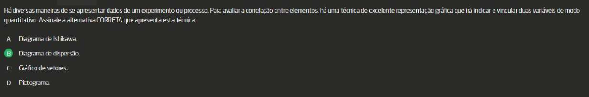 <p>Há diversas maneiras de se apresentar dados de um experimento ou processo. Para avaliar a correlação entre elementos, há uma técnica de excelente representação gráfica indicar e vincular duas variáveis de modo quantitativo. Assinale a alternativa CORRETA que apresenta esta técnica: A Diagrama de Diagrama de dispersão. C Gráfico de setores. D</p>
