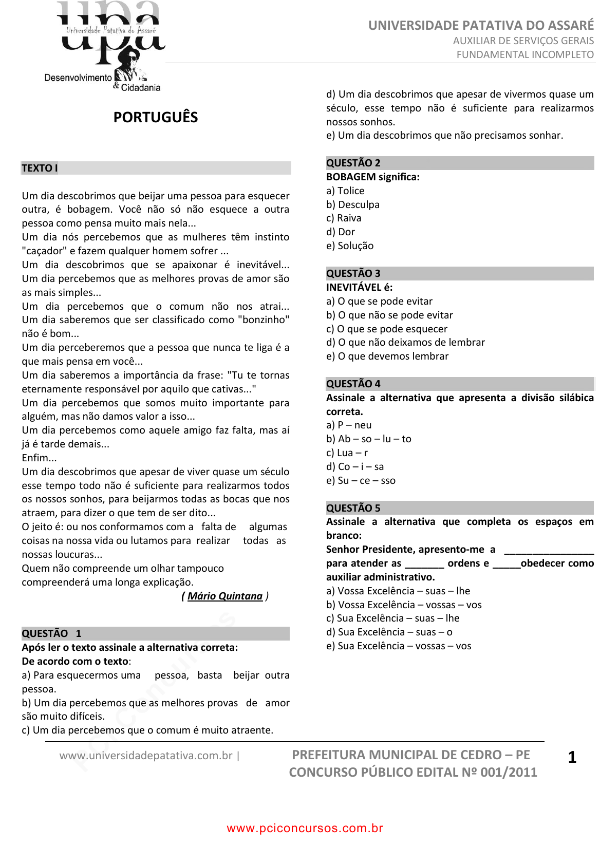 <p>pcimarkpci MDAwMDowMDAwOjAwMDA6MDAwMDowMDAwOmZmZmY6OGFiYTo3MGUy:VHVlLCAwMyBTZXAgMjAyNCAwNzozMToyOSAtMDMwMA==</p><p>www.pciconcursos.com.br</p><p>UNIVERSIDADE PATATIVA DO ASSARÉ</p><p>AUXILIAR DE SERVIÇOS GERAIS</p><p>FUNDAMENTAL INCOMPLETO</p><p>www.universidadepatativa.com.br | PREFEITURA MUNICIPAL DE CEDRO – PE</p><p>CONCURSO PÚBLICO EDITAL Nº 001/2011</p><p>1</p><p>PORTUGUÊS</p><p>TEXTO I</p><p>Um dia descobrimos que beijar uma pessoa para esquecer</p><p>outra, é bobagem. Você não só não esquece a outra</p><p>pessoa como pensa muito mais nela...</p><p>Um dia nós percebemos que as mulheres têm instinto</p><p>"caçador" e fazem qualquer homem sofrer ...</p><p>Um dia descobrimos que se apaixonar é inevitável...</p><p>Um dia percebemos que as melhores provas de amor são</p><p>as mais simples...</p><p>Um dia percebemos que o comum não nos atrai...</p><p>Um dia saberemos que ser classificado como "bonzinho"</p><p>não é bom...</p><p>Um dia perceberemos que a pessoa que nunca te liga é a</p><p>que mais pensa em você...</p><p>Um dia saberemos a importância da frase: "Tu te tornas</p><p>eternamente responsável por aquilo que cativas..."</p><p>Um dia percebemos que somos muito importante para</p><p>alguém, mas não damos valor a isso...</p><p>Um dia percebemos como aquele amigo faz falta, mas aí</p><p>já é tarde demais...</p><p>Enfim...</p><p>Um dia descobrimos que apesar de viver quase um século</p><p>esse tempo todo não é suficiente para realizarmos todos</p><p>os nossos sonhos, para beijarmos todas as bocas que nos</p><p>atraem, para dizer o que tem de ser dito...</p><p>O jeito é: ou nos conformamos com a falta de algumas</p><p>coisas na nossa vida ou lutamos para realizar todas as</p><p>nossas loucuras...</p><p>Quem não compreende um olhar tampouco</p><p>compreenderá uma longa explicação.</p><p>( Mário Quintana )</p><p>QUESTÃO 1_____________________________________</p><p>Após ler o texto assinale a alternativa correta:</p><p>De acordo com o texto:</p><p>a) Para esquecermos uma pessoa, basta beijar outra</p><p>pessoa.</p><p>b) Um dia percebemos que as melhores provas de amor</p><p>são muito difíceis.</p><p>c) Um dia percebemos que o comum é muito atraente.</p><p>d) Um dia descobrimos que apesar de vivermos quase um</p><p>século, esse tempo não é suficiente para realizarmos</p><p>nossos sonhos.</p><p>e) Um dia descobrimos que não precisamos sonhar.</p><p>QUESTÃO 2________*___________________________ _</p><p>BOBAGEM significa:</p><p>a) Tolice</p><p>b) Desculpa</p><p>c) Raiva</p><p>d) Dor</p><p>e) Solução</p><p>QUESTÃO 3____________________________________ _</p><p>INEVITÁVEL é:</p><p>a) O que se pode evitar</p><p>b) O que não se pode evitar</p><p>c) O que se pode esquecer</p><p>d) O que não deixamos de lembrar</p><p>e) O que devemos lembrar</p><p>QUESTÃO 4____________________________________ _</p><p>Assinale a alternativa que apresenta a divisão silábica</p><p>correta.</p><p>a) P – neu</p><p>b) Ab – so – lu – to</p><p>c) Lua – r</p><p>d) Co – i – sa</p><p>e) Su – ce – sso</p><p>QUESTÃO 5____________________________________ _</p><p>Assinale a alternativa que completa os espaços em</p><p>branco:</p><p>Senhor Presidente, apresento-me a ________________</p><p>para atender as _______ ordens e _____obedecer como</p><p>auxiliar administrativo.</p><p>a) Vossa Excelência – suas – lhe</p><p>b) Vossa Excelência – vossas – vos</p><p>c) Sua Excelência – suas – lhe</p><p>d) Sua Excelência – suas – o</p><p>e) Sua Excelência – vossas – vos</p><p>www.pciconcursos.com.br</p><p>pcimarkpci MDAwMDowMDAwOjAwMDA6MDAwMDowMDAwOmZmZmY6OGFiYTo3MGUy:VHVlLCAwMyBTZXAgMjAyNCAwNzozMToyOSAtMDMwMA==</p><p>www.pciconcursos.com.br</p><p>UNIVERSIDADE PATATIVA DO ASSARÉ</p><p>AUXILIAR DE SERVIÇOS GERAIS</p><p>FUNDAMENTAL INCOMPLETO</p><p>www.universidadepatativa.com.br | PREFEITURA MUNICIPAL DE CEDRO – PE</p><p>CONCURSO PÚBLICO EDITAL Nº 001/2011</p><p>2</p><p>QUESTÃO 6____________________________________ _</p><p>Eles ______________ o trabalho e quando você o</p><p>___________ concluído, vai parabenizá-lo.</p><p>a) Farão – ver</p><p>b) Farão – vir</p><p>c) Fazerão – ver</p><p>d) Fazerão – vir</p><p>e) Fazeram – ver</p><p>QUESTÃO 7_____________________________________</p><p>As palavras estão todas corretas na alternativa:</p><p>a) Tijela – jejum – ajeitar</p><p>b) Tigela – jejum – ageitar</p><p>c) Tigela – gejum – ajeitar</p><p>d) Tigela – jejum – ajeitar</p><p>e) Tijela – jejum – ageitar</p><p>QUESTÃO 8_____________________________________</p><p>Em qual alternativa as palavras devem ter acento?</p><p>a) Paises – caju</p><p>b) Saida - Bahia</p><p>c) Juriti – bau</p><p>d) Juiz – raiz</p><p>e) Raizes – saida</p><p>QUESTÃO 9_____________________________________</p><p>A gente______tudo para que o grupo infantil</p><p>________calmo, ainda que _________muitas horas.</p><p>a) Fez – ficasse – chovessem</p><p>b) Fizemos – ficassem – chovessem</p><p>c) Fez – ficasse – chovesse</p><p>d) Fizemos – ficasse – chovesse</p><p>e) Fez – ficassem – chovesse</p><p>QUESTÃO 10____________________________________</p><p>Camisa e chapéu________</p><p>Ela nos disse_________ pelo favor que fizemos</p><p>Trouxe notícias___________</p><p>A alternativa que completa os espaços em branco é:</p><p>a) Colorido – obrigado – extra</p><p>b) Coloridos – obrigadas – extra</p><p>c) Colorido – obrigada – extras</p><p>d) Colorido – obrigada – extra</p><p>e) Coloridos – obrigada – extras</p><p>MATEMÁTICA</p><p>QUESTÃO 11____________________________________</p><p>Viajando de automóvel, à velocidade de 90 km/h, Carlos</p><p>gasta 3 horas para fazer certo percurso. Pode-se afirmar</p><p>que o tempo gasto para percorrer o mesmo trajeto, se a</p><p>velocidade média do automóvel fosse de 120 km/h vale:</p><p>a) 1 h</p><p>b) 2,5 h</p><p>c) 15 minutos</p><p>d) 45 minutos</p><