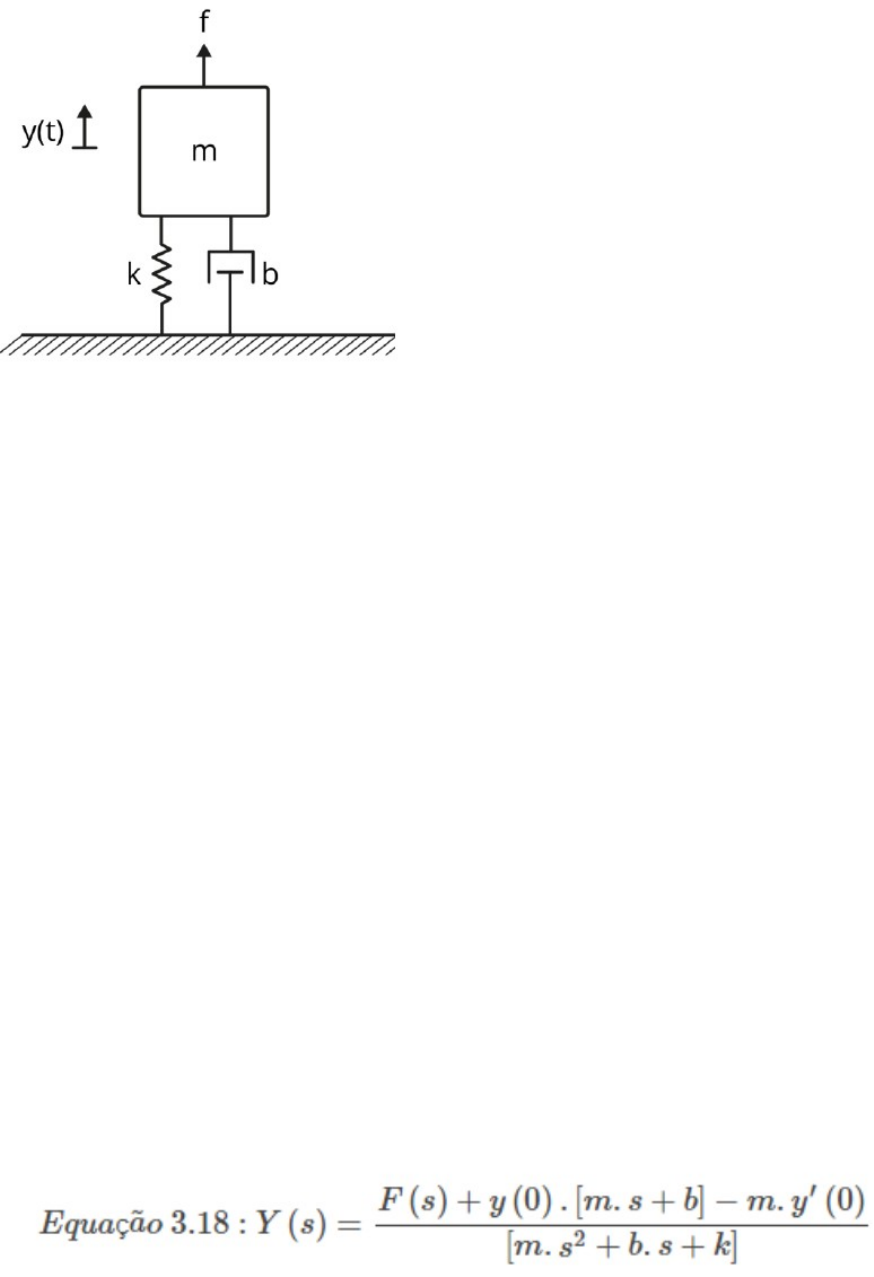 <p>RESPOSTA:</p><p>O sistema massa-mola-amortecedor está associado à modelagem</p><p>mecânica translacional, pois há um bloco de massa “m” que se d esloca, n este</p><p>caso, para cima ou para baixo. A EDO que descreve esse movimento é dada por:</p><p>Equação 3.15: f(t)= m.y′′ + b.y′ + k. y</p><p>Observe que a Equação 3.15, descrita pelo teorema do movimento do baricentro,</p><p>assemelha-se aos casos anteriores (elétrico s) quanto à forma, inclusive o</p><p>mecanismo de resolução é igual. E podemos condicionar os estágios iniciais da</p><p>equação, de modo que a T ransformada de Laplace para o sistema pode ser d ada</p><p>por:</p><p>Equação 3.16: F(s) = m.[s2.Y(s)−s.y(0)−y′(0)]+b.[ s.Y(s)−y(0)]+k.Y(s)</p><p>Equação 3.17: F(s) = Y(s).[m.s2+b.s+k]−y(0).[m.s+b]−m.y′(0)</p><p>Organizando a Equação 3.17, a função de transferên cia para o sistema da Figura</p><p>3.5 é:</p><p>1-Após a leitura dos parágrafos anteriores, considere as leis de conservação mecânica e as</p><p>equações diferenciais e apresente os mecanismos necessários para o dimensionamento de</p><p>sistemas massa-mola-amortecedor (Figura 1), identifique as equações diferenciais</p><p>necessárias para descrevê-los e encontre a função de transferência do sistema.</p><p>Figura 3.5</p><p>RESPOSTA:</p><p>O sistema massa-mola-amortecedor está associado à modelagem</p><p>mecânica translacional, pois há um bloco de massa “m” que se d desloca, n este</p><p>caso, para cima ou para baixo. A EDO que descreve esse movimento é dada por:</p><p>Equação 3.15: f(t)= m.y′′ + b.y′ + k. y</p><p>Observe que a Equação 3.15, descrita pelo teorema do movimento do baricentro,</p><p>assemelha-se aos casos anteriores (elétrico s) quanto à forma, inclusive o</p><p>mecanismo de resolução é igual. E podemos condicionar os estágios iniciais da</p><p>equação, de modo que a transformada de Laplace para o sistema pode ser dada</p><p>por:</p><p>Equação 3.16: F(s) = m.[s2.Y(s)−s.y(0)−y′(0)]+b.[ s.Y(s)−y(0)]+k.Y(s)</p><p>Equação 3.17: F(s) = Y(s).[m.s2+b.s+k]−y(0).[m.s+b]−m.y′(0)</p><p>Organizando a Equação 3.17, a função de transferên cia para o sistema da Figura</p><p>3.5 é:</p><p>image1.png</p>