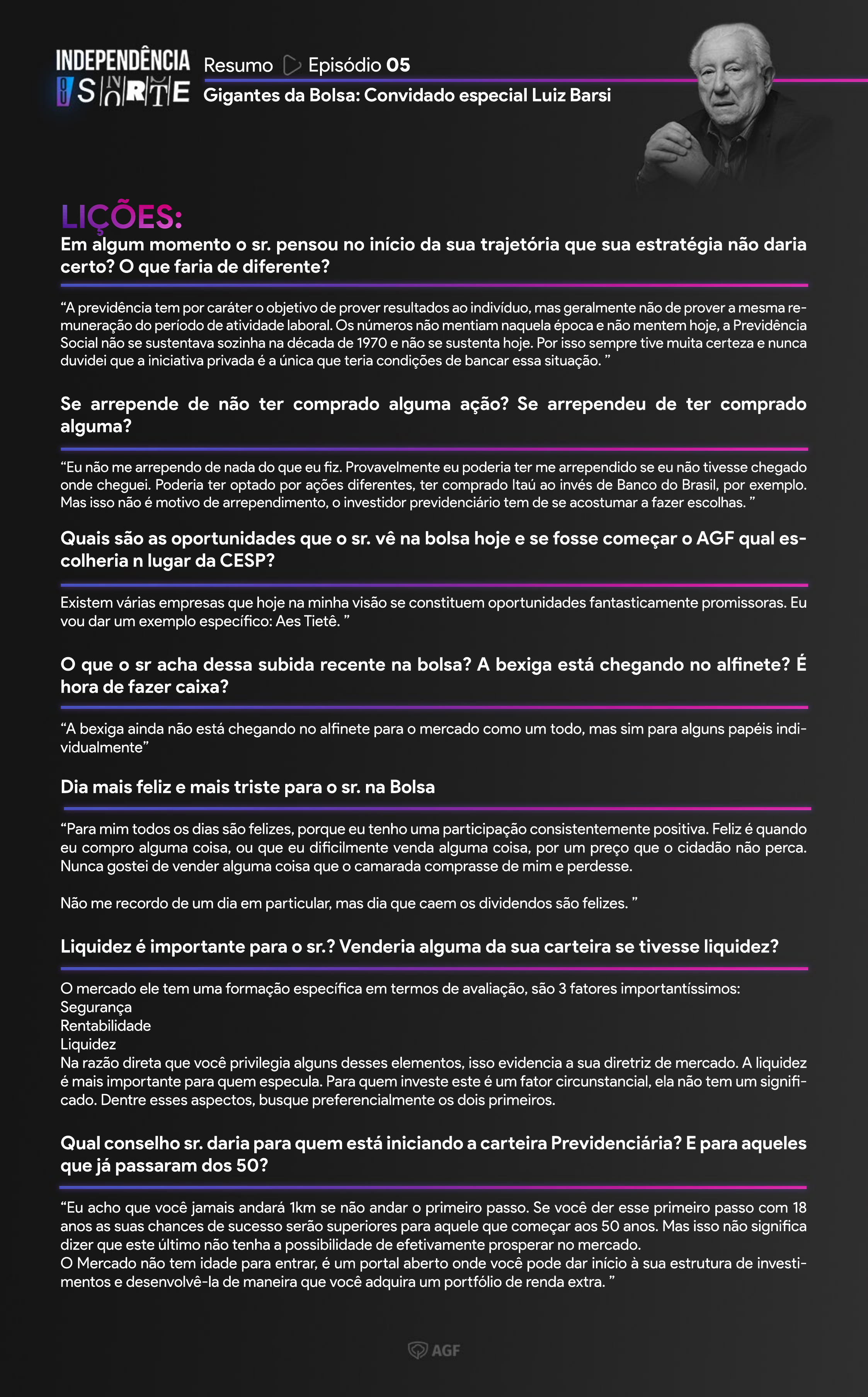 <p>Resumo Episódio 05</p><p>Gigantes da Bolsa: Convidado especial Luiz Barsi</p><p>LIÇÕES:</p><p>Em algum momento o sr. pensou no início da sua trajetória que sua estratégia não daria</p><p>ce o? O que faria de diferente?</p><p>““A previdência tem por caráter o objetivo de prover resultados ao indivíduo, mas geralmente não de prover a mesma re-</p><p>muneração do período de atividade laboral. Os números não mentiam naquela época e não mentem hoje, a Previdência</p><p>Social não se sustentava sozinha na década de 1970 e não se sustenta hoje. Por isso sempre tive muita ceeza e nunca</p><p>duvidei que a iniciativa privada é a única que teria condições de bancar essa situação. ”</p><p>Se arrepende de não ter comprado alguma ação? Se arrependeu de ter comprado</p><p>alguma?</p><p>“Eu não me arrependo de nada do que eu z. Provavelmente eu poderia ter me arrependido se eu não tivesse chegado</p><p>onde cheguei. Poderia ter optado por ações diferentes, ter comprado Itaú ao invés de Banco do Brasil, por exemplo.</p><p>Mas isso não é motivo de arrependimento, o investidor previdenciário tem de se acostumar a fazer escolhas. ”</p><p>Quais são as opo unidades que o sr. vê na bolsa hoje e se fosse começar o AGF qual es-</p><p>colheria n lugar da CESP?</p><p>Existem várias empresas que hoje na minha visão se constituem opounidades fantasticamente promissoras. Eu</p><p>vou dar um exemplo especíco: Aes Tietê. ”</p><p>O que o sr acha dessa subida recente na bolsa? A bexiga está chegando no alnete? É</p><p>hora de fazer caixa?</p><p>“A bexiga ainda não está chegando no alnete para o mercado como um todo, mas sim para alguns papéis indi-</p><p>vidualmente”</p><p>Dia mais feliz e mais triste para o sr. na Bolsa</p><p>““Para mim todos os dias são felizes, porque eu tenho uma paicipação consistentemente positiva. Feliz é quando</p><p>eu compro alguma coisa, ou que eu dicilmente venda alguma coisa, por um preço que o cidadão não perca.</p><p>Nunca gostei de vender alguma coisa que o camarada comprasse de mim e perdesse.</p><p>Não me recordo de um dia em paicular, mas dia que caem os dividendos são felizes. ”</p><p>Liquidez é impo ante para o sr.? Venderia alguma da sua ca eira se tivesse liquidez?</p><p>O mercado ele tem uma formação especíca em termos de avaliação, são 3 fatores impoantíssimos:</p><p>Segurança</p><p>RRentabilidade</p><p>Liquidez</p><p>Na razão direta que você privilegia alguns desses elementos, isso evidencia a sua diretriz de mercado. A liquidez</p><p>é mais impoante para quem especula. Para quem investe este é um fator circunstancial, ela não tem um signi-</p><p>cado. Dentre esses aspectos, busque preferencialmente os dois primeiros.</p><p>Qual conselho sr. daria para quem está iniciando a ca eira Previdenciária? E para aqueles</p><p>que já passaram dos 50?</p><p>““Eu acho que você jamais andará 1km se não andar o primeiro passo. Se você der esse primeiro passo com 18</p><p>anos as suas chances de sucesso serão superiores para aquele que começar aos 50 anos. Mas isso não signica</p><p>dizer que este último não tenha a possibilidade de efetivamente prosperar no mercado.</p><p>O Mercado não tem idade para entrar, é um poal abeo onde você pode dar início à sua estrutura de investi-</p><p>mentos e desenvolvê-la de maneira que você adquira um pofólio de renda extra. ”</p><p>Licenciado para - G</p><p>abriela S</p><p>ilva S</p><p>ouza - 02158344610 - P</p><p>rotegido por E</p><p>duzz.com</p>