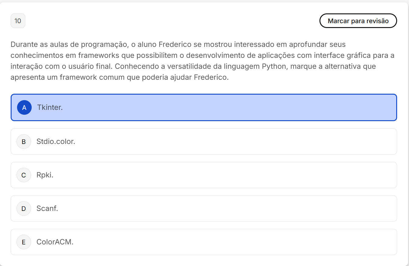 <p>10 Marcar para revisão Durante as aulas de programação, o aluno Frederico se mostrou interessado em aprofundar seus conhecimentos em frameworks que possibilitem o desenvolvimento de aplicações com interface gráfica para a interação com o usuário final. Conhecendo a versatilidade da linguagem Python, marque a alternativa que apresenta um framework comum que poderia ajudar Frederico. A Tkinter. B Stdio.color. C Rpki. D Scanf. E ColorACM.</p>