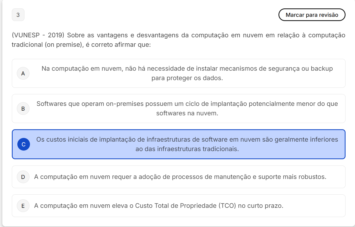 <p>3 Marcar para revisão (VUNESP - 2019) Sobre as vantagens e desvantagens da computação em nuvem em relação à computação tradicional (on premise), é correto afirmar que: Na computação em nuvem, não há necessidade de instalar mecanismos de segurança ou backup A para proteger os dados. Softwares que operam on-premises possuem um ciclo de implantação potencialmente menor do que B softwares na nuvem. Os custos iniciais de implantação de infraestruturas de software em nuvem são geralmente inferiores C ao das infraestruturas tradicionais. D A computação em nuvem requer a adoção de processos de manutenção e suporte mais robustos. E A computação em nuvem eleva o Custo Total de Propriedade (TCO) no curto prazo.</p>