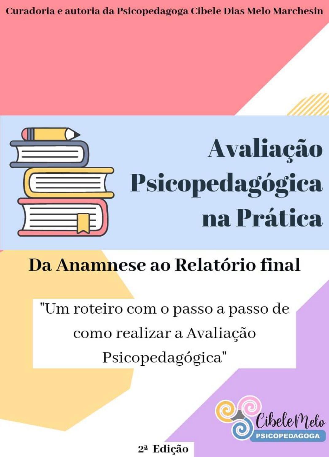 <p>Avaliação Psicopedagógica na Prática – 2ª Edição – Curadoria e Autoria de Cibele Melo</p><p>Avaliação Psicopedagógica na Prática – 2ª Edição – Curadoria e Autoria de Cibele Melo</p><p>ÉTICA NA DISTRIBUIÇÃO</p><p>Não compartilhe este material sem autorização prévia da autora. Não desmereça o trabalho, o tempo, a</p><p>pesquisa, o estudo, a pesquisa e curadoria de produtores de materiais independentes.</p><p>Seja ético!</p><p>Cibele Dias Melo Marchesin</p><p>Avaliação Psicopedagógica na Prática – 2ª Edição – Curadoria e Autoria de Cibele Melo</p><p>INTRODUÇÃO</p><p>Muitas pós-graduações em Psicopedagogia no Brasil não oferecem aprofundamento na Avaliação e no</p><p>Diagnóstico Psicopedagógico Clínico, deixando muitos profissionais inseguros para atuar.</p><p>Após minha formação, precisei estudar muito, fazer cursos, comprar livros e criar meu próprio</p><p>protocolo de avaliação psicopedagógica.</p><p>As bases teóricas são de extrema importância, mas sempre falta a prática. Obviamente esse E-book</p><p>não substitui sua leitura, estudo e reflexão sobre todo o processo avaliativo.</p><p>O objetivo desse material é oferecer subsídios e material concreto para que o profissional aplique,</p><p>tabule e avalie quais habilidades o aprendente já desenvolveu e quais ainda serão necessárias estimular.</p><p>Muitas das atividades podem ser utilizadas tanto na Avaliação como na Intervenção Psicopedagógica.</p><p>Desejo que esse E-book te auxilie na sua prática e que possa te incentivar a seguir atuando na</p><p>Psicopedagogia Clínica com responsabilidade, contribuindo com o desenvolvimento de tantos aprendentes.</p><p>Bom trabalho, um abraço!</p><p>Cibele Melo</p><p>2ª Edição - Agosto de 2021</p><p>Avaliação Psicopedagógica na Prática – 2ª Edição – Curadoria e Autoria de Cibele Melo</p><p>SUGESTÃO PARA A PRÁTICA PSICOPEDAGÓGICA</p><p>A prática da Psicopedagogia é muito particular, cada profissional encontra sua forma genuína de</p><p>trabalho. Esse material é apenas um referencial para quem está iniciando, com o passar do tempo e com sua</p><p>prática, você encontrará seus próprios recursos e caminhos para avaliar seus alunos.</p><p>A avaliação psicopedagógica vai muito além da simples aplicação de testes. Teste é ferramenta e não</p><p>o processo. É possível realizar uma avaliação sem usar nenhum teste.</p><p>“Não há testes disponíveis e/ou confiáveis para tudo o</p><p>que se quer avaliar e tampouco todo e qualquer aspecto</p><p>do funcionamento individual depende unicamente de um</p><p>teste para ser avaliado de forma confiável e clinicamente</p><p>útil”. (Alves, M. M. in Malloy-Diniz, L. F. et. Al.</p><p>Avaliação neuropsicológica. 2ª edição. Porto Alegre:</p><p>Artmed, 2018, pp. 5.)</p><p>Avaliação Psicopedagógica na Prática – 2ª Edição – Curadoria e Autoria de Cibele Melo</p><p>OBJETIVOS DA AVALIAÇÃO PSICOPEDAGÓGICA</p><p>Identificar o que está dificultando a aprendizagem;</p><p>Identificar as causas das lacunas na aprendizagem e o rendimento escolar insatisfatório;</p><p>Estabelecer as causas que estariam causando falta de concentração, agitação, agressividade, etc.;</p><p>Obter dados do sujeito avaliado nos diversos âmbitos: cognitivo, familiar, pedagógico e social;</p><p>Investigar, levantar hipóteses provisórias que serão confirmadas ou não no decorrer do processo;</p><p>Essa avaliação é fundamental para planejamento e intervenção psicopedagógica;</p><p>Perceber e caracterizar as potencialidades, habilidades e competências já adquiridas;</p><p>O que é observado durante a realização da Avaliação Psicopedagógica:</p><p>Desenvolvimento cognitivo;</p><p>Desenvolvimento socioemocional;</p><p>Desenvolvimento motor fino;</p><p>Psicomotricidade;</p><p>Lateralidade;</p><p>Percepção e discriminação auditiva e visual;</p><p>Coordenação Viso motora;</p><p>Percepção Espacial;</p><p>Atenção, concentração;</p><p>Memória visual e auditiva;</p><p>Memória de Trabalho;</p><p>Funções executivas (Planejamento, Flexibilidade Cognitiva, Controle inibitório)</p><p>Raciocínio lógico;</p><p>Aquisição de novos conceitos;</p><p>Pensamento lógico matemático;</p><p>Evolução e traçado do desenho;</p><p>Criatividade;</p><p>Consciência fonológica;</p><p>Orientação temporal.</p><p>O objetivo de qualquer avaliação clínica é responder uma pergunta! Se as estratégias adotadas no</p><p>processo de avaliação não vão ao encontro da pergunta inicial, elas são clinicamente inúteis!</p><p>Avaliação Psicopedagógica na Prática – 2ª Edição – Curadoria e Autoria de Cibele Melo</p><p>FUNÇÕES COGNITIVAS SUPERIORES</p><p>Denomina-se funções cognitivas os processos mentais que nos permitem desenvolver qualquer tarefa.</p><p>Fazendo com que seja possível que o indivíduo tenha um papel ativo nos processos de recepção, seleção,</p><p>transformação, armazenamento, elaboração e recuperação da informação, o que permite que ele se desenvolva</p><p>de forma adequada no mundo que lhe rodeia.</p><p>Portanto, é importante o estudo da Neurociências e Educação. Na Avaliação Psicopedagógica, se faz</p><p>necessário o conhecimento e a avaliação desses constructos.</p><p>MEMÓRIA ATENÇÃO LINGUAGEM PERCEPÇÃO</p><p>(espacial/visual)</p><p>FUNÇÕES</p><p>EXECUTIVAS</p><p>Memória visual Seletiva Oral Visomotora Planejamento</p><p>Memória auditiva Sustentada Escrita Praxia motora Controle inibitório</p><p>Alternada Leitura Visuoconstrução Flexibilidade</p><p>cognitiva</p><p>Concentrada Vocabulário Memória de</p><p>trabalho</p><p>Consciência</p><p>fonológica</p><p>Avaliação Psicopedagógica na Prática – 2ª Edição – Curadoria e Autoria de Cibele Melo</p><p>CRONOGRAMA DE AVALIAÇÃO</p><p>Cada aluno terá sua especificidade e necessidade, então cabe a você definir a quantidade de sessõe