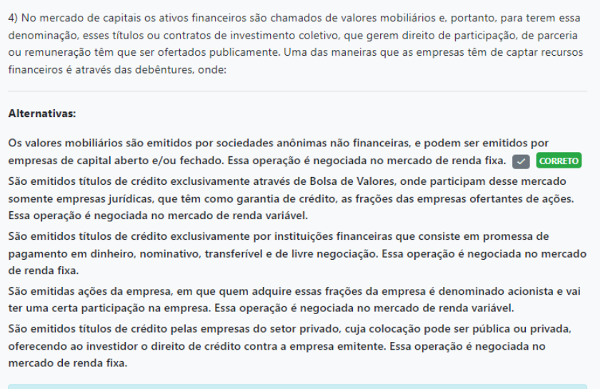 <p>4) No mercado de capitais os ativos financeiros são chamados de valores mobiliários e, portanto, para terem essa denominação, esses títulos ou contratos de investimento coletivo, que gerem direito de participação, de parceria ou remuneração têm que ser ofertados publicamente. Uma das maneiras que as empresas têm de captar recursos financeiros é através das debêntures, onde: Alternativas: Os valores mobiliários são emitidos por sociedades anônimas não financeiras, e podem ser emitidos por empresas de capital aberto e/ou fechado. Essa operação é negociada no mercado de renda fixa. CORRETO São emitidos títulos de crédito exclusivamente através de Bolsa de Valores, onde participam desse mercado somente empresas jurídicas, que têm como garantia de crédito, as frações das empresas ofertantes de ações. Essa operação é negociada no mercado de renda variável. São emitidos títulos de crédito exclusivamente por instituições financeiras que consiste em promessa de pagamento em dinheiro, nominativo, transferível e de livre negociação. Essa operação é negociada no mercado de renda fixa. São emitidas ações da empresa, em que quem adquire essas frações da empresa é denominado acionista e vai ter uma certa participação na empresa. Essa operação é negociada no mercado de renda variável. São emitidos títulos de crédito pelas empresas do setor privado, cuja colocação pode ser pública ou privada, oferecendo ao investidor direito de crédito contra a empresa emitente. Essa operação é negociada no mercado de renda fixa.</p>