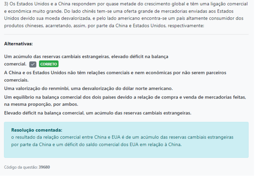 <p>3) Os Estados Unidos e a China respondem por quase metade do crescimento global e têm uma ligação comercial e econômica muito grande. Do lado chinês tem-se uma oferta grande de mercadorias enviadas aos Estados Unidos devido sua moeda desvalorizada, e pelo lado americano encontra-se um país altamente consumidor dos produtos chineses, acarretando, assim, por parte da China e Estados Unidos, respectivamente: Alternativas: Um acúmulo das reservas cambiais estrangeiras, elevado déficit na balança comercial. CORRETO A China e os Estados Unidos não têm relações comerciais e nem econômicas por não serem parceiros comerciais. Uma valorização do renminbi, uma desvalorização do dólar norte americano. Um equilíbrio na balança comercial dos dois países devido a relação de compra e venda de mercadorias feitas, na mesma proporção, por ambos. Elevado déficit na balança comercial, um acúmulo das reservas cambiais estrangeiras. Resolução comentada: resultado da relação comercial entre China e EUA é de um acúmulo das reservas cambiais estrangeiras por parte da China e um déficit do saldo comercial dos EUA em relação à China. Código da questão: 39680</p>