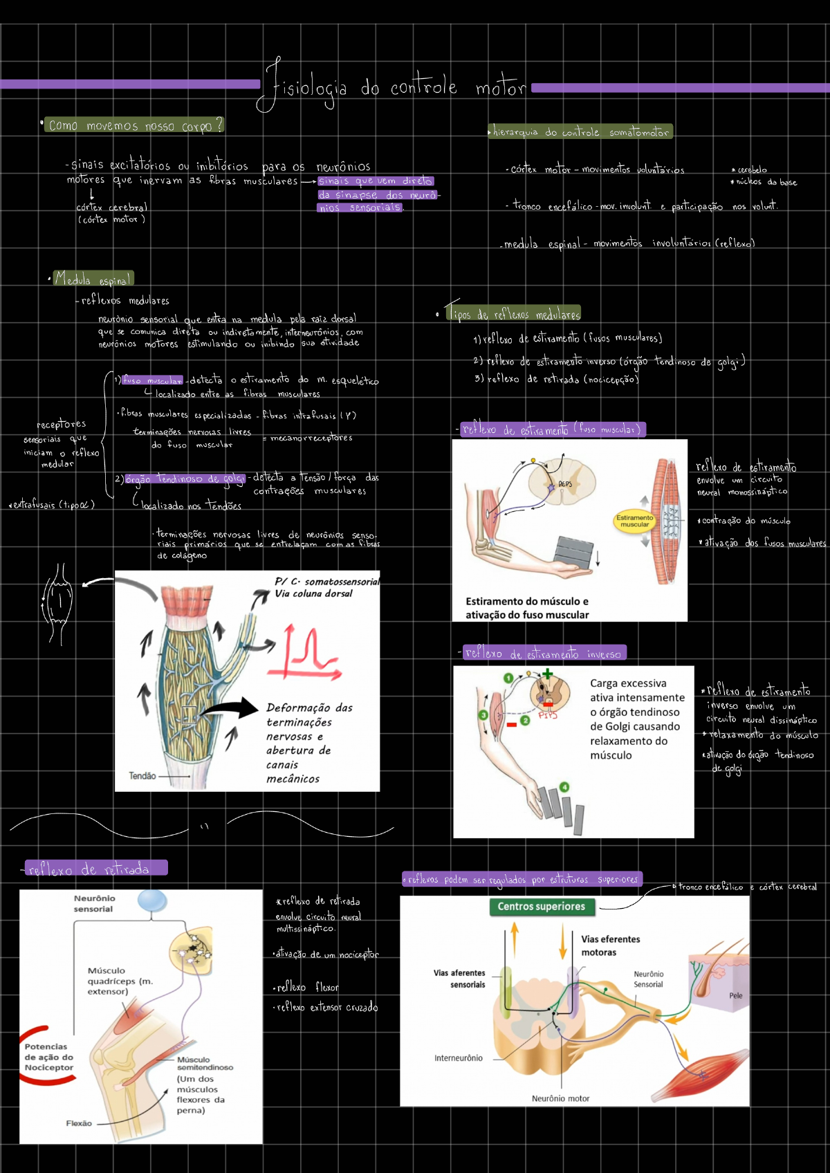 <p>do controle motor Como movemos nosso ? do controle somatomotor - excitatorios ou inibitorios para os neurônios motor - movimentos voluntarios cerebelo motores que inervam as fibras musculares nucleos da base da sinapse dos cortex cerebral nios sensoriais tronco encefalico involunt. e participação nos volunt (cortex espinal movimentos (reflexo) Medula espina reflexos medulares sensorial que entra na medula pela raiz dorsal Tipos de reflexos medulares que se comunica direta ou com neurônios motores estimulando inibindo sua atividade 1) reflexo de estiramento (fusbs musculares) 2) reflexo de estiramento inverso tendinoso de gotgi) fuso muscular detecta estiramento do m. esqueletico 3) reflexo de retirada (nocicepção) localizado entre as fibras musculares musculares especializadas fibras intrafusais (Y) receptores terminações nervosas livres mecano reflexo de muscular) sensoriais que do fuso muscular iniciam reflexo medular de estiramento tendinoso de detect a tensão das envolve um circuito contrações musculares neural monossinaptico localizado nos tendoes Estiramento muscular contração do músculo terminações nervosas livres de neurônios senso riais primarios que se com as fibras ativação dos fusos musculares de colageno somatossensorial Via coluna dorsal Estiramento do músculo e ativação do fuso muscular reflexo de estiramento inverso Carga excessiva reflexo de estiramento ativa intensamente Deformação das inverso envolve um o órgão tendinoso terminações circuito neural dissinaptico de Golgi causando nervosas e do relaxamento do abertura de músculo ativação do orgao tendinoso canais Tendão de golgi mecânicos reflexo de retirada reflexos podem ser regulados por estruturas tronco e cortex cerebral Neurônio de retirada sensorial Centros superiores envolve circuito neural Vias eferentes de um motoras Músculo Vias aferentes Neurônio (m. reflexo flexor sensoriais Sensorial extensor) Pele reflexo extensor cruzado Potencias de ação do Músculo Interneurônio Nociceptor semitendinoso (Um dos músculos flexores da Neurônio motor perna) Flexão</p><p>do controle somatomotor controle motor - ( postura e equilibrio) vestibular -vias vestibuloespinhais manutenção do equilibrio e postura reticulares vias reticuloespinais motor controle postural somatossensorial Movimentos voluntarios 1) entrada de sinais sensoriais cortex parietal Cortex cerebral Neurônio motor (Cortex motor) cortex pré-frontal superior 2) tomada de decisão -cortex pré-motor Axônios dos neurônios motores superiores formam 3) do mov. as VIAS CORTICOESPINHAIS cortex-motor -cortex pré-motor 4) início da execução cortex motor primario Músculo do movimento Interneurônio s) do sinal { vias cortiespinhais motor (lateral e Neurônio motor Subdivisão do cortex motor e cótex motor primário suplementar Sulco 1. central somatossensorial 2. 3. Cortex pré-frontal cortex motor primario - execução de movimentos (vias) cortex motor cortex pré motor com areas sensoriais e motoras cortex motor suplementor motor .cortex pré frontal tomada de decisões Cópia do plano motor Cerebelo - 1) planejamento de movimentos complexos Cópia do 2) aprendizado e motor de comando motor 3) ajustes posturais e manutenção do equilibrio do movimento dos movimentos dos olhos Cerebelo Aparelho vestibular Neurônio motor Núcleos vestibulares da base Proprioceptores musculares Cerebelo circuitos neurais diminui a inibição do talamo que excita cortex motor (via direta) PEPS (facilita circuitos neurais aumenta a do talamo qual deixa de excitar cortex motor (via (inibi</p>