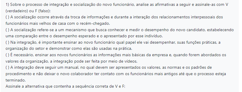 <p>1) Sobre processo de integração e socialização do novo funcionário, analise as afirmativas a seguir e assinale-as com V (verdadeiro) ou F (falso): A socialização ocorre através da troca de informações e durante a interação dos relacionamentos interpessoais dos funcionários mais velhos de casa com O recém-chegado. A socialização refere-se a um mecanismo que busca conhecer e medir desempenho do novo candidato, estabelecendo uma comparação entre desempenho esperado e O apresentado por esse indivíduo. Na integração, é importante ensinar ao novo funcionário qual papel ele vai desempenhar, suas funções práticas, a organização do setor e demonstrar como elas são usadas na É necessário, ensinar aos novos funcionários as informações mais básicas da empresa e, quando forem abordados os valores da organização, a integração pode ser feita por meio de A integração deve seguir um manual, no qual devem ser apresentados os valores, as normas e os padrões de procedimento e não deixar novo colaborador ter contato com os funcionários mais antigos até que processo esteja terminado. Assinale a alternativa que contenha a sequência correta de V e F:</p>