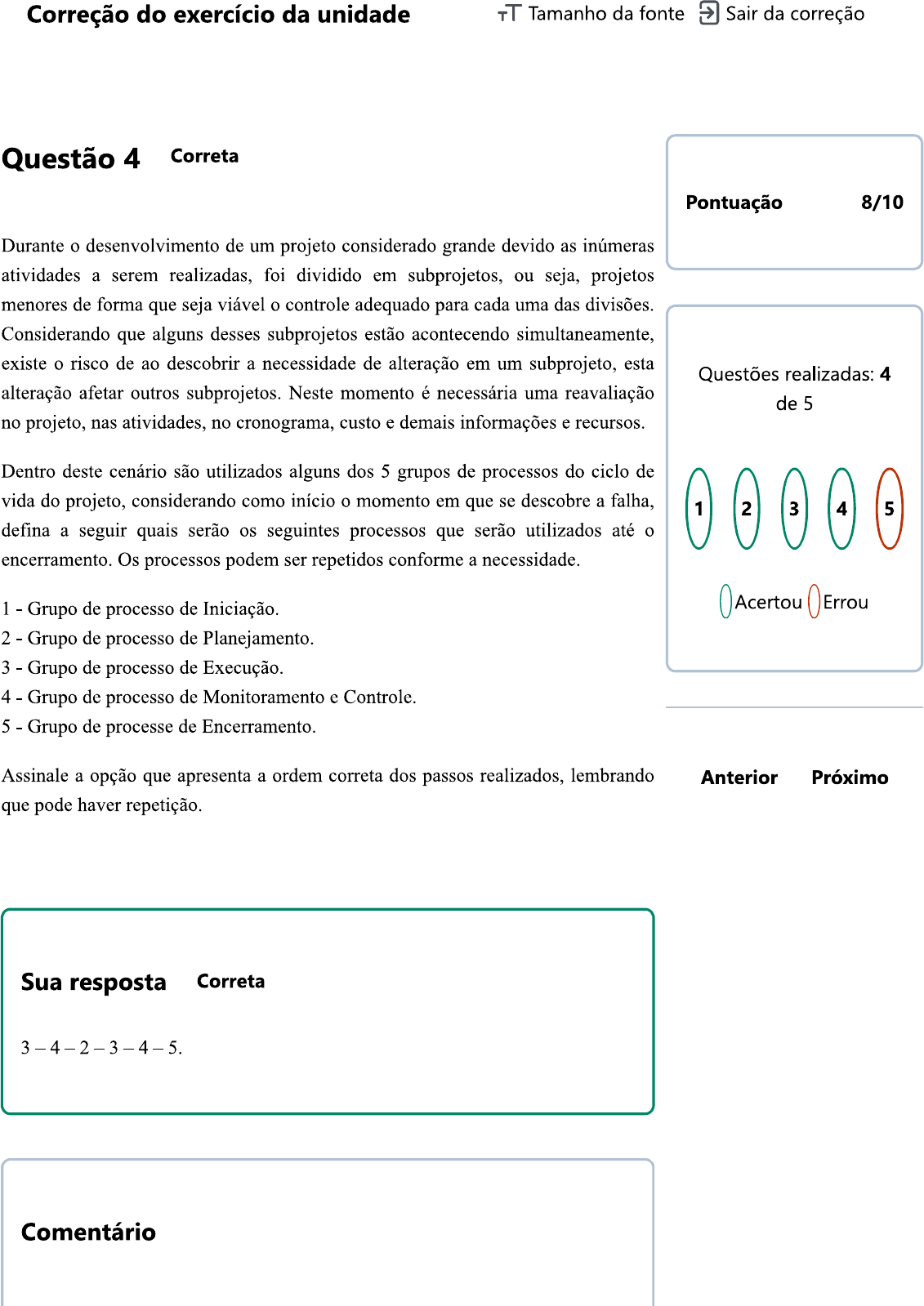 <p>Correção do exercício da unidade Tamanho da fonte Sair da correção Questão 4 Correta Pontuação 8/10 Durante o desenvolvimento de um projeto considerado grande devido as inúmeras atividades a serem realizadas, foi dividido em subprojetos, ou seja, projetos menores de forma que seja viável o controle adequado para cada uma das divisões. Considerando que alguns desses subprojetos estão acontecendo simultaneamente, existe o risco de ao descobrir a necessidade de alteração em um subprojeto, esta Questões realizadas: 4 alteração afetar outros subprojetos. Neste momento é necessária uma reavaliação de 5 no projeto, nas atividades, no cronograma, custo e demais informações e recursos. Dentro deste cenário são utilizados alguns dos 5 grupos de processos do ciclo de vida do projeto, considerando como início o momento em que se descobre a falha, 1 2 3 4 5 defina a seguir quais serão os seguintes processos que serão utilizados até o encerramento. Os processos podem ser repetidos conforme a necessidade. 1 - Grupo de processo de Iniciação. Acertou Errou 2 Grupo de processo de Planejamento. 3 Grupo de processo de Execução. 4 Grupo de processo de Monitoramento e Controle. 5 - Grupo de processe de Encerramento. Assinale a opção que apresenta a ordem correta dos passos realizados, lembrando Anterior Próximo que pode haver repetição. Sua resposta Correta 3-4-2-3-4-5 Comentário</p><p>Alternativa CORRETA: 3 - - Os erros são descobertos no grupo de execução, sendo necessário o acompanhamento pelo processo de Monitoramento e controle. Ao ser identificado por estes dois grupos, voltaremos para o processo de planejamento, e na sequência, voltando para o processo de execução e de Monitoramento e controle, não havendo mais nenhuma pendência, caminha para o processo de Encerramento.</p>