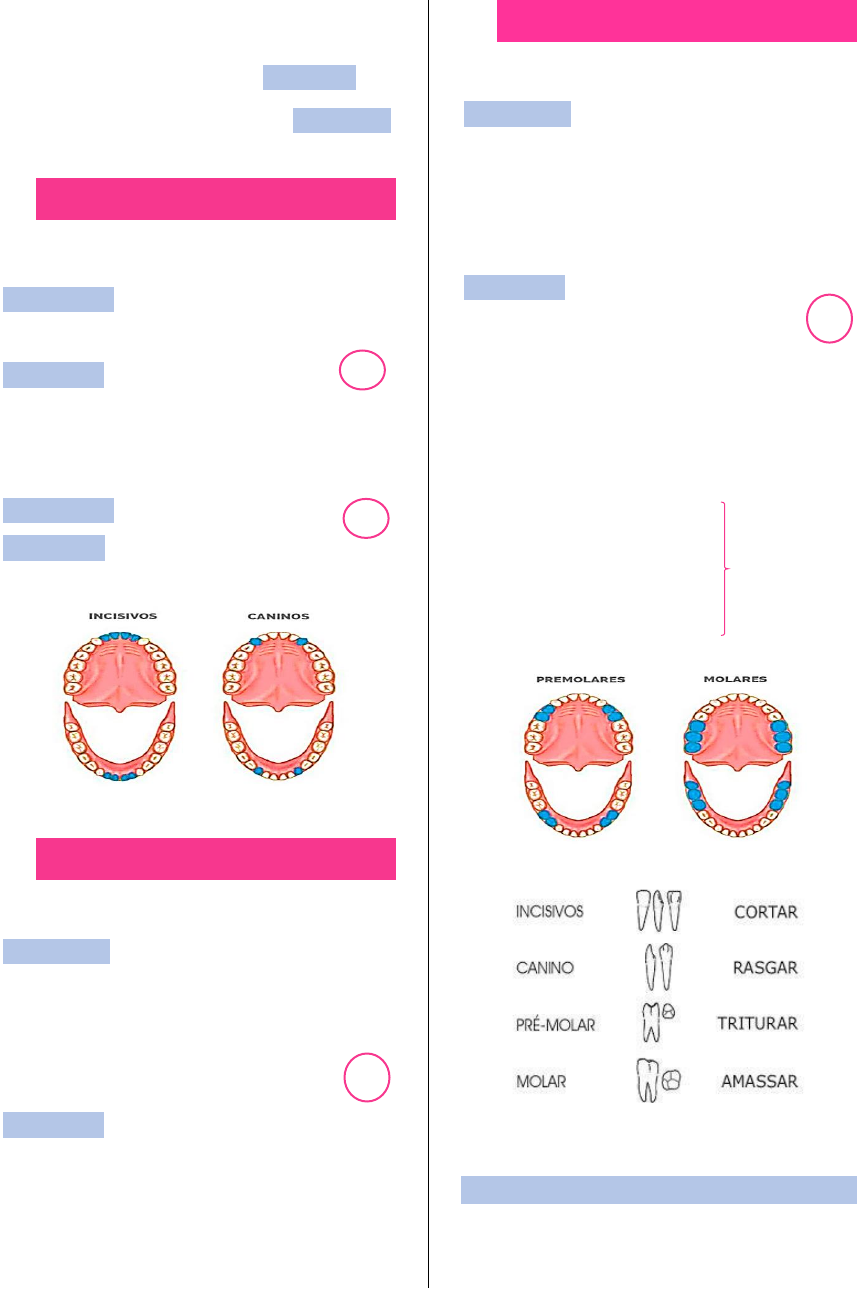 <p>Anatomia Dental</p><p>Grupo de dentes, Nomenclatura, Faces, Terços, Características gerais comuns a todos os dentes, Convergência,</p><p>Estruturas anatômicas exclusivas de dentes anteriores, Estruturas exclusivas de dentes posteriores, Incisivos</p><p>permanentes e Caninos permanentes.</p><p>Ana Beatriz Fernandes Lima</p><p>Grupo de Dente</p><p>Incisivos + caninos = Dentes Anteriores</p><p>Pré-molares e Molares = Dentes Posteriores</p><p>▪ Incisivos</p><p>- Função: corte dos alimentos</p><p>4 Superiores - 2 incisivos centrais</p><p>2 incisivos laterais</p><p>4 inferiores - 2 incisivos centrais</p><p>2 incisivos laterais</p><p>- Função: Rasgar alimentos</p><p>2 Superiores - 2 caninos</p><p>2 Inferiores - 2 caninos</p><p>▪ Pré - Molares</p><p>- Função: amassar os alimentos</p><p>4 superiores - 1º pré-molar esquerdo</p><p>2º pré-molar esquerdo</p><p>1º pré-molar direito</p><p>2º pré-molar direito</p><p>4 inferiores - 1º pré-molar esquerdo</p><p>2º pré-molar esquerdo</p><p>1º pré-molar direito</p><p>2º pré-molar direito</p><p>▪ Molares</p><p>- Função: Trituração final</p><p>4 superiores - 1º molar esquerdo</p><p>2º molar esquerdo</p><p>1º molar direito</p><p>2º molar direito</p><p>4 inferiores - 1º molar esquerdo</p><p>2º molar esquerdo</p><p>1º molar direito</p><p>2º molar direito</p><p>Em alguns casos:</p><p>3º molar superior esquerdo</p><p>3º molar superior direito</p><p>3º molar inferior esquerdo</p><p>3º molar inferior direito</p><p>PALATO</p><p>- Palato duro: céu da boca, parte anterior</p><p>- Palato mole: parte posterior</p><p>8</p><p>4</p><p>8</p><p>12</p><p>Dente</p><p>do</p><p>Ciso</p><p>Ana Beatriz Fernandes Lima</p><p>LINHA SAGITAL MEDIANA</p><p>- Linha que passa ao meio da boca,</p><p>dividindo em direito e esquerdo.</p><p>▪ Nomenclatura</p><p>3 tipos: Universal (A.D.A)</p><p>Palmer</p><p>Internacional (F.D.I)</p><p>o Nomenclatura Universal</p><p>Utilizada pela ADA, pela maioria das</p><p>empresas americanas ligadas à Odontologia</p><p>e na internet no que diz respeito a firmas</p><p>.com (US)</p><p>o Notação de Palmer</p><p>Utiliza simples brackets para representar os</p><p>4 quadrantes. Muito utilizado no passado</p><p>sendo abandonada com advento da</p><p>digitação.</p><p>o Nomenclatura Internacional</p><p>Adotada pela FDI e utilizada no Brasil</p><p>e em outros países, utilizando sistema</p><p>de dois dígitos.</p><p>1º dígito = quadrante;</p><p>2º dígito = dente.</p><p>IC (INCISIVO CENTRAL) – 1; 1º QUADRANTE – 1;</p><p>IL (INCISIVO LATERAL) – 2; 2º QUADRANTE – 2;</p><p>C (CANINO) – 3; 3º QUADRANTE – 3;</p><p>1PM (1º PRÉ-MOLAR) – 4; 4º QUADRANTE - 4.</p><p>2PM (2º PRÉ-MOLAR) – 5;</p><p>1M (1º MOLAR) – 6;</p><p>2M (2º MOLAR) – 7;</p><p>3M (3º MOLAR) – 8.</p><p>Em todos os quadrantes</p><p>o Faces dos Dentes</p><p>- Faces Livres:</p><p>Face Vestibular</p><p>Face Lingual ou Palatina (superior)</p><p>- Faces Proximais:</p><p>Face Mesial</p><p>Face Distal</p><p>- Face oclusal:</p><p>Dentes Posteriores voltado para o arco</p><p>antagonista.</p><p>- Face Mesial se</p><p>aproxima da PSM</p><p>(linha sagital mediana);</p><p>- Face Distal se afasta</p><p>da PSM.</p><p>*Inicia no sentido da linha média para</p><p>posterior.</p><p>Ana Beatriz Fernandes Lima</p><p>- Borda Incisal:</p><p>Não é uma face, é o encontro das faces</p><p>vestibulares e linguais dos dentes</p><p>anteriores.</p><p>- Linha do Colo ou Linha Coroa Raiz:</p><p>Onde termina a coroa e inicia a raiz.</p><p>Faces</p><p>▪ Face Livre</p><p>- São as faces dos dentes que não mantém</p><p>contato com outro da mesma arcada.</p><p>- São divididos em vestibular e lingual ou</p><p>palatina.</p><p>> Vestibular: voltada para o lábio e</p><p>bochechas;</p><p>> Lingual ou Palatina: voltada para a língua</p><p>ou palato.</p><p>▪ Face Proximal</p><p>- São as faces que mantém contato com</p><p>dentes vizinhos.</p><p>- São divididos em Mesial e Distal.</p><p>> Mesial: voltada para a linha mediana;</p><p>> Distal: voltada para o fim do arco.</p><p>▪ Face Ockusal</p><p>- Exclusiva dos dentes posteriores</p><p>- É a face voltada para o arco antagonista</p><p>→ dente ou arco, sempre que estiver</p><p>trabalhando com os superiores, os inferiores</p><p>serão antagonistas. (+ reta)</p><p>▪ Borda Incisal</p><p>- É formada pelo encontro das faces</p><p>vestibular e lingual dos dentes anteriores.</p><p>(+ redonda)</p><p>Imagens autoexplicativas:</p><p>Mesmo que falte 1 dente, ainda</p><p>receberá o nome proximal.</p><p>Ana Beatriz Fernandes Lima</p><p>Terços</p><p>▪ Faces Livres</p><p>** Terço mesial e distal com base nas faces</p><p>proximais distais e mesiais**</p><p>- Em uma vista vestibular ou lingual,</p><p>dividimos a face do dente no sentido</p><p>vertical em terço mesial, médio e distal;</p><p>- No sentido horizontal em terço oclusal ou</p><p>incisal, médio e cervical.</p><p>▪ Faces Proximais</p><p>- A face proximal do dente no sentido</p><p>vertical é dividida em terço lingual, médio e</p><p>vestibular;</p><p>- No sentido horizontal em terço incisal,</p><p>médio e cervical/gengival.</p><p>Ana Beatriz Fernandes Lima</p><p>▪ Faces Oclusais</p><p>- No sentido mésio-distal o dente é dividido</p><p>em terço mesial, médio e distal;</p><p>- No sentido vestíbulo-lingual o dente é</p><p>dividido em terço vestibular, médio e</p><p>lingual.</p><p>Imagens autoexplicativas:</p><p>Características comuns a</p><p>todos os dentes</p><p>- As faces mesiais são sempre maiores nos</p><p>dois sentidos (ocluso-cervical e vestíbulo</p><p>lingual) e mais planas que as faces distais;</p><p>- As faces vestibulares são mais altas e mais</p><p>largas (sentido mésio-distal) que as faces</p><p>linguais;</p><p>**Como única exceção temos o 1º molar</p><p>superior, onde a face lingual ou palatina se</p><p>apresenta mais larga que a vestibular**</p><p>▪ Convergência</p><p>> Vista Vestibular ou Vertical (faces</