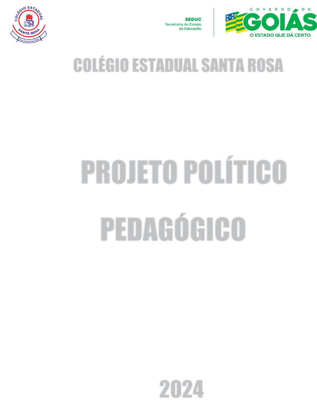 <p>COLÉGIO ESTADUAL SANTA ROSA</p><p>Aprovado pela Comunidade Escolar</p><p>Ata nº 0 Folha (s) nº</p><p>Data: / 0 /202</p><p>1</p><p>COLÉGIO ESTADUAL SANTA ROSA</p><p>PROJETO POLÍTICO</p><p>PEDAGÓGICO</p><p>2024</p><p>COLÉGIO ESTADUAL SANTA ROSA</p><p>Aprovado pela Comunidade Escolar</p><p>Ata nº 0 Folha (s) nº</p><p>Data: / 0 /202</p><p>2</p><p>COLÉGIO ESTADUAL SANTA ROSA</p><p>PROJETO POLÍTICO PEDAGÓGICO</p><p> ENSINO FUNDAMENTAL II</p><p> ENSINO MÉDIO</p><p>SANTA ROSA DE GOIÁS</p><p>2024</p><p>COLÉGIO ESTADUAL SANTA ROSA</p><p>Aprovado pela Comunidade Escolar</p><p>Ata nº 0 Folha (s) nº</p><p>Data: / 0 /202</p><p>3</p><p>O verdadeiro educador não se vê como colaborador de uma gestão</p><p>escolar, mas como professor de uma escola que pensa o seu projeto</p><p>político pedagógico com o foco no aluno e não nos interesses políticos</p><p>de um sistema que mantém a rede de ensino, a qual pertence.</p><p>Joseni Caminha</p><p>COLÉGIO ESTADUAL SANTA ROSA</p><p>Aprovado pela Comunidade Escolar</p><p>Ata nº 0 Folha (s) nº</p><p>Data: / 0 /202</p><p>4</p><p>Sumário</p><p>1 - IDENTIFICAÇÃO INSTITUCIONAL ........................................................................................................... 7</p><p>2 - INTRODUÇÃO....................................................................................................................................... 8</p><p>3- CARACTERIZAÇÃO GERAL DA INSTITUIÇÃO .......................................................................................... 10</p><p>3.1 - Descrições do Contexto Regional ..................................................................................................... 10</p><p>3.2- Histórico da Unidade Educacional .................................................................................................... 11</p><p>3.3- Organização do Espaço Físico e Recursos Mobiliários e Didáticos ...................................................... 14</p><p>3.3.1- Biblioteca ...................................................................................................................................... 14</p><p>3.3.2– Secretaria ..................................................................................................................................... 14</p><p>3.3.3 - Cantina ........................................................................................................................................ 14</p><p>3.3.4–Salas de aula climatizadas.............................................................................................................. 14</p><p>3.3.5 – Sala dos professores .................................................................................................................... 14</p><p>3.3.6 – Sala da Coordenação ................................................................................................................... 14</p><p>3.3.7 – Sala da Direção ............................................................................................................................ 14</p><p>3.3.8– Sanitários ..................................................................................................................................... 14</p><p>3.3.9 – Pátios cobertos............................................................................................................................ 15</p><p>3.3.10 – Quadra descoberta .................................................................................................................... 15</p><p>4 - RECURSOS FINANCEIROS .................................................................................................................. 15</p><p>5 - CARACTERIZAÇÃO DOS ELEMENTOS HUMANOS ................................................................................. 16</p><p>6- MARCO REFERENCIAL ......................................................................................................................... 18</p><p>6.1 – Situação/Diagnóstico ...................................................................................................................... 18</p><p>6.2– Marco Conceitual ............................................................................................................................ 33</p><p>6.2.1 – Missão, visão e valores ................................................................................................................ 33</p><p>6.2.2 – Objetivo Geral ............................................................................................................................. 34</p><p>6.2.3 - Objetivos Específicos .................................................................................................................... 34</p><p>6.2.4 – Princípios Norteadores (VISÃO FILOSÓFICA) ................................................................................. 34</p><p>COLÉGIO ESTADUAL SANTA ROSA</p><p>Aprovado pela Comunidade Escolar</p><p>Ata nº 0 Folha (s) nº</p><p>Data: / 0 /202</p><p>5</p><p>6.2.5 – Gestão Democrática .................................................................................................................... 36</p><p>6.3 – Marco Operacioanal ....................................................................................................................... 36</p><p>6.3.1 – Organização Curricular ................................................................................................................ 36</p><p>6.3.2 – Ensino para a Diversidade ............................................................................................................ 37</p><p>6.3.3 – Sistemática de Planejamentos ..................................................................................................... 37</p><p>6.3.4 - Reuniões Pedagógicas .........................................................................................