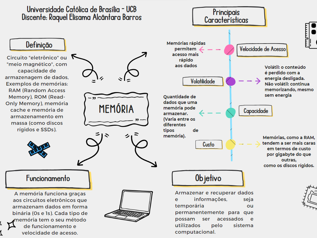 <p>Universidade Católica de - UCB Principais Discente: Raquel Elisama Alcântara Barros Características Definição rápidas permitem Velocidade de Acesso acesso mais Circuito "eletrônico" ou rápido "meio magnético", com aos dados conteúdo capacidade de é perdido com a armazenagem de dados, = Volatilidade energia desligada. Exemplos de Não volátil: continua RAM (Random Access memorizando, mesmo Memory), ROM (Read- Quantidade de sem energia " Only memória dados que uma cache e memória de memória pode armazenar. Capacidade armazenamento em (Varia entre os massa (como discos diferentes rígidos e SSDs). tipos de como a RAM, Custo tendem a ser mais caras em termos de custo por gigabyte do que outras, como os discos rígidos. Funcionamento Objetivo A memória funciona graças Armazenar e recuperar dados aos circuitos eletrônicos que e informações, seja armazenam dados em forma temporária ou binária (Os e 1s). Cada tipo de permanentemente para que tem o seu método possam ser acessados e de funcionamento e utilizados pelo sistema velocidade de acesso. computacional.</p>