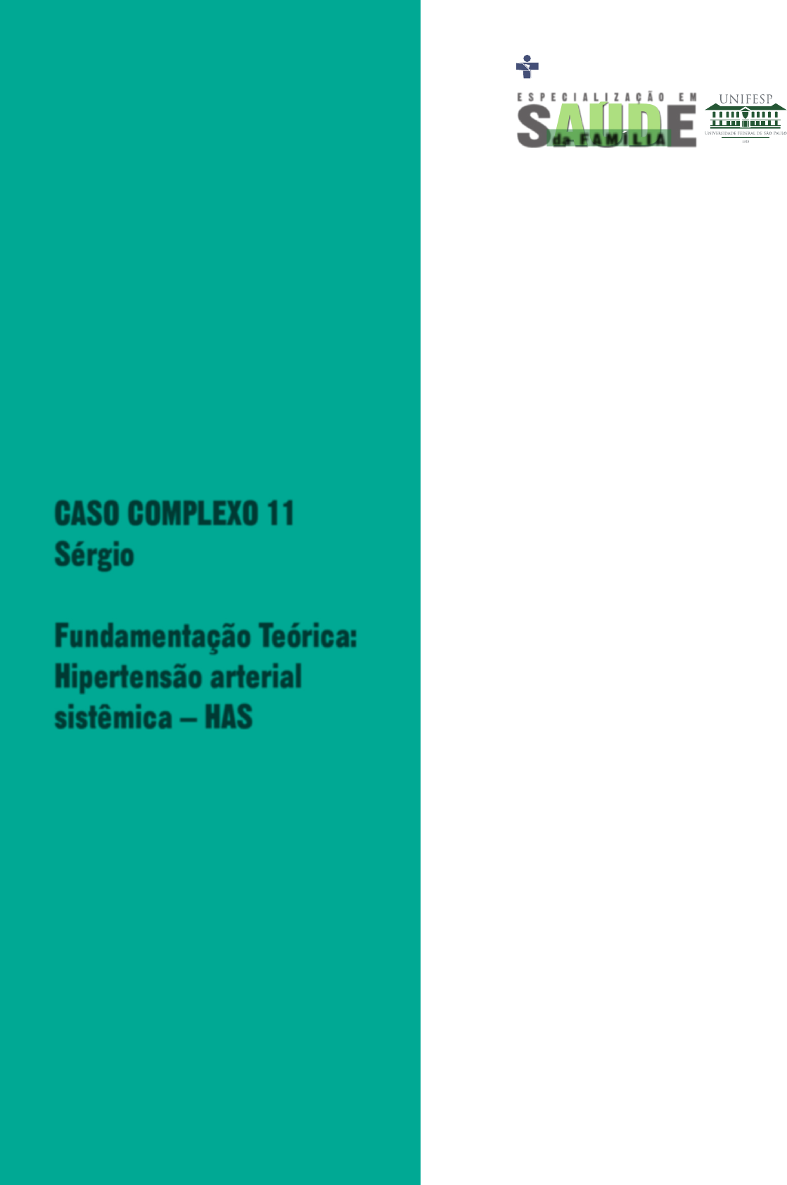 <p>UNA SUSSUS</p><p>Universidade Aberta do SUS</p><p>-</p><p>´SAUDE</p><p>E S P E C I A L I Z A Ç Ã O E M</p><p>´da F A M I L I A</p><p>CASO COMPLEXO 11</p><p>Sérgio</p><p>Fundamentação Teórica:</p><p>Hipertensão arterial</p><p>sistêmica – HAS</p><p>2Fundamentação Teórica</p><p>UNA SUSSUS</p><p>Universidade Aberta do SUS</p><p>-</p><p>´SAUDE</p><p>E S P E C I A L I Z A Ç Ã O E M</p><p>´da F A M I L I A</p><p>Hipertensão arterial sistêmica – HAS</p><p>Caso Complexo 11 - Sérgio</p><p>Hipertensão arterial sistêmica – HAS</p><p>Ricardo Baladi</p><p>Definição</p><p>A hipertensão arterial sistêmica (HAS) é uma condição clínica multifatorial caracterizada por níveis</p><p>elevados e sustentados de pressão arterial (PA). Associa-se frequentemente a alterações funcionais e/ou</p><p>estruturais dos órgãos-alvo (coração, encéfalo, rins e vasos sanguíneos) e a alterações metabólicas, com</p><p>consequente aumento do risco de eventos cardiovasculares fatais e não fatais (VI Diretrizes Brasileiras</p><p>de Hipertensão, 2010).</p><p>Epidemiologia</p><p>A Hipertensão Arterial Sistêmica (HAS) tem alta prevalência e baixas taxas de controle. É considerada</p><p>um dos principais fatores de risco (FR) modificáveis e um dos mais importantes problemas de saúde pública.</p><p>A mortalidade por doença cardiovascular (DCV) aumenta progressivamente com a elevação da PA a partir</p><p>de 115/75 mmHg de forma linear, contínua e independente. Em 2001, cerca de 7,6 milhões de mortes no</p><p>mundo foram atribuídas à elevação da PA (54% por acidente vascular encefálico – AVE e 47% por doença</p><p>isquêmica do coração – DIC), sendo a maioria em países de baixo e médio desenvolvimento econômico</p><p>e mais da metade em indivíduos entre 45 e 69 anos. Em nosso país, as DCV têm sido a principal causa</p><p>de morte. Em 2007 ocorreram 308.466 óbitos por doenças do aparelho circulatório. Entre 1990 a 2006,</p><p>observou-se uma tendência lenta e constante de redução das taxas de mortalidade cardiovascular (VI</p><p>Diretrizes Brasileiras de Hipertensão, 2010).</p><p>Inquéritos populacionais em cidades brasileiras nos últimos 20 anos apontaram uma prevalência de</p><p>HAS acima de 30%. Considerando-se valores de PA ≥ 140/90 mmHg, 22 estudos encontraram prevalências</p><p>entre 22,3% e 43,9% (média de 32,5%), com mais de 50% entre 60 e 69 anos e 75% acima de 70 anos.</p><p>Entre os gêneros, a prevalência foi de 35,8% nos homens e de 30% em mulheres, semelhante à de outros</p><p>países. Revisão sistemática quantitativa de 2003 a 2008, de 44 estudos em 35 países, revelou uma prevalência</p><p>global de 37,8% em homens e 32,1% em mulheres (VI Diretrizes Brasileiras de Hipertensão, 2010).</p><p>No Brasil, 14 estudos populacionais realizados nos últimos 15 anos com 14.783 indivíduos (PA <</p><p>140/90 mmHg) revelaram baixos níveis de controle da PA (19,6%) – (ROSÁRIO et al., 2009; PEREIRA</p><p>et al., 2009).</p><p>Fatores de risco para HAS</p><p>Os principais fatores de risco para HAS são:</p><p>• Idade principalmente acima de 50 anos;</p><p>• Prevalência parecida entre ambos os sexos, sendo mais comum em homens até 50 anos, invertendo</p><p>esta relação nas décadas subsequentes;</p><p>• Indivíduos não brancos;</p><p>• Excesso de peso;</p><p>• Sedentarismo;</p><p>• Ingesta aumentada de sal e álcool;</p><p>• Fatores socioeconômicos e genéticos.</p><p>Prevenção primária da HAS</p><p>1. Medidas não farmacológicas - As principais recomendações não medicamentosas para prevenção</p><p>primária da HAS são: alimentação saudável, consumo controlado de sódio e álcool, ingestão de</p><p>potássio, combate ao sedentarismo e ao tabagismo.</p><p>3Fundamentação Teórica</p><p>UNA SUSSUS</p><p>Universidade Aberta do SUS</p><p>-</p><p>´SAUDE</p><p>E S P E C I A L I Z A Ç Ã O E M</p><p>´da F A M I L I A</p><p>Hipertensão arterial sistêmica – HAS</p><p>Caso Complexo 11 - Sérgio</p><p>2. Medidas farmacológicas - Estudos foram realizados com o objetivo de avaliar a eficácia e a</p><p>segurança de medicamentos na prevenção da HAS. Nos estudos TROPHY (WILLIAMS et al.,</p><p>2008) e PHARAO (LÜDERS et al., 2008), a estratégia medicamentosa foi bem tolerada e preveniu</p><p>o desenvolvimento de HAS em populações jovens de alto risco. Para o manejo de indivíduos com</p><p>comportamento limítrofe da PA, recomenda-se considerar o tratamento medicamentoso apenas</p><p>em condições de risco cardiovascular global alto ou muito alto. Até o presente, nenhum estudo já</p><p>realizado tem poder suficiente para indicar um tratamento medicamentoso para indivíduos com</p><p>PA limítrofe sem evidências de doença cardiovascular</p><p>Diagnóstico e classificação da HAS</p><p>A medida de pressão arterial é fundamental no diagnóstico da hipertensão arterial sistêmica, devendo</p><p>ser realizada em toda avaliação médica ou por outros profissionais da saúde.</p><p>Os procedimentos de medida da pressão arterial são simples e de fácil realização, contudo nem</p><p>sempre são realizados de forma adequada. Condutas que podem evitar erros são, por exemplo, o preparo</p><p>apropriado do paciente e o uso de técnica padronizada e equipamento calibrado. Na primeira avaliação, as</p><p>medidas devem ser obtidas em ambos os braços e, em caso de diferença, deve-se utilizar como referência</p><p>sempre o braço com o maior valor para as medidas subsequentes. O indivíduo deverá ser investigado para</p><p>doenças arteriais se apresentar diferenças de pressão entre os membros superiores maiores de 20/10 mmHg</p><p>para as pressões sistólica/diastólica respectivamente (VI Diretrizes Brasileiras de Hipertensão, 2010).</p><p>Em cada consulta deverão ser realizadas pelo menos três medidas: sugere-se o intervalo de um minuto</p><p>entre elas, embora esse aspecto seja controver