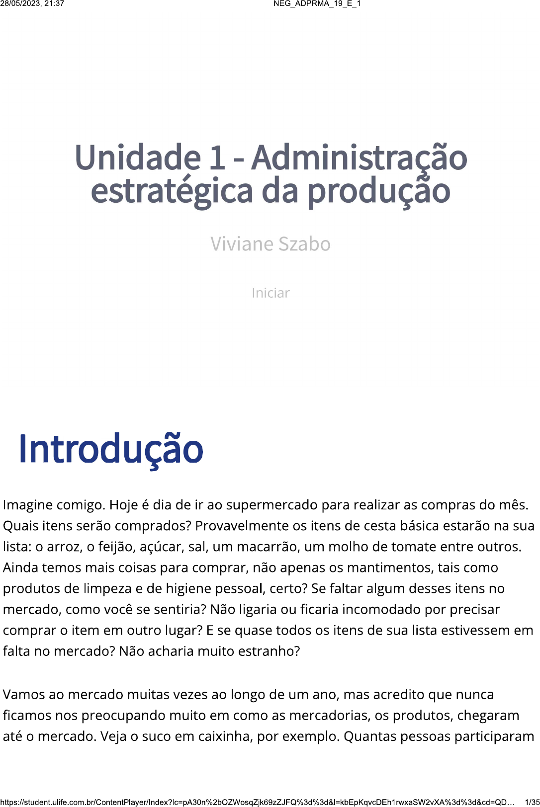 <p>28/05/2023, 21:37 Unidade 1 - Administração estratégica da produção Viviane Szabo Iniciar Introdução Imagine comigo. Hoje é dia de ir ao supermercado para realizar as compras do mês. Quais itens serão comprados? Provavelmente os itens de cesta básica estarão na sua lista: o arroz, o feijão, açúcar, sal, um macarrão, um molho de tomate entre outros. Ainda temos mais coisas para comprar, não apenas os mantimentos, tais como produtos de limpeza e de higiene pessoal, certo? Se faltar algum desses itens no mercado, como você se sentiria? Não ligaria ou ficaria incomodado por precisar comprar o item em outro lugar? E se quase todos os itens de sua lista estivessem em falta no mercado? Não acharia muito estranho? Vamos ao mercado muitas vezes ao longo de um ano, mas acredito que nunca ficamos nos preocupando muito em como as mercadorias, os produtos, chegaram até o mercado. Veja o suco em caixinha, por exemplo. Quantas pessoas participaram 1/35</p><p>28/05/2023, 21:37 NEG_ADPRMA_19_E_1 do processo produtivo até chegar ao mercado para você comprar? Já parou para analisar? Estamos falando, portanto, de um longo processo produtivo, de uma longa cadeia de abastecimento. Podemos começar nossa cadeia com o cliente, mas em que ponto a finalizaremos? Veja, o cliente depende de um revendedor (um mercado, por exemplo). O mercado, por sua vez, depende que os sucos sejam entregues pela distribuidora (Centros de Distribuição - CD). A fábrica será responsável por fabricar o suco e transportá-los até um CD. A fábrica, por sua vez, depende de seus fornecedores de suco e polpa de fruta, fornecedores de embalagens entre outros. Mas ainda não podemos esquecer que os fornecedores diretos também têm os seus respectivos fornecedores. Você quer ver? A fábrica Del Valle da Coca-Cola disponibilizou uma série de vídeos que mostra processo de fabricação de sucos em caixinha. No primeiro episódio conheceremos onde tudo começa ( https://www.youtube.com/watch? v=AlgwkgsaW1c), depois vamos saber como obter o melhor da fruta ( passando por um rigoroso controle de qualidade ( antes mesmo de chegar à fábrica da Coca-Cola para fabricação do produto ( Acho que deu para perceber como uma cadeia de suprimentos,uma cadeia de abastecimento, pode ser bem extensa. Vamos ver? Revendedor Produtor Fábrica de Fábrica de suco Centro de processamento em caixa distribuição (Atacado e Cliente Agrícola Varejista) Figura 1 - Cadeia de suprimentos de suco de fruta em caixa Fonte: Elaborado pelo autor. 2/35</p><p>28/05/2023, 21:37 Reparou quantas pessoas estão envolvidas em todo o processo de fabricação? Sabe por que sempre começamos a cadeia de suprimentos pela figura do cliente? Pois o final da cadeia de suprimentos pode ir ainda mais longe. No início da figura 1 nós temos a figura do produtor agrícola, mas ele também tem seus fornecedores, certo? Ele precisa de fornecedor de sementes assim como de fornecedor de adubo e maquinários. Veja, esses fornecedores também possuem seus fornecedores e assim continuamente. Por este motivo sempre iniciamos a cadeia de suprimentos com o cliente, pois o final dela pode não ser tão claro, pois sempre temos o fornecedor do fornecedor do fornecedor do fornecedor etc. Compreende? Quanto mais você conhecer a sua cadeia de suprimentos e todos os seus envolvidos, melhor poderá ser o seu planejamento! Ainda analisando a figura, podemos encontrar duas fábricas, certo? Será que elas são iguais em termos de classificação, características e estratégia? Na figura 1 nós podemos perceber que precisamos de empresas de distribuição e transporte, atacadistas e varejistas. Isto quer dizer que em uma cadeia de suprimentos nós podemos ter tanto indústrias quanto empresas prestadoras de serviço envolvidas em todo o processo. Mas você sabe qual a diferença entre produção e operações? Nesta unidade nos falaremos sobre todas essas questões! 1. Introdução à administração da produção É comum vermos na literatura uma distinção entre administração da produção e administração de operações. Isto ocorre quando se quer fazer distinção entre indústrias e serviços, entre bens tangíveis e intangíveis. Além da tangibilidade, existem outras diferenças importantes entre produtos e serviços, tal como a influência da mão de obra e possibilidade de padronização de insumos. Em produtos, os processos podem ser mais mecanizados e automatizados, isso facilita a padronização do produto, do insumo e ainda evita muita influência da 3/35</p><p>28/05/2023, 21:37 NEG_ADPRMA_19_E_1 mão de obra. Já em serviços, a influência da mão de obra é muito alta e ainda é difícil obter padronização. Você consegue padronizar, por exemplo, a fabricação de um remédio, certo? Mas seria bem mais difícil padronizar um atendimento médico, não é mesmo? Veja o Quadro 1 abaixo com as principais diferenças entre indústrias e empresas de serviços. Característica Indústrias Empresas de serviços Produto Físico Intangível Estoques Comuns Impossível Padronização dos insumos Comum Difícil Influencia da mão de obra Média/Pequena Grande Padronização dos produtos Comum Difícil Quadro 1 - Diferenças entre bens e serviços Fonte: Moreira (2011, p. 3) No entanto, independente de se é indústria ou serviços, qual é a função da administração da produção/operação dentro de uma empresa? Moreira (2011, p.3) diz que a "administração da produção e operações é campo de estudo dos conceitos e técnicas aplicáveis à tomada de decisões". O que isto quer dizer? Para entender melhor, precisamos primeiro lembrar que é uma empresa e quais são as funções importantes dentro dela. Sabemos que uma organização é um arranjo de duas ou mais pessoas que se juntam formalmente e compartilham um propósito comum. Este propósito é a meta formal da empresa. O que ela pretende oferecer aos seus clientes. Para esta organização poder fun