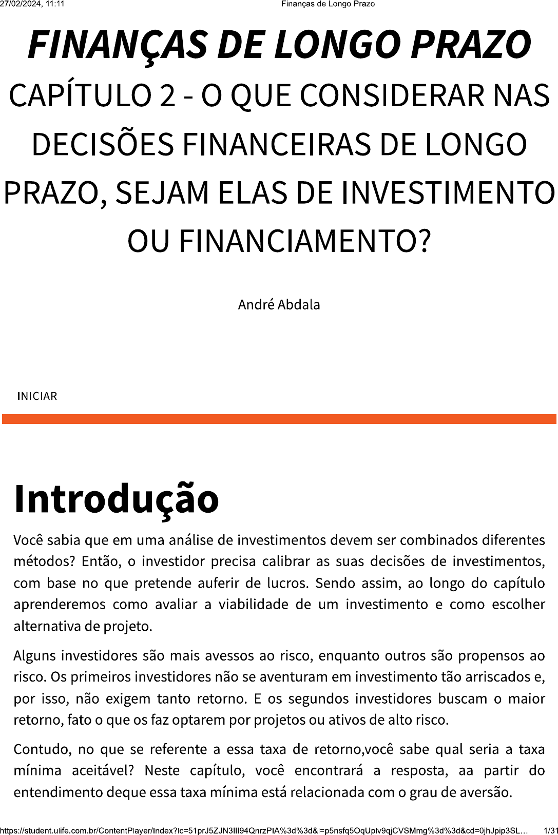 <p>27/02/2024, 11:11 Finanças de Longo Prazo FINANÇAS DE LONGO PRAZO CAPÍTULO 2 - O QUE CONSIDERAR NAS DECISÕES FINANCEIRAS DE LONGO PRAZO, SEJAM ELAS DE INVESTIMENTO FINANCIAMENTO? André Abdala INICIAR Introdução Você sabia que em uma análise de investimentos devem ser combinados diferentes métodos? Então, o investidor precisa calibrar as suas decisões de investimentos, com base no que pretende auferir de lucros. Sendo assim, ao longo do capítulo aprenderemos como avaliar a viabilidade de um investimento e como escolher alternativa de projeto. Alguns investidores são mais avessos ao risco, enquanto outros são propensos ao risco. Os primeiros investidores não se aventuram em investimento tão arriscados e, por isso, não exigem tanto retorno. E os segundos investidores buscam o maior retorno, fato o que os faz optarem por projetos ou ativos de alto risco. Contudo, no que se referente a essa taxa de retorno,você sabe qual seria a taxa mínima aceitável? Neste capítulo, você encontrará a resposta, aa partir do entendimento deque essa taxa mínima está relacionada com o grau de aversão. 1/31</p><p>27/02/2024, 11:11 Finanças de Longo Prazo E você sabia que existe um tipo de custo que avalia a estrutura de capital? Estamos falando do Custo Médio Ponderado do Capital, cuja análise rodeia a participação dos capitais próprio e de terceiros em uma empresa. Dessa forma, neste estudo você verá que a participação de capitais de terceiros em uma firma traz benefícios; no entanto, por outro lado, se o nível de endividamento não for bem calibrado, pode causar efeitos nocivos.Pesquisas empíricas apontam uma relação positiva entre endividamento e crescimento da firma. No entanto, tais estudos também chamam a atenção para o problema do endividamento nas decisões dos investidores. Com base no conhecimento desses conceitos, ao concluir a leitura do capítulo você será capaz de aplicar os métodos adequados aos projetos de investimento e/ou financiamento, tomando decisões que beneficiem sua empresa. Bom estudo! 2.1 Análise comparativa dos métodos para um único projeto Muitas vezes escutamos que um projeto é válido quando gera lucro. E que lucro é receita das vendas menos os custos de produção. E isso é verdade. Mas essa informação, por si só, não é suficiente para a análise da viabilidade de um projeto de investimento, tendo em vista que precisamos avaliar a capacidade desse projeto de gerar lucro. Por isso, métodos como o payback descontado, o Valor Presente Líquido (VPL), a Taxa Internade Retorno (TIR) e o Índice de Lucratividade (IL) permitem trazer a compreensão de como se comportará certo investimento, sob a análise de retornos esperados, muitos dos quais são avaliados com base em valores já observados. Dessa forma, o analista de mercado pode mitigar os riscos utilizando o instrumental de análise de investimentos. 2.1.1 Os diferentes métodos comparados Você já sabe que os métodos de análise são importantes ferramentas na tomada de decisões financeiras, uma vez que permitem a identificaçãodos projetos com potencialidade de lucro. Além disso, fornecem informações sobre o retorno que se 2/31</p><p>27/02/2024, 11:11 Finanças de Longo Prazo espera do investimento, possibilitando a redução de riscos. Contudo, para definir o método a ser considerado na tomada de decisão, inicialmente é preciso: conhecer os diversos métodos de análise de investimentos e identificar suas diferenças; elaborar análises de investimentos específicas utilizando cada um dos métodos; comparar os resultados obtidos com a aplicação de cada método nas respectivas análises. Na sequência, detalharemos os principais métodosa partir de uma abordagem comparativa. Acompanhe! O Valor Presente Líquido (VPL) mira quantificar, em termos absolutos, o valor presente referente aos resultados de eventos futuros de um investimento.Dessa forma, avalia os fluxos de caixa gerados ao longo de um projeto ou investimento, enquanto assim durarem. (ASSAF NETO;LIMA, 2017; ROSS; WESTERFIELD; JAFFE, 2015; SAMANEZ, 2002). Sendo assim, o VPL passa por um processo de desconto, que é converter fluxo de caixas futuros em valores presentes, uma vez que os fluxos de caixa futuros de épocas diferentes não podem ser comparados. Tal comparação só é possível quando esses fluxos de caixa são colocados em uma mesma época, o que é feito pelo processo de desconto. Contudo, o Valor Presente Líquido deve ser superior a zero para que o projeto ou investimento seja viável, quer dizer, , senão, o projeto ou o investimento vai gerar mais custo do que receita. Por consequência, issoimplica que o presente método permite comparar os valores dos diferentes projetos ou investimentos, de modo a escolher o que apresentar o maior VPL (ASSAF NETO; LIMA, 2017; ROSS; WESTERFIELD; JAFFE, 2015; SAMANEZ, 2002). Por sua vez, de acordo com Brito (2011), Ross, Westerfiled e Jaffe (2015) e Samanez (2002), o método Payback Descontado (PBD) objetiva o tempo de recuperação do investimento. Logo, na seção seguinte, desenvolveremos o cálculo do PDB, assim como o VPL, utilizando a técnica Séries Periódicas Uniformes, que você aprenderá para calcular um investimento sob o uso dos diferentes métodos. 3/31</p><p>27/02/2024, 11:11 Finanças de Longo Prazo Diferentemente do VPL, a Taxa Interna de Retorno (TIR) não mira o valor absoluto do retorno de um investimento, mas a taxa intrínseca de um investimento, isto é, a taxa de retorno esperada de um investimento. Portanto, aceitaremos o projeto ou o investimento se a TIR for maior do que a taxa de desconto ou o custo de capital. Com isso, se a TIR for maior do que o custo de capital, então o investimento é viável (ASSAF NETO; LIMA, 2017; BRITO, 2011; ROSS; WESTERFIELD; JAFFE, 2015; SAMANEZ, 2002). Todavia, ao optarmos entre uma alternativa de projeto e outra alternativa, em situações que as alternativas são mutuamente exclusivas
