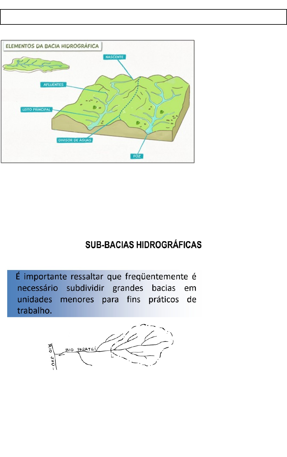 <p>BACIA HIDROGRÁFICA- aula I</p><p>Foz ou embocadura: final da bacia e local onde água desagua no mar</p><p>Divisor de águas: área mais elevada do relevo com montanhas ou planícies que divide os rios.</p><p>Rio ou leito principal</p><p>Afluentes: curso de água que alimenta rio principal</p><p>Subafluentes: cursos de água menores</p><p>*nunca deve cortar…. esqueci o nome gente!!</p><p>CLASSIFICAÇÃO DOS CURSOS D’ÁGUA</p><p>PERENES - contém água durante todo o tempo, o lençol subterrâneo mantém alimentação contínua e não desce nunca abaixo do leito do curso d’água, mesmo durante as secas mais severas;</p><p>INTERMITENTES - escoam nas estações de chuva e secam nas de estiagem. Na época de estiagem o lençol encontra-se abaixo do leito;</p><p>EFÊMEROS - existem apenas durante ou imediatamente após os períodos de precipitação e só transportam escoamento superficial, não há possibilidade de escoamento subterrâneo.</p><p>FATORES FÍSICOS</p><p>DIVISOR DE ÁGUA:</p><p>FORMA DA BACIA influência maior potencialidade de produção de picos de enchentes elevados.</p><p>A</p><p>a que tem mais capacidade de encher</p><p>rapidamente a figura da esquerda(A)</p><p>USO DO SOLO:</p><p>O QUE MAIS…</p><p>Terraço uma área contínua que diminui a velocidade de escoamento da água superficial</p><p>Dique diminui o impacto e</p><p>Em qualquer bacia as características do escoamento superficial são influenciadas pelo tipo predominante de solo, devido à capacidade de infiltração dos diferentes solos, que por sua vez é resultado do tamanho dos grãos do solo etc</p><p>microporos: armazenam/retém água</p><p>macroporos: espaços maiores por onde a água percola</p><p>exutório é a parte final de uma bacia hidrográfica</p><p>1+1=2</p><p>2+2=3</p><p>3+3=4</p><p>PRECIPITAÇÃO- aula II</p><p>INFILTRAÇÃO - aula III</p><p>1. FATORES QUE INFLUENCIAM</p><p>→ classe do solo</p><p>→ condições de superfície (selamento, compactação, cobertura etc..)</p><p>→ homogeneidade do solo</p><p>→ teor de água no perfil do solo = umidade antecedente</p><p>→ extrínsecos ao solo – precipitação</p><p>Quanto maior a taxa de infiltração, menor será o nível de erosão do solo</p><p>2. ZONAS DE INFILTRAÇÃO</p><p>A) SATURAÇÃO: 1,5 cm de comprimento e está completamente preenchida por água → todos os poros preenchidos</p><p>B) TRANSIÇÃO: 5 cm de comprimento e muda de umidade bruscamente → mais úmida que a de transmissão</p><p>C) TRANSMISSÃO: quantidade do perfil disponível para transmitir água (estrutura mutável) → depende da carga hidráulica</p><p>D) UMEDECIMENTO: está em contato direto com a frente de umedecimento, limite claro entre a zona que possui água e a que ainda está seca;</p><p>E) FRENTE DE UMEDECIMENTO</p><p>3. GRANDEZAS</p><p>4. CAPACIDADE DE INFILTRAÇÃO X TAXA DE INFILTRAÇÃO</p><p>5. DETERMINAÇÃO DE INFILTRAÇÃO</p><p>ESCOAMENTO SUPERFICIAL- aula VI</p><p>escoamento superficial</p><p>· fase do ciclo hidrológico de maior importância para o manejo e conservação do solo</p><p>Definição: deslocamento de parte da água decorrente de precipitação, que ocorre na superfície do solo. → ocorrência e transporte da água na superfície terrestre</p><p>· capacidade de infiltração do solo é excedida, por este motivo não consegue absorver mais água</p><p>· excesso de precipitação que ocorre após chuva intensa</p><p>· com alta atividade erosiva no solo</p><p>· parte da chuva é interceptada pela vegetação, mas outra parte pode tanto evaporar, quanto escoar livremente no solo (em casos em que não ocorre interceptação por parte da vegetação ou o solo não consegue absorver mais nada)</p><p>1. COMPONENTES DE ESCOAMENTO</p><p>· escoamento superficial ocorre devido a intensas precipitações que acabam por exceder a capacidade de infiltração do solo, assume papel importante no que diz respeito ao transporte de sedimentos e inundações durante as “enxurradas” → componente mais importante, devido a sua alta capacidade erosiva no solo → lâmina d’água superficial que vai se acumulando → rápido</p><p>· escoamento hipodérmico água infiltrada que torna a aparecer na superfície, uma vez que, ocorre em uma camada de solo saturada → água infiltrada atinge porção de menor permeabilidade do solo → escoamento paralelo a superfície do solo</p><p>· escoamento subterrâneo ou de base água que percola profundamente até atingir o lençol freático → de caráter lento garantindo a perenidade de cursos d’água → reflete a capacidade de armazenamento de água da BH e de manutenção do escoamento durante períodos de estiagem</p><p>2. FATORES QUE INFLUENCIAM O ESCOAMENTO SUPERFICIAL</p><p>Podem ser de natureza climática ou fisiográfica atrelado às características físicas da BH</p><p>A) CLIMÁTICO: intensidade e duração da precipitação, são dois fatores fundamentais, uma vez que quanto maior a intensidade mais rápido o solo vai atingir sua capacidade de infiltração → DURAÇÃO DIRETAMENTE PROPORCIONAL AO ESCOAMENTO → precipitação antecedente se a chuva ocorre quando o solo já está úmido devido a chuva anterior, não irá reter tanta água</p><p>B) FISIOGRÁFICA: área, forma, permeabilidade, capacidade de infiltração e topografia da BH</p><p>3. HIDROGRAMA</p><p>É a representação gráfica da variação da vazão em relação ao tempo → escoamento em uma linha temporal → pode-se analisar certos fenômenos, como permeabilidade e infiltração do solo e até mesmo contribuição ou não do lençol freático</p><p>→ método CN (número da curva) é utilizado para estimar o volume de escoamento superficial resultante da chuva</p><p>image1.png</p><p>image16.png</p><p>image2.png</p><p>image4.png</p><p>image8.png</p><p>image5.png</p><p>image13.png</p><p>image15.png</p><p>image6.png</p><p>image7.png</p><p>image9.png</p><p>image3.png</p><p>image14.png</p><p>image12.png</p><p>