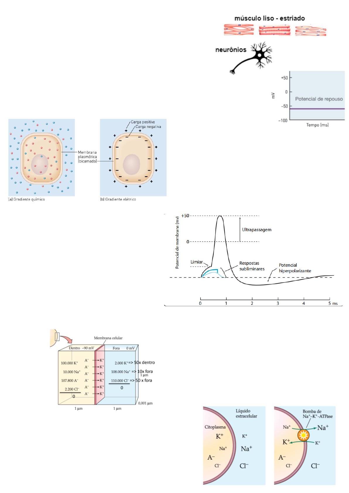 <p>PROPRIEDADES GERAIS DAS CÉLULAS EXCITÁVEIS</p><p>O que são células excitáveis?</p><p>É a capacidade de gerar e transmitir impulsos eletroquímicos nas</p><p>suas membranas, em resposta a estímulos externos e internos</p><p>interceptados por ela. Por este motivo, desempenham papel ativo</p><p>em processos de alteração de potenciais de membrana.</p><p>Como ocorrem os impulsos eletroquímicos?</p><p>Quando a célula excitável é estimulada, produz um potencial de ação, que ocorre</p><p>devido a alteração no potencial de membrana (mudança momentânea na carga</p><p>elétrica da membrana) em resposta a um sinal de entrada.</p><p>→ comunicação celular</p><p>Potencial de membrana em repouso?</p><p>Energia potencial resultante da diferença entre as</p><p>concentrações iônicas nas duas faces da célula (interna</p><p>e externa), quando não está em atividade.</p><p>➔ diferença na voltagem entre o lado de dentro e fora</p><p>da membrana.</p><p>➔ dentro da membrana é mais eletronegativo quando</p><p>em repouso.</p><p>➔ no interior da célula tem mais K+ e no exterior Na+</p><p>Potencial de ação?</p><p>Quando o estímulo proferido pela célula tem</p><p>capacidade suficiente para atingir o limiar, gerando</p><p>uma despolarização da membrana com a abertura de</p><p>canais iônicos (voltagem dependente), ou seja,</p><p>provoca uma mudança momentânea na carga</p><p>elétrica.</p><p>➔ canais dependentes de voltagem estão</p><p>fechados na membrana em repouso, desta</p><p>forma só abrem quando a despolarização</p><p>atinge o limiar.</p><p>➔ permite o fluxo iônico (Na+).</p><p>➔ não perde sua amplitude à medida que é conduzido e por conta disso, consegue percorrer longas</p><p>distâncias.</p><p>Estabelecimento do potencial de membrana?</p><p>Vai depender da permeabilidade seletiva aos íons, desta</p><p>forma apresentam maior facilidade para passarem pela</p><p>membrana plasmática.</p><p>➔ principais íons para estabilidade celular: Na+ e K+</p><p>➔ íons com cargas não se misturam com os lipídios de</p><p>cargas não polares, por este motivo precisam da</p><p>abertura dos canais iônicos.</p><p>Permeabilidade da membrana plasmática?</p><p>Em repouso é mais permeável ao K+, mais ou menos ao cloreto</p><p>e quase inexistente ao Na+.</p><p>➔ canais de vazamento (passivo) de Na+ para dentro da</p><p>célula, canais iônicos parcialmente abertos (repouso), desta</p><p>forma não necessitam de estímulo para abrirem e liberarem o</p><p>fluxo iônico.</p><p>Bomba de sódio e potássio (Na+–K+–ATPase)?</p><p>➔ vai estabelecer uma compensação aos canais</p><p>de vazamento (Na+) e fluxo facilitado de de K+.</p><p>➔ transfere íons contra seu gradiente de</p><p>concentração.</p><p>➔ como fazem isso? para cada 2 íons de K+</p><p>transferidos para dentro da célula, 3 íons de</p><p>Na+ são colocados para fora.</p><p>Variação no potencial de membrana? alteração na</p><p>permeabilidade da membrana.</p><p>1) DESPOLARIZAÇÃO: inversão da</p><p>polaridade da membrana, internamente</p><p>ficando mais positivo com a entrada de Na+</p><p>na célula. O meio extracelular, torna-se mais</p><p>negativo à medida que isso ocorre.</p><p>➔ canais rapidamente se fecham, o tempo de duração da abertura é proporcional a intensidade e</p><p>duração do estímulo.</p><p>➔ após a abertura dos canais, leva certo tempo para que possa ser reaberto novamente.</p><p>2) REPOLARIZAÇÃO: retorno do interior da célula para o seu potencial de</p><p>repouso, contudo não ocorre com a saída do Na+ que entrou, mas sim com a</p><p>saída do K+ para o meio extracelular. Isso ocorre porque o gradiente</p><p>eletroquímico do K+ aumenta, o fazendo sair.</p><p>➔ ação da bomba de sódio e potássio para igualar tudo novamente.</p><p>3) HIPERPOLARIZAÇÃO: quando o potencial de</p><p>membrana no interior da célula, torna-se mais</p><p>negativo do que normalmente já é. Ocorre, pois</p><p>canais de K+ demoram a fechar, provocando um</p><p>exagero na repolarização da membrana.</p><p>➔ saída de tanta carga positiva, que dentro fica mais</p><p>negativo – transitoriamente.</p><p>Período refratário da membrana?</p><p>momento em que a célula não</p><p>responde a estímulos, pois os</p><p>canais estão voltando a sua</p><p>configuração habitual.</p><p>1) Período refratário absoluto: canais de Na+ dependentes de voltagem estão temporariamente</p><p>inativos, não sendo possível disparar nenhum tipo de potencial de ação.</p><p>2) Período refratário relativo: os canais de Na+ também estão fechados, contudo com um estímulo intenso o</p><p>suficiente para atingir um novo limiar, sendo possível superar a resistência da membrana.</p><p>Potencial graduado? variação no potencial de</p><p>membrana com amplitude variável e que percorrem</p><p>distâncias curtas, pois vão perdendo sua intensidade à</p><p>medida que se afasta dos canais iônicos. (ocorre antes</p><p>do potencial de ação).</p><p>➔ gerado nos dendritos e corpo celular (cone do axônio).</p><p>➔ estímulos curtos e repetidos em período de tempo</p><p>relativamente próximo, podem ir se somando e</p><p>desencadear um potencial de ação (temporal e</p><p>espacial).</p><p>Unidade funcional do SN?</p><p>É o neurônio, responsável por auxiliar as células</p><p>nervosas em sua comunicação, ou seja, realizam a</p><p>propagação do impulso nervoso (sinapses).</p><p>➔ função de receber, integrar, conduzir e transmitir o</p><p>sinal.</p><p>Contribuição da bainha de mielina para</p><p>condução do sinal? Aumento da distância intra e</p><p>extracelular, diminuindo a atração entre as cargas</p><p>e aumento da resistência através da membrana,</p><p>correntes locais fluem com maior facilidade.</p><p>➔ massa e o volume do axônio interferem, pois</p><p>quanto maior o diâmetro, maior será a</p><p>velocidade de propagação do sinal nas</p><p>células nervosas (mie