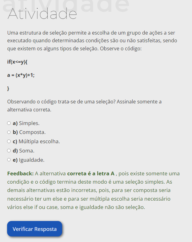 <p>Atividade Uma estrutura de seleção permite a escolha de um grupo de ações a ser executado quando determinadas condições são ou não satisfeitas, sendo que existem os alguns tipos de seleção. Observe código: if(x<=y){ a = (x*y)+1; } Observando o código trata-se de uma seleção? Assinale somente a alternativa correta. a) Simples. b) Composta. c) Múltipla escolha. d) Soma. e) Igualdade. Feedback: A alternativa correta é a letra A , pois existe somente uma condição e código termina deste modo é uma seleção simples. As demais alternativas estão incorretas, pois, para ser composta seria necessário ter um else e para ser múltipla escolha seria necessário vários else if ou case, soma e igualdade não são seleção. Verificar Resposta</p>