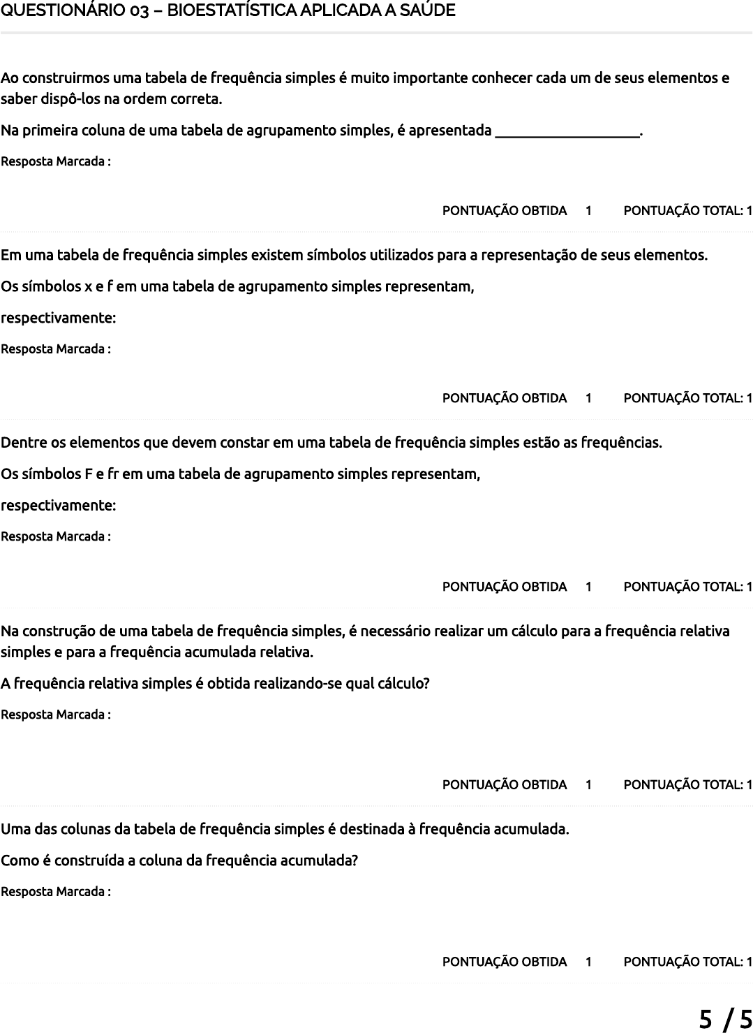 <p>5 / 5</p><p>QUESTIONÁRIO 03 – BIOESTATÍSTICA APLICADA A SAÚDE</p><p>PONTUAÇÃO TOTAL: 1PONTUAÇÃO OBTIDA 1</p><p>Ao construirmos uma tabela de frequência simples é muito importante conhecer cada um de seus elementos e</p><p>saber dispô-los na ordem correta.</p><p>Na primeira coluna de uma tabela de agrupamento simples, é apresentada ____________________.</p><p>Resposta Marcada :</p><p>A variável em estudo.</p><p>PONTUAÇÃO TOTAL: 1PONTUAÇÃO OBTIDA 1</p><p>Em uma tabela de frequência simples existem símbolos utilizados para a representação de seus elementos.</p><p>Os símbolos x e f em uma tabela de agrupamento simples representam,</p><p>respectivamente:</p><p>Resposta Marcada :</p><p>A variável em estudo e frequência absoluta simples.</p><p>PONTUAÇÃO TOTAL: 1PONTUAÇÃO OBTIDA 1</p><p>Dentre os elementos que devem constar em uma tabela de frequência simples estão as frequências.</p><p>Os símbolos F e fr em uma tabela de agrupamento simples representam,</p><p>respectivamente:</p><p>Resposta Marcada :</p><p>A frequência acumulada e frequência relativa.</p><p>PONTUAÇÃO TOTAL: 1PONTUAÇÃO OBTIDA 1</p><p>Na construção de uma tabela de frequência simples, é necessário realizar um cálculo para a frequência relativa</p><p>simples e para a frequência acumulada relativa.</p><p>A frequência relativa simples é obtida realizando-se qual cálculo?</p><p>Resposta Marcada :</p><p>A frequência relativa simples é o percentual de ocorrências do valor x, a proporção em que cada valor ocorre.</p><p>Obtém-se esse valor dividindo-se cada valor de f pelo total de f.</p><p>PONTUAÇÃO TOTAL: 1PONTUAÇÃO OBTIDA 1</p><p>Uma das colunas da tabela de frequência simples é destinada à frequência acumulada.</p><p>Como é construída a coluna da frequência acumulada?</p><p>Resposta Marcada :</p><p>A frequência acumulada indica quantos indivíduos têm frequência igual ou menor do que um determinado valor.</p><p>Obtém-se esse valor somando-se a f da linha desejada com a f dos valores menores do que o desejado.</p><p>Total de Pontos</p>